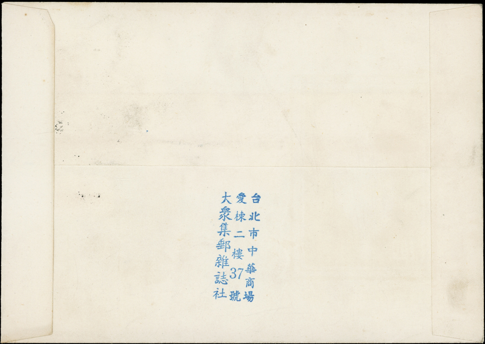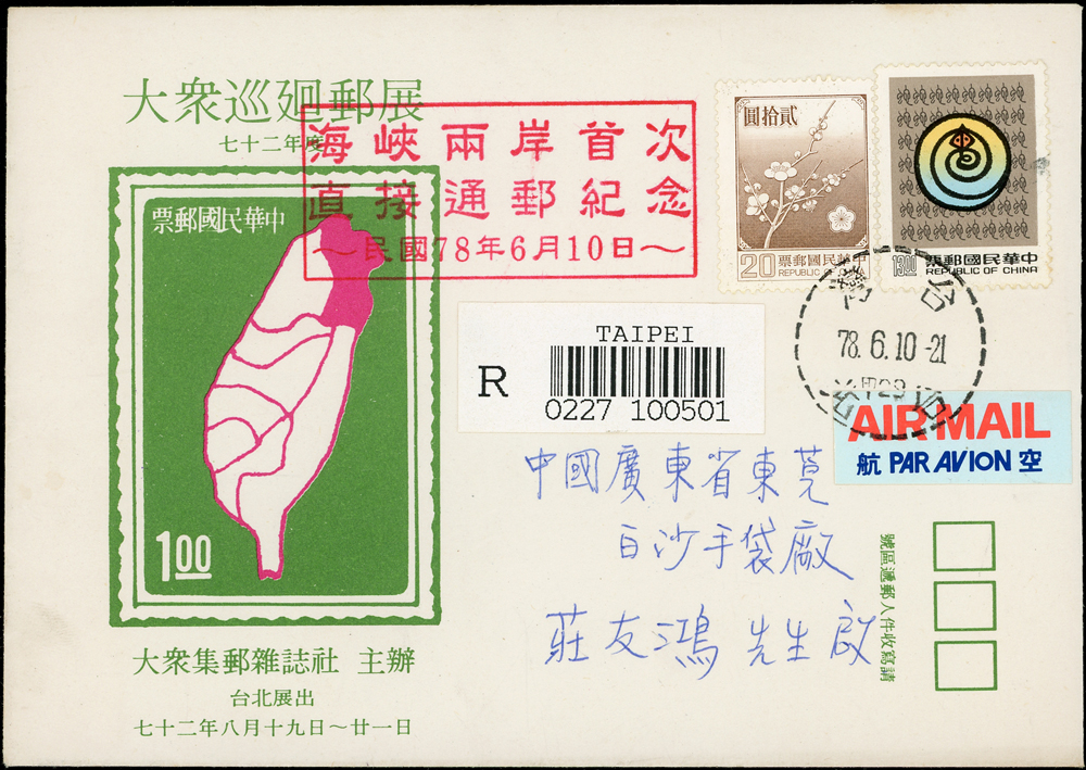 1989年大眾集郵雜誌社封貼國花20元.蛇年13元各1枚,銷台北78.6.10戳航掛寄廣東,旁蓋『海峽兩岸首次直接通郵紀念 民國78年6月10日』首日章 註:1989年行政院大陸工作會報宣佈開放對大陸通話與通郵。臺灣郵政部門開始直接收寄到大陸的航空函件等。(Page 47)