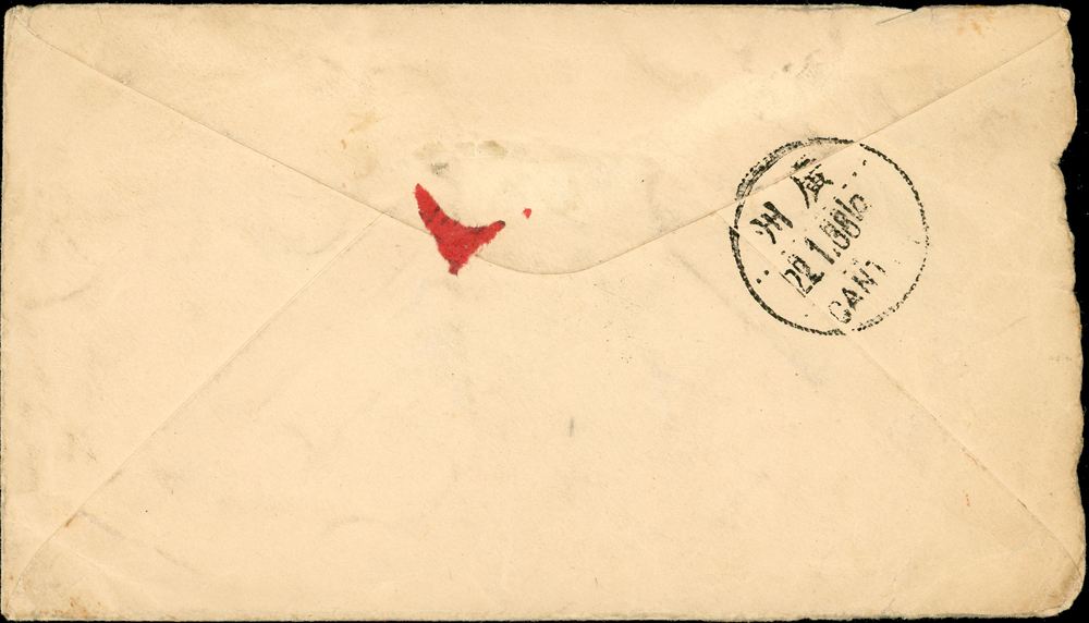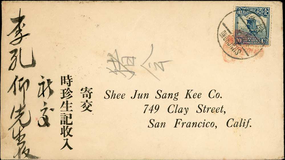 寄美國僑批封二件:(1)1938年西式封貼國父像倫敦一版5分4枚,銷廣東公益埠27.1.21戳,經廣州38.1.22寄美國,封左側缺損;(2)西式封貼帆船1角1枚,銷新昌日期不清,背廣州中轉戳;林茂興舊藏(Page 48)