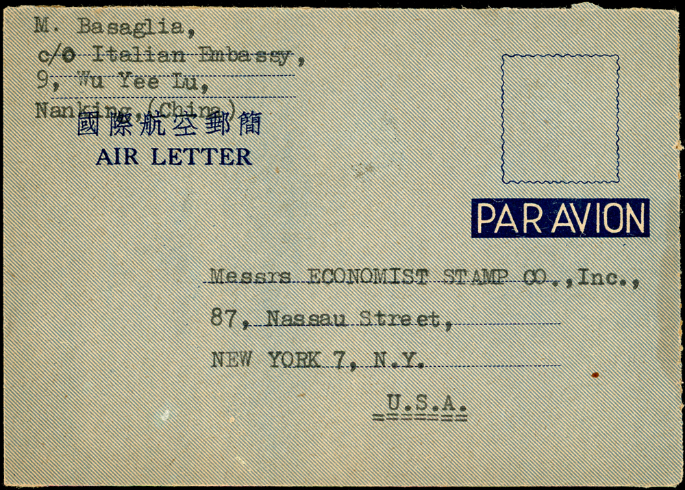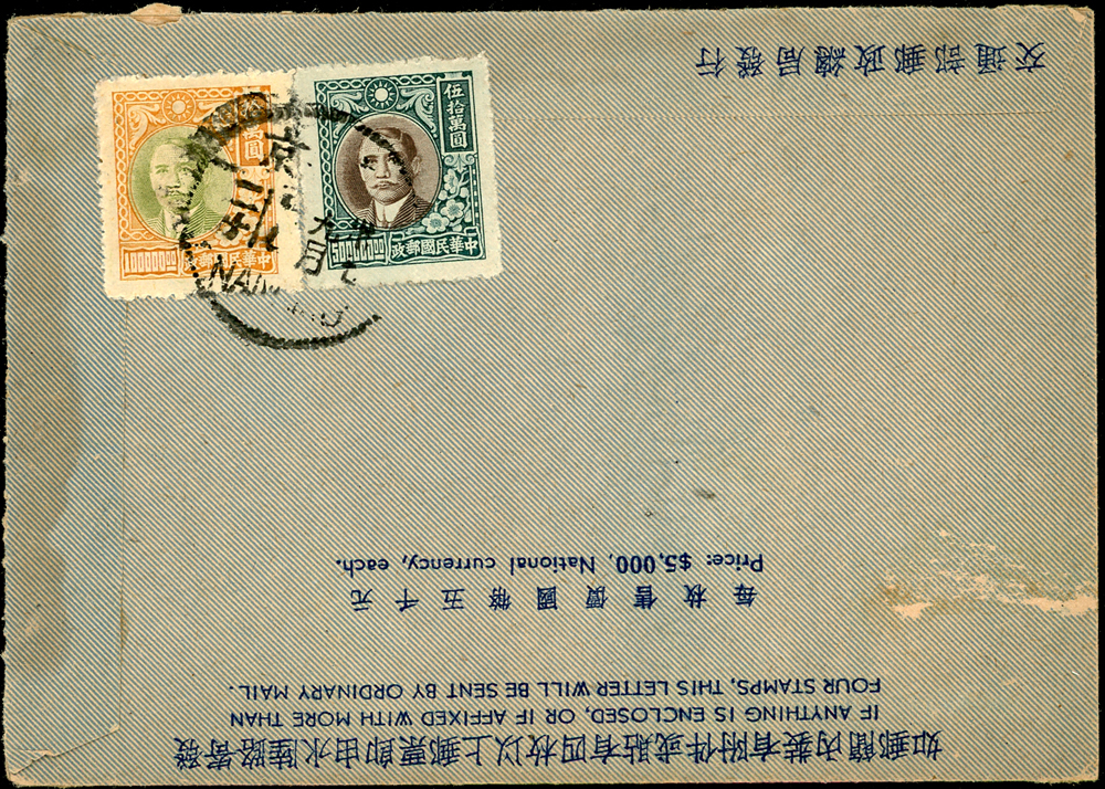 韓目#2.國際航空郵簡自南京寄美國,貼國父像上海大東二版10萬及50元各一枚,計600000元,銷南京卅七.九月卄七;符合1948.8.21-11.5國際航空郵簡郵資(Page 51)