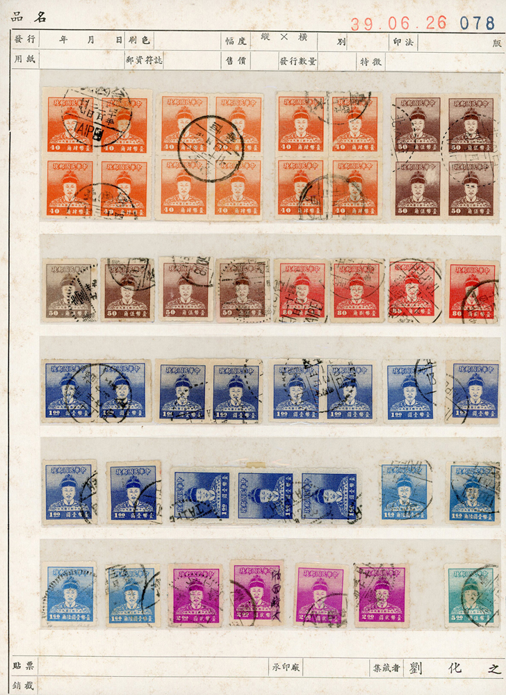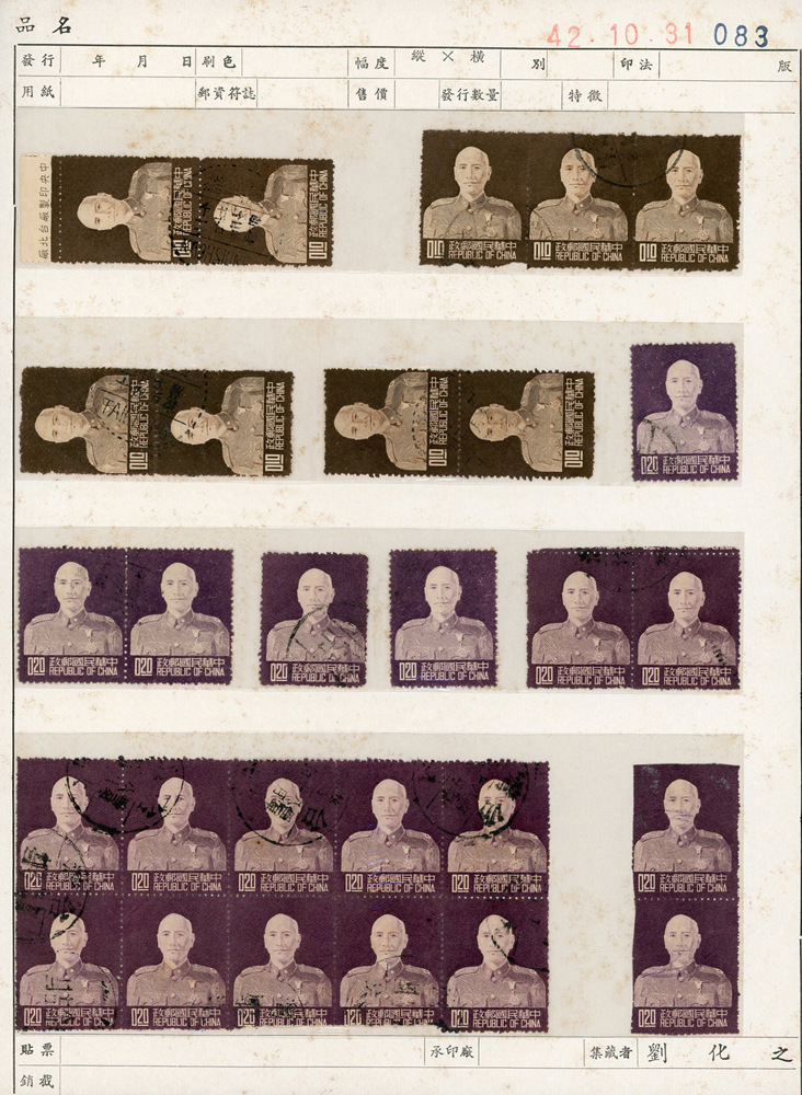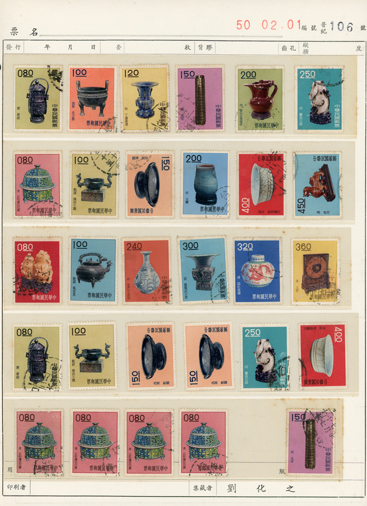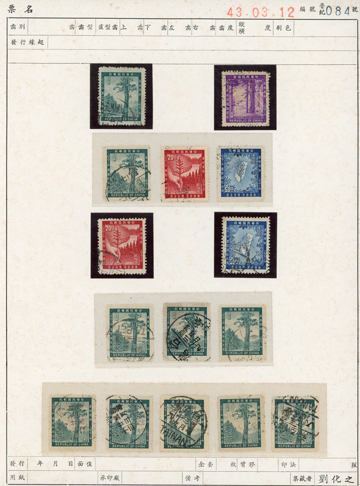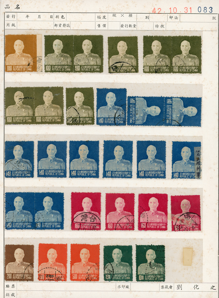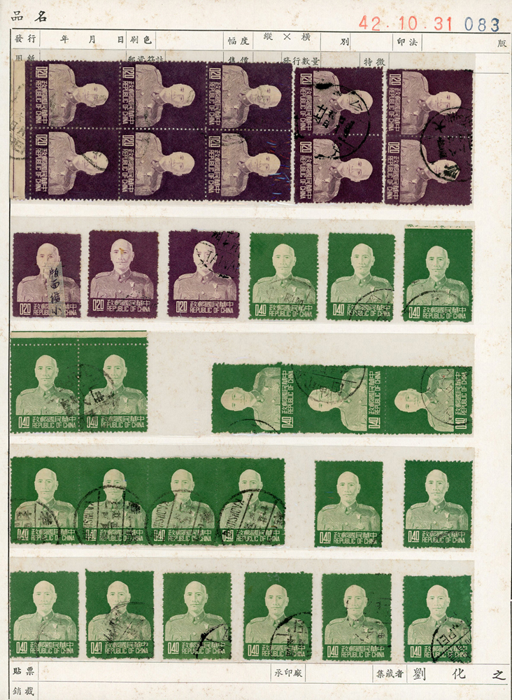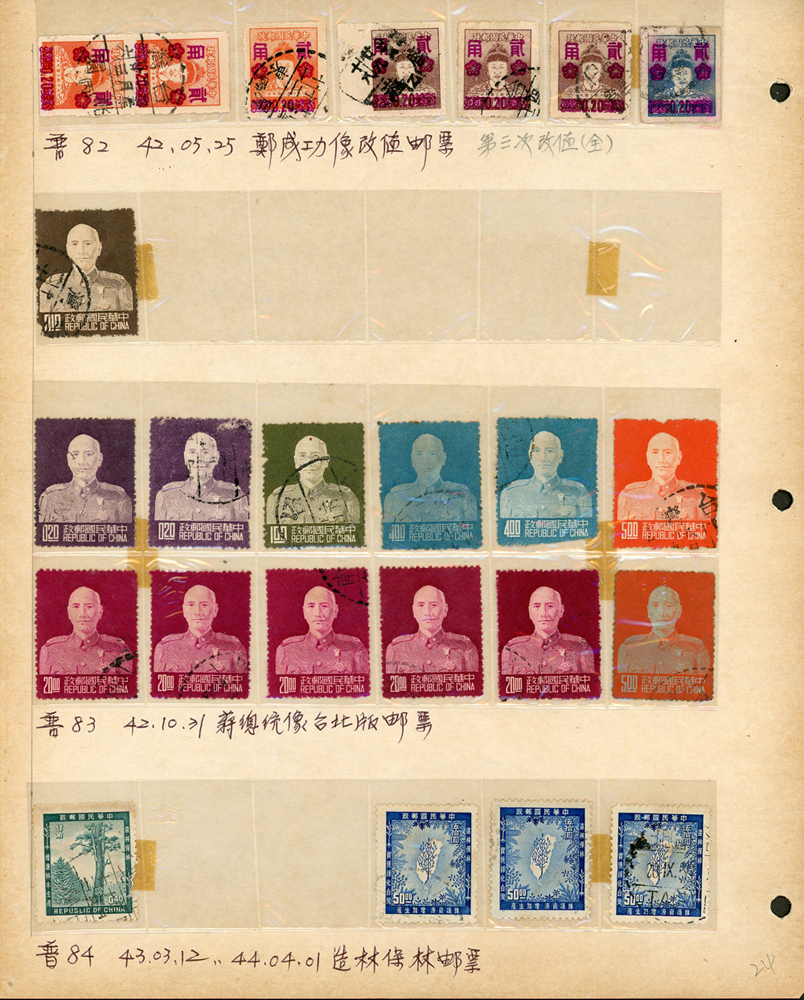 民國時期零散舊票及台灣中早期新舊混合票一冊,含新票156枚,舊票1187枚,整理於冊中,台灣少數舊票成套,包括有:造林保林4全.母教2全.平.凸版地圖12全.臺灣花卉(47年版)4全.玉照閱兵1全.保衛金馬4全.世界通信週4全.國立臺灣科學館2全.民主導師2全.限時專送1全.錄音郵件1全.故宮古畫(一)4全.體育(49年版)6全.郵購服務1全,品像混合,F-VF;歡迎至官網瀏覽全貌;林茂興舊藏(Page 53)