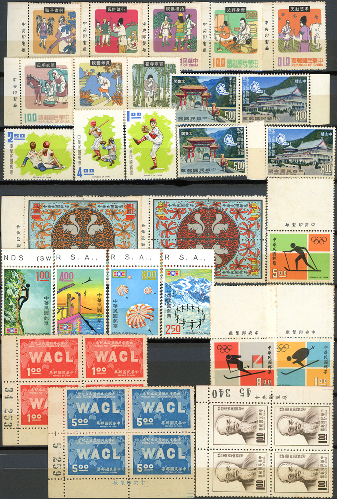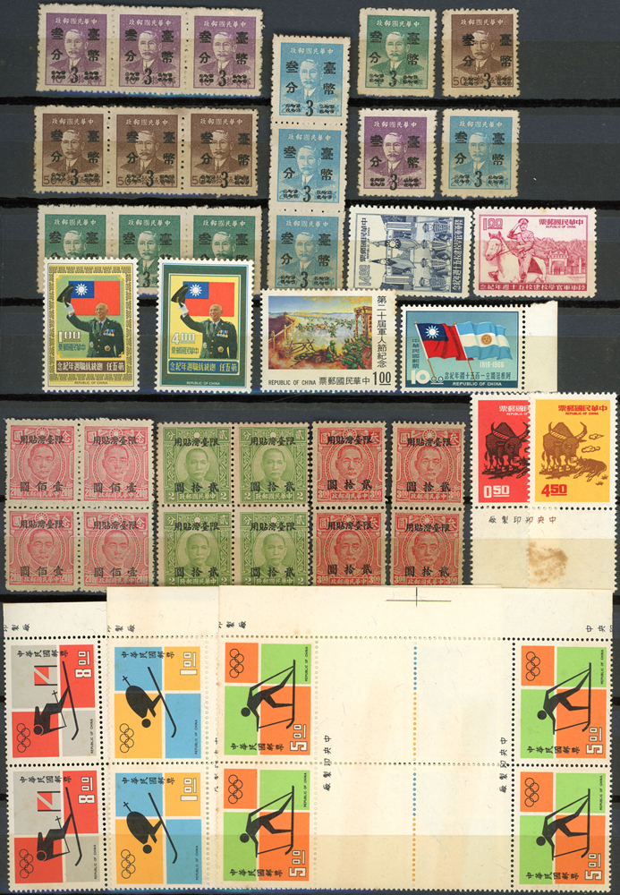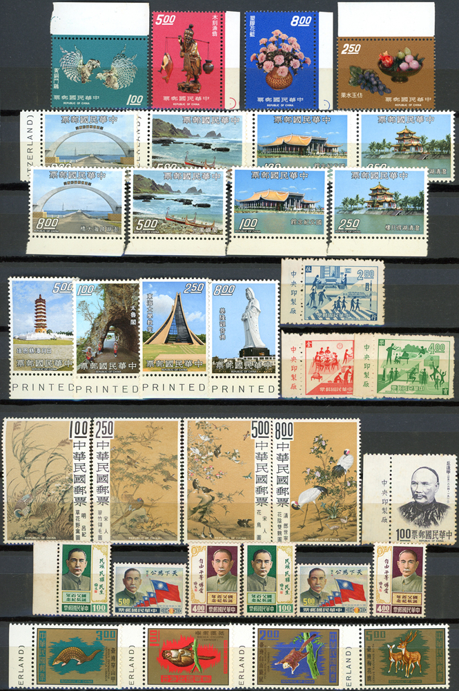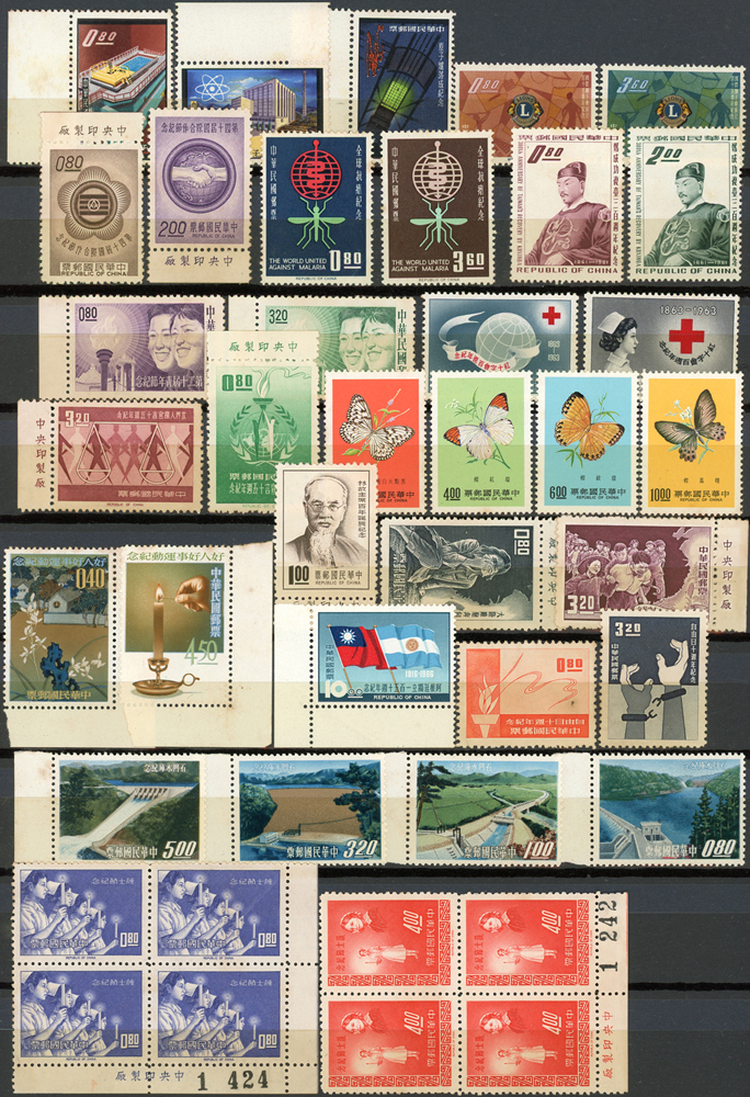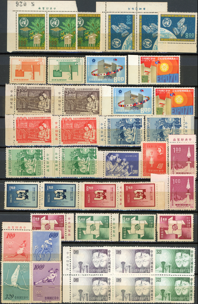 台灣1945~1975年新票730套,四海同心小全張2枚,均整理整齊於集郵冊中,新票包括有:中華民國臺灣省暫用郵票.國父像倫敦三版限臺灣貼用改值.國民大會限臺灣貼用.國民政府還都臺灣貼用.國父像農作物二版限臺灣貼用.國父像中華版限臺灣貼用改值.國父像華南版改值.兒童節.聯合國十週年.電信75週年紀念.鐵路75週年.民俗(54.55.62年版).軍人節.雷虎特技航空.花卉(53年版).中國農村復興聯合委員會十週年.世界人權宣言十週年.行憲十週年.臺灣省橫貫路通車紀念.體育(49年版).第五屆世界森林會議.國父百年誕辰紀念.石門水庫.亞洋郵盟週年.郵政七十週年.第四任總統就職週年.第三任總統就職週年.原子爐落成紀念.中菲友誼年.蔣公勳業.航空(52年版).第十九屆世界運動會.古物(59年版).清瓷.明瓷等等,品種豐富品像混合,或有重複,VF-F,歡迎至官網瀏覽全貌
