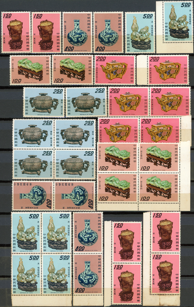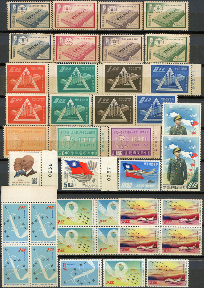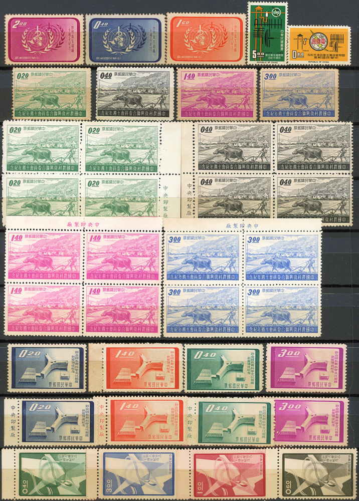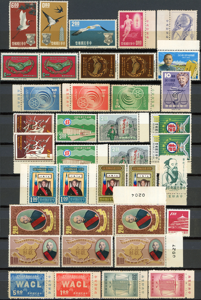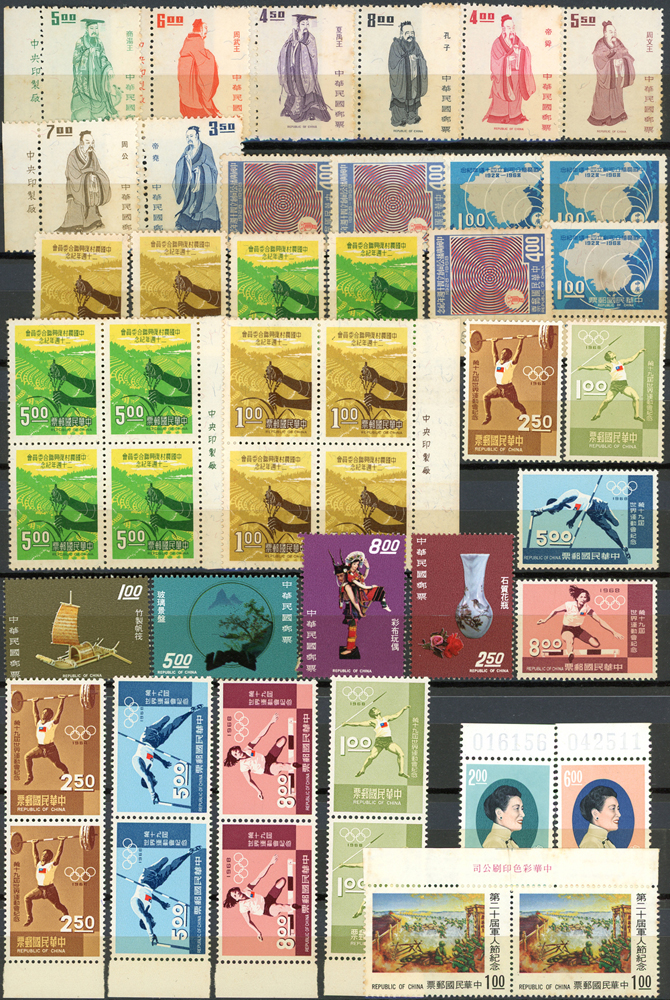 台灣1945~1975年新票730套,四海同心小全張2枚,均整理整齊於集郵冊中,新票包括有:中華民國臺灣省暫用郵票.國父像倫敦三版限臺灣貼用改值.國民大會限臺灣貼用.國民政府還都臺灣貼用.國父像農作物二版限臺灣貼用.國父像中華版限臺灣貼用改值.國父像華南版改值.兒童節.聯合國十週年.電信75週年紀念.鐵路75週年.民俗(54.55.62年版).軍人節.雷虎特技航空.花卉(53年版).中國農村復興聯合委員會十週年.世界人權宣言十週年.行憲十週年.臺灣省橫貫路通車紀念.體育(49年版).第五屆世界森林會議.國父百年誕辰紀念.石門水庫.亞洋郵盟週年.郵政七十週年.第四任總統就職週年.第三任總統就職週年.原子爐落成紀念.中菲友誼年.蔣公勳業.航空(52年版).第十九屆世界運動會.古物(59年版).清瓷.明瓷等等,品種豐富品像混合,或有重複,VF-F,歡迎至官網瀏覽全貌
