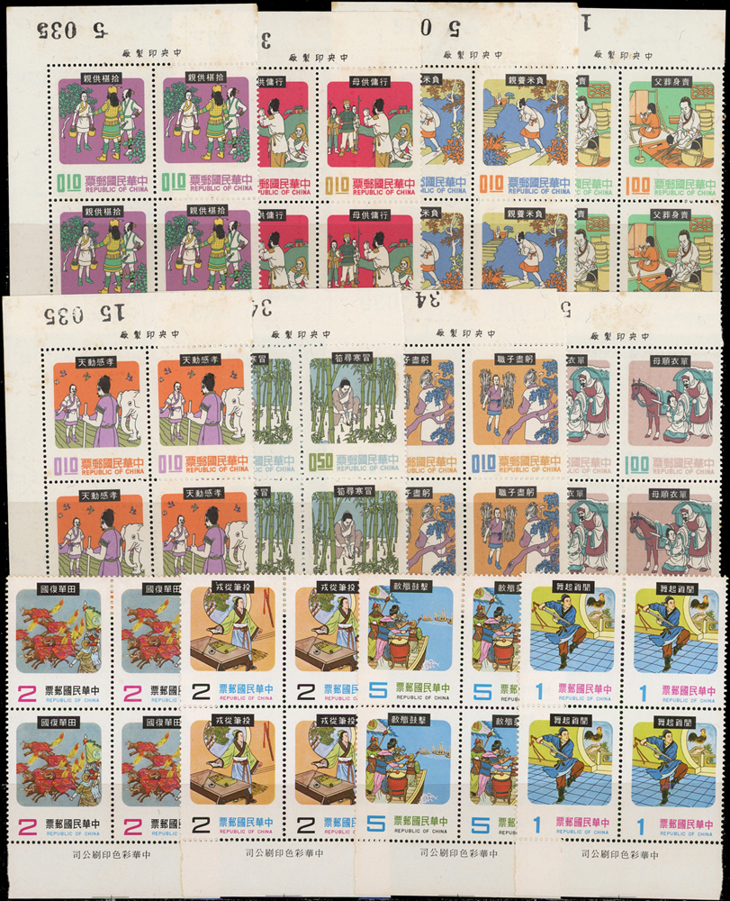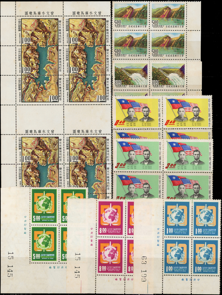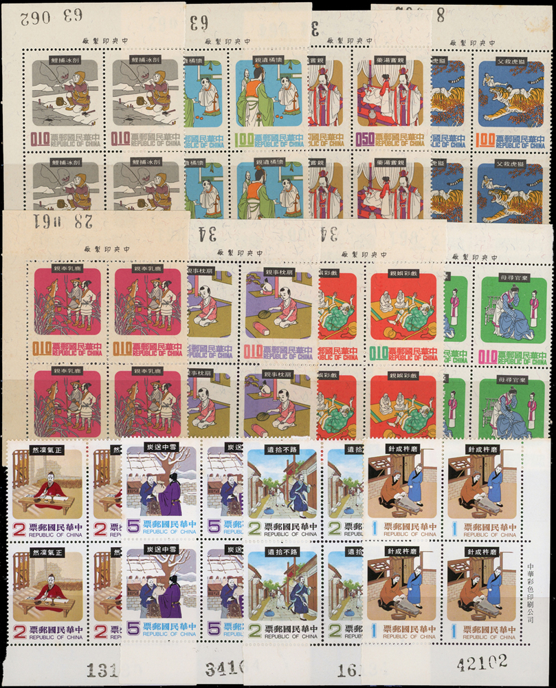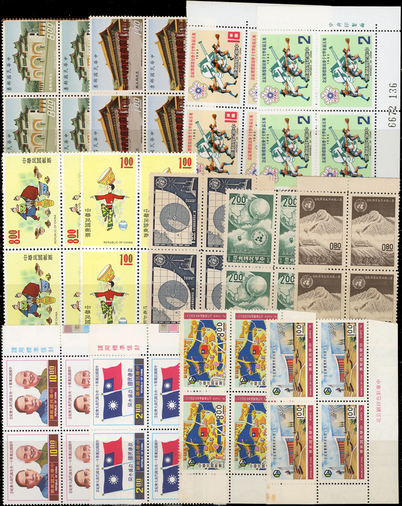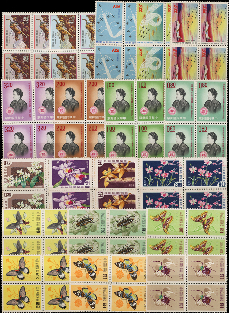 台灣中早期新票方連26組,共104套,重點內容有:雷虎特技航空.中華婦女反共抗俄聯合會十週年紀念.臺灣花卉(47年版).臺灣昆蟲(47年版).紅十字會百週年.電信八十週年.體育(51年版背銷紀戳).保衛金馬.第40屆國際合作節.曾文水庫.中國民間故事(59.60.67.69.71年版)等,品像混合,多數背黃,F-VF,歡迎至官網瀏覽全貌