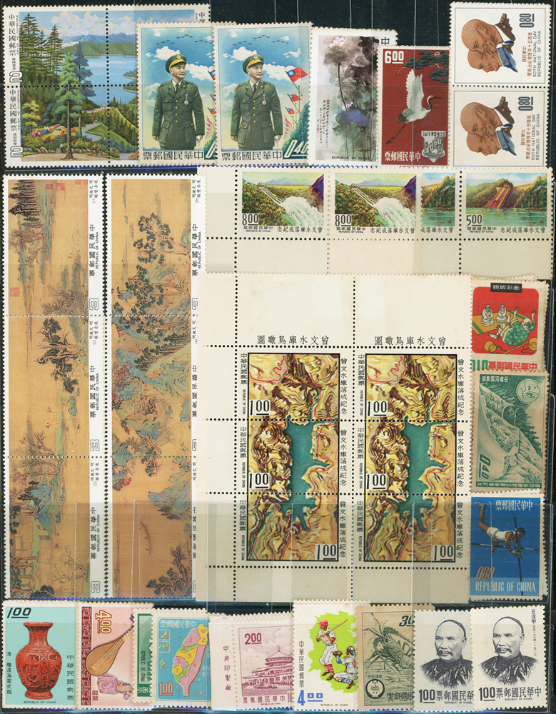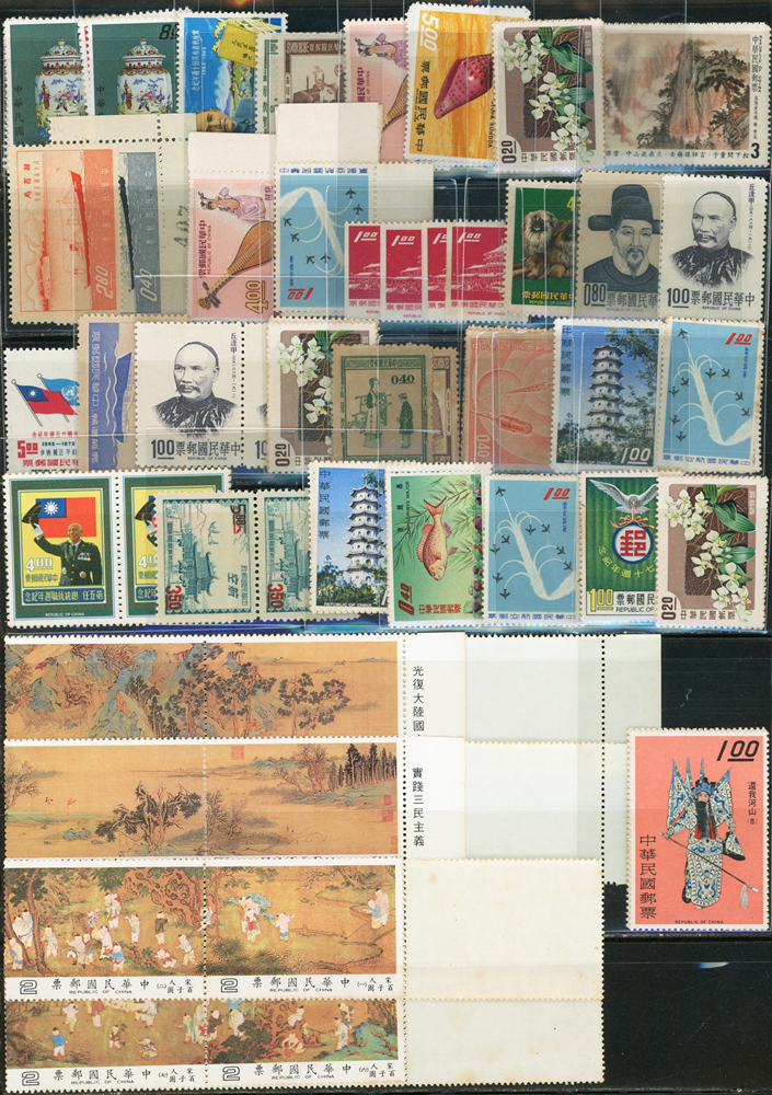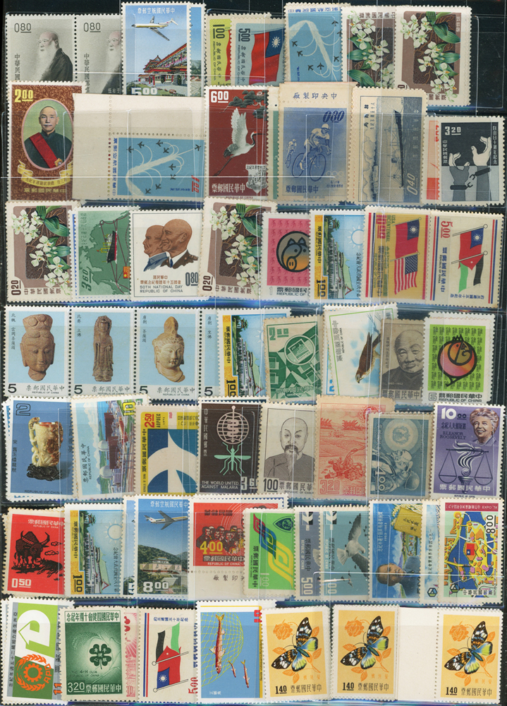 台灣中早期新票110套,重點內容有:雷虎特技航空.臺灣花卉(47年版).郵政七十週年.臺灣魚類.臺灣風景(56年版).台北版航空改值.招商局八十五週年.亞洋郵盟週年紀念.第三任總統就職週年.音樂(58年版).台灣貝殼.母教.唐詩.實施耕者有其田十週年.清瓷.中華民國建國五十年國慶.曾文水庫.中國戲劇.一版中山樓.台灣昆蟲.古物(59年版).張大千畫.體育(51年版).玉照閱兵.農業普查.于右任.百子圖.後赤壁賦圖等等,品種豐富品像混合,多有重複,多數背黃或局部淡黃,連刷票齒折,F-VF,歡迎至官網瀏覽全貌