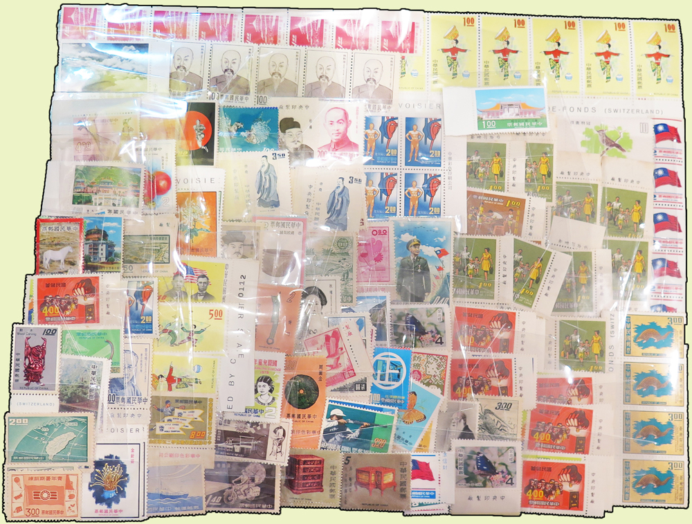 台灣中早期新票110套,重點內容有:農業普查.台灣獸類.音樂(58.65年版).先聖先賢.臺灣手工藝產品(56.63年版).蔣夫人山水畫(一).古代雕漆器(66.67年版).體育(49.51年版).古代錢幣(64.67年版).中國詩人.岳飛、文天祥.古代陶器.雁行圖.秋瑾.郵購服務.于右任.臺灣蝴蝶(66.67年版).民主導師.民俗(63年版).捲筒國旗等,品像混合或有重複,少數背斑點或齒緣淡黃,VF-F,歡迎至官網瀏覽全貌