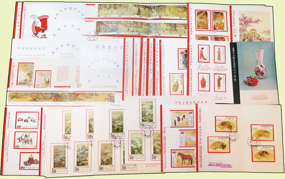 台灣1966~1986年銷戳貼票卡31卡(26套),包括有:故宮古畫(三).十二月令圖.出警圖.入蹕圖.百駿圖.漢宮春曉.臉譜.中國戲劇.十駿犬.駿馬圖(下).清明上河圖特寫.松竹圖.嬰戲圖.明仇英古畫.宋詞.張大千畫.宋人十八學士.古代雕象牙.詩經.中國文字源流.摺扇(62年版)等,部分套票僅1枚票銷戳,VF-F