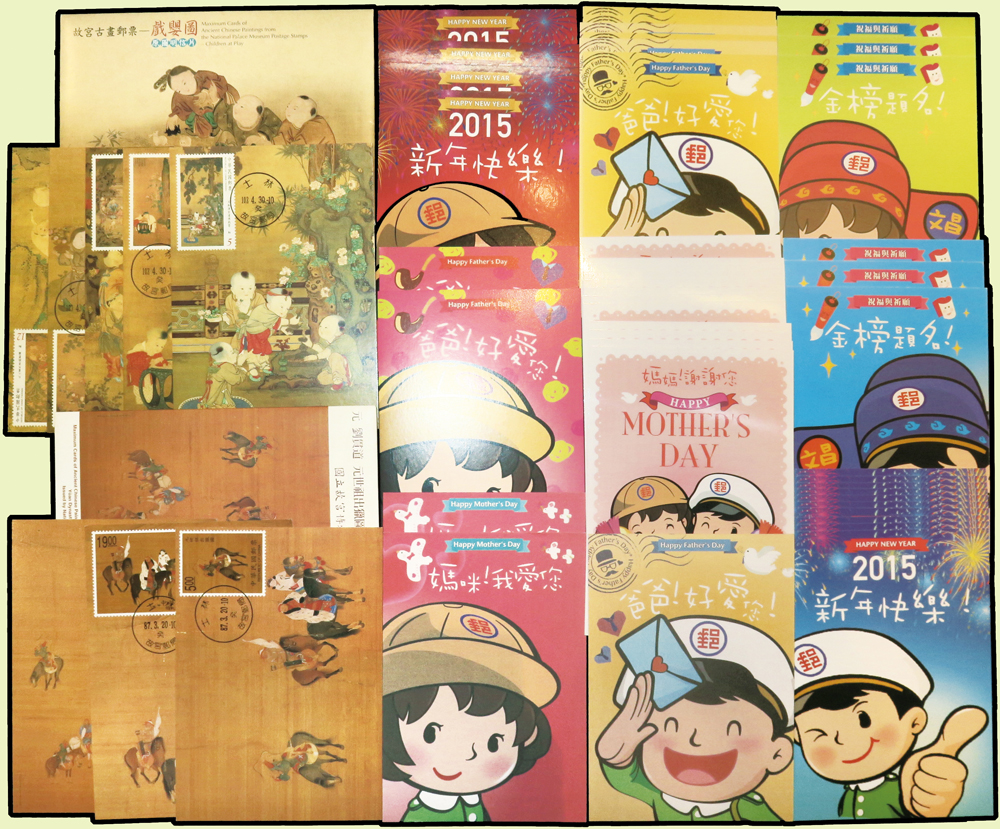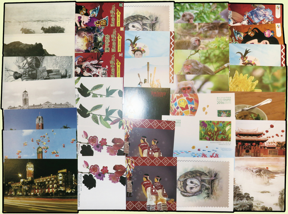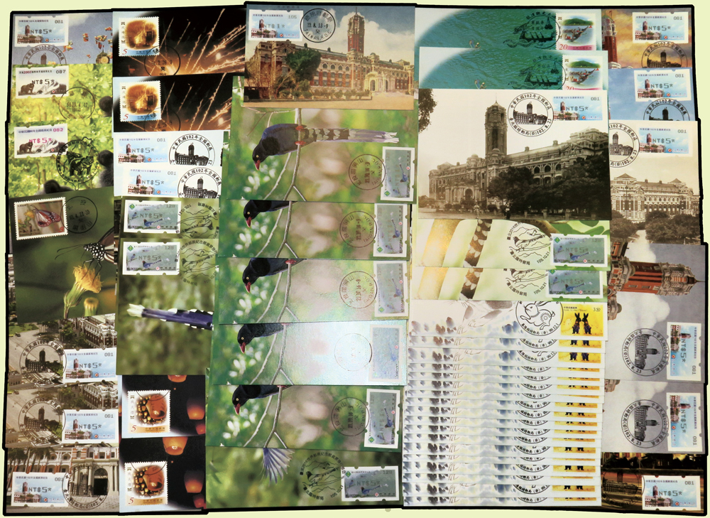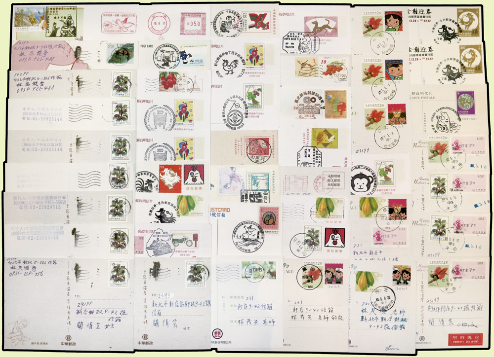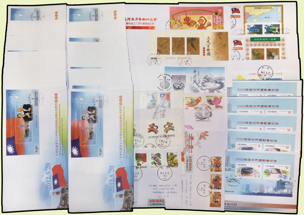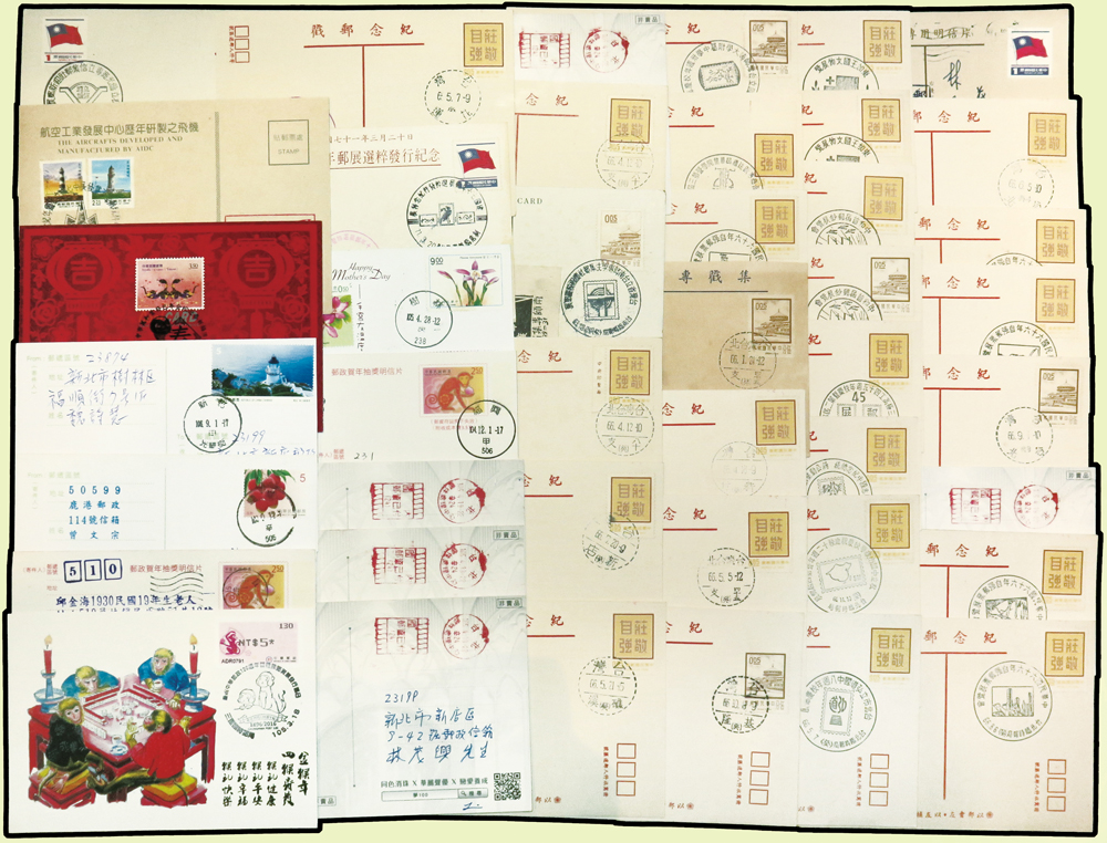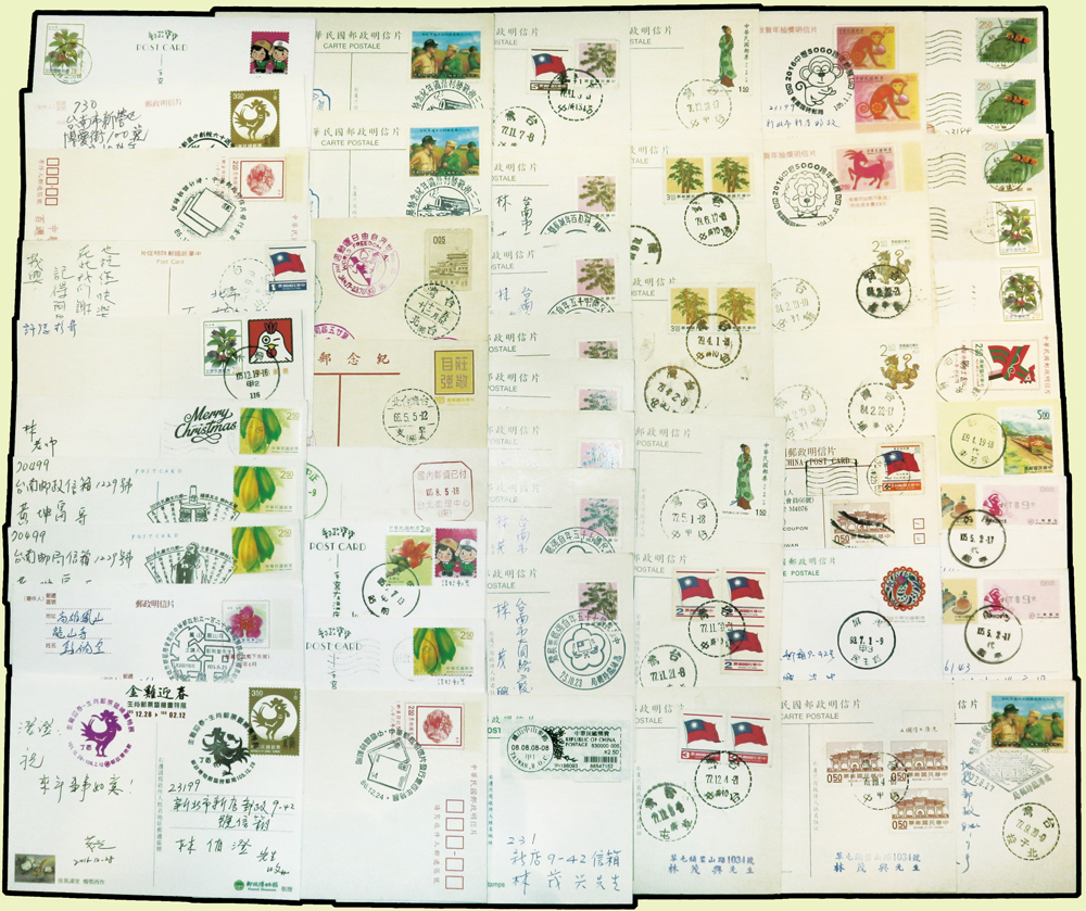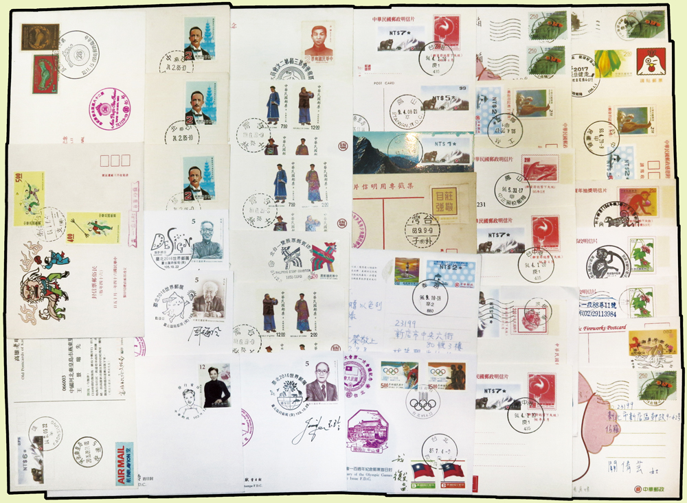 台灣封片共937件,多數為近期,包括:(1)1975~2016年套票首日封130封,含:中華民國第十三任總統副總統就職紀念100封,蔣宋美齡.三友百禽圖.臺灣生肖.羅福星烈士誕生百年.中華傳統服飾(80年版).2009高雄世界運動會紀念.保護智慧財產權等;(2)近期無符誌明信片799片,含實寄片.未使用片(占半數).原圖片.私片.中華民國臺閩風景片等等;(3)3D立體片8片,含:翠玉白菜.安平劍獅;以上品像混合,總重約4.5公斤,歡迎至官網瀏覽全貌;林茂興舊藏(Page 54)
