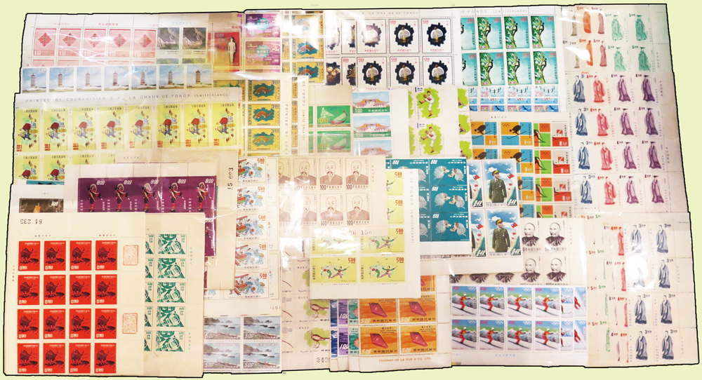 台灣中期郵票6方連至大方連31組,共372套新票,重點內容包括有:先聖先賢圖.玉照閱兵.台灣獸類.臺灣手工藝產品(62.63年版).臺灣風景(63年版上.下輯).集郵(61年版).一輪牛.一輪虎.民俗(62.63.64年版).丘逢甲.林則徐.青年自強活動.音樂(65年版).國父紀念館.臺灣鳥類(66年版).臺灣貝殼.體育(60.61.65年版).德基水庫等,品像混合或有重複,多數帶邊紙或邊角雙邊紙,其中青年自強活動背面黃斑多,其它部分背淡黃斑或齒緣淡黃,VF-F,歡迎至官網瀏覽全貌