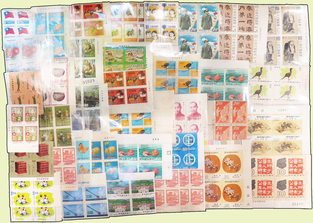 台灣中期郵票4方連38組,共152套新票,重點內容包括有:人物圖.書法藝術.臺灣貝殼.古代錢幣(67年版).音樂(66年版).摺扇(64年版).紈扇(64年版).臺灣鳥類(68年版).文字源流.玉照閱兵.抗日英烈像.一版國旗.臺灣蝴蝶(66年版).古代陶器.古代雕漆器(66年版).青年自強活動.一輪豬.兒童畫(66年版).體育(61年版)等等,品像混合或有重複,多數帶邊紙或邊角雙邊紙,少數背黃斑或齒緣淡黃,VF-F,歡迎至官網瀏覽全貌