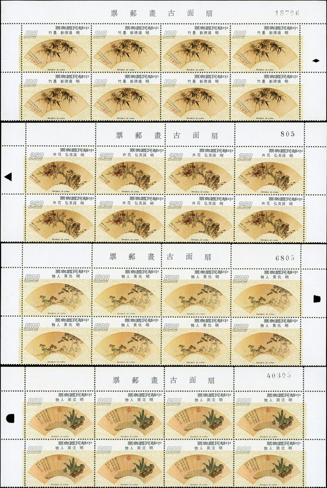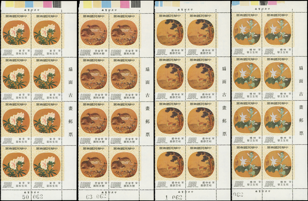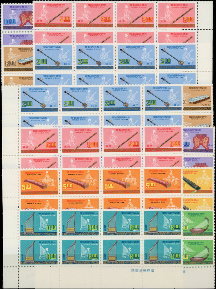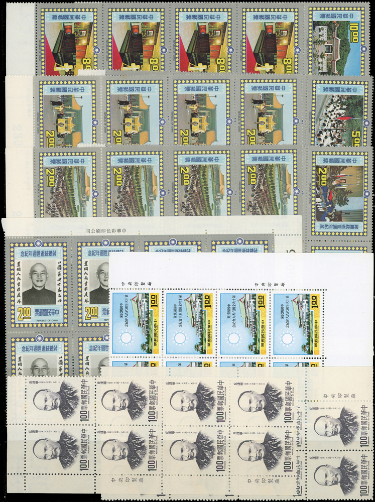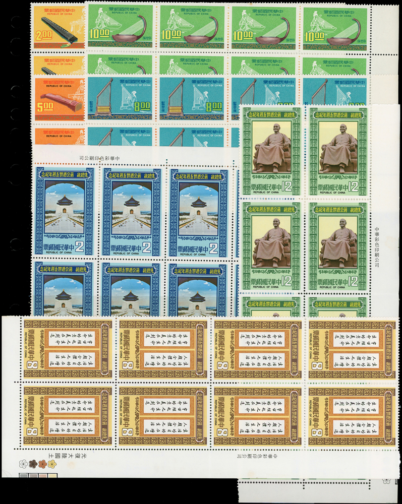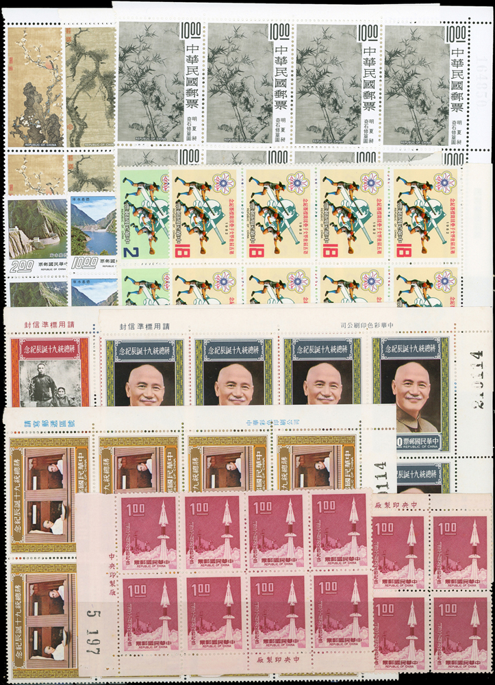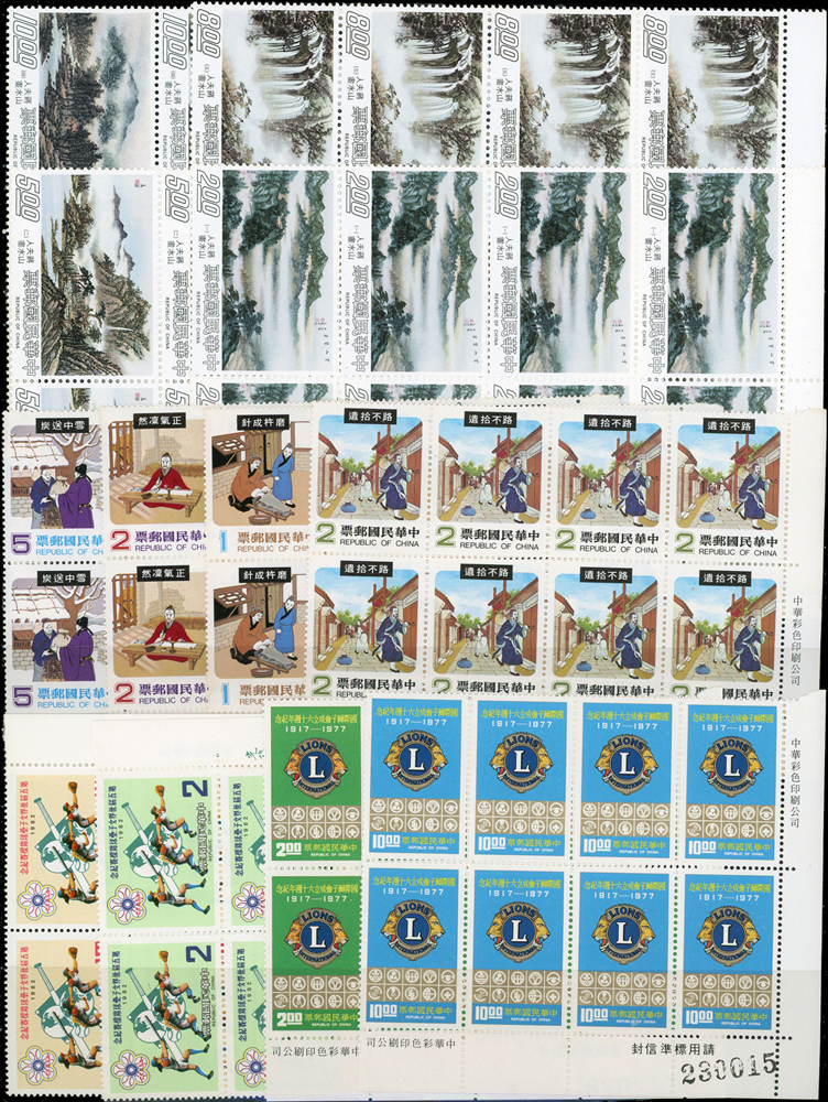 台灣中期套票8方連21組,共168套新票,均帶邊紙或雙邊紙,包括有:歲寒三友圖古畫.蔣夫人山水畫(66年版).紈扇(65年版).摺扇(62年版).蔣總統90誕辰紀念.蔣總統逝世週年.蔣總統逝世五週年.國際獅子會成立60週年.中國民間故事(69年版).德基水庫(10元背面微沾黏).中國國民黨第十次全國代表大會各1組,第三十屆防空節.第五屆世界女子壘球賽錦標賽.丘逢甲.音樂(65年版).音樂(66年版)各2組,品像混合,少數背局部淡斑點或齒淡黃,VF-F,歡迎至官網瀏覽全貌