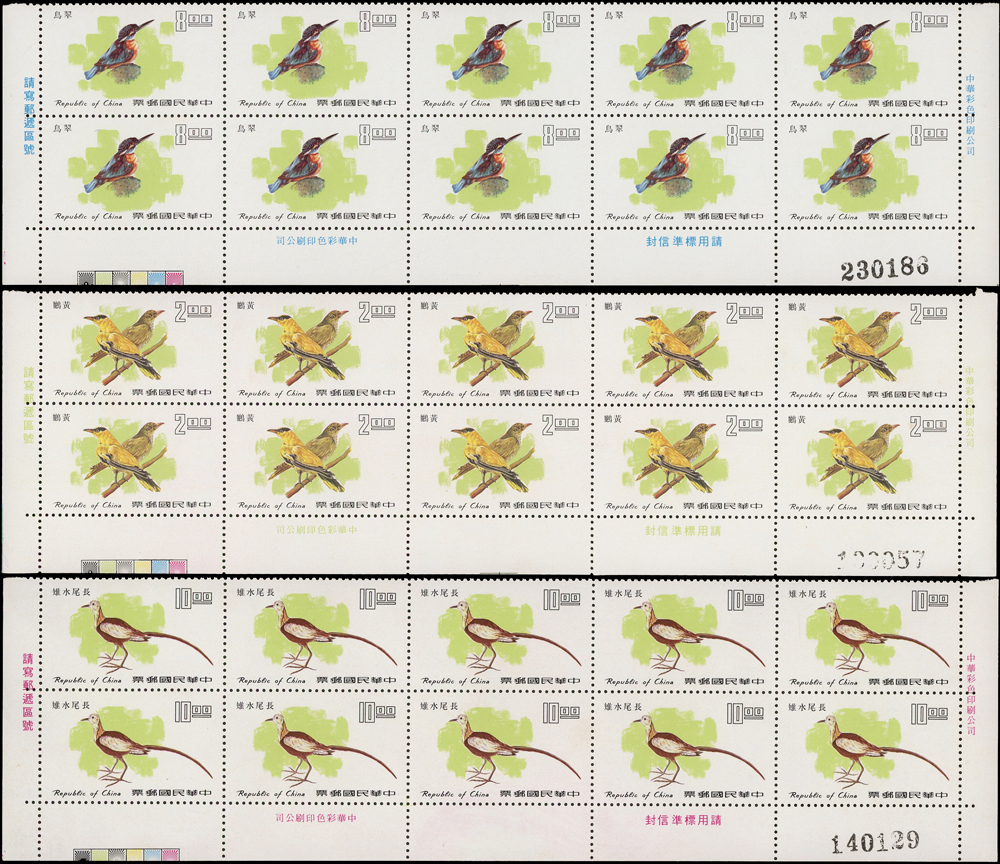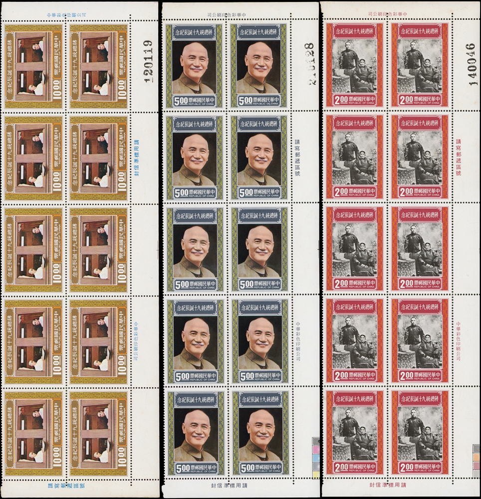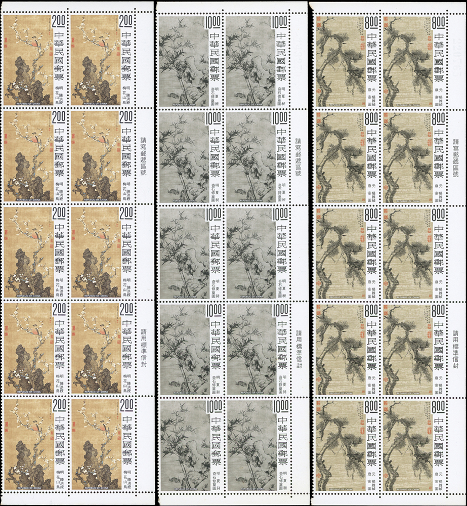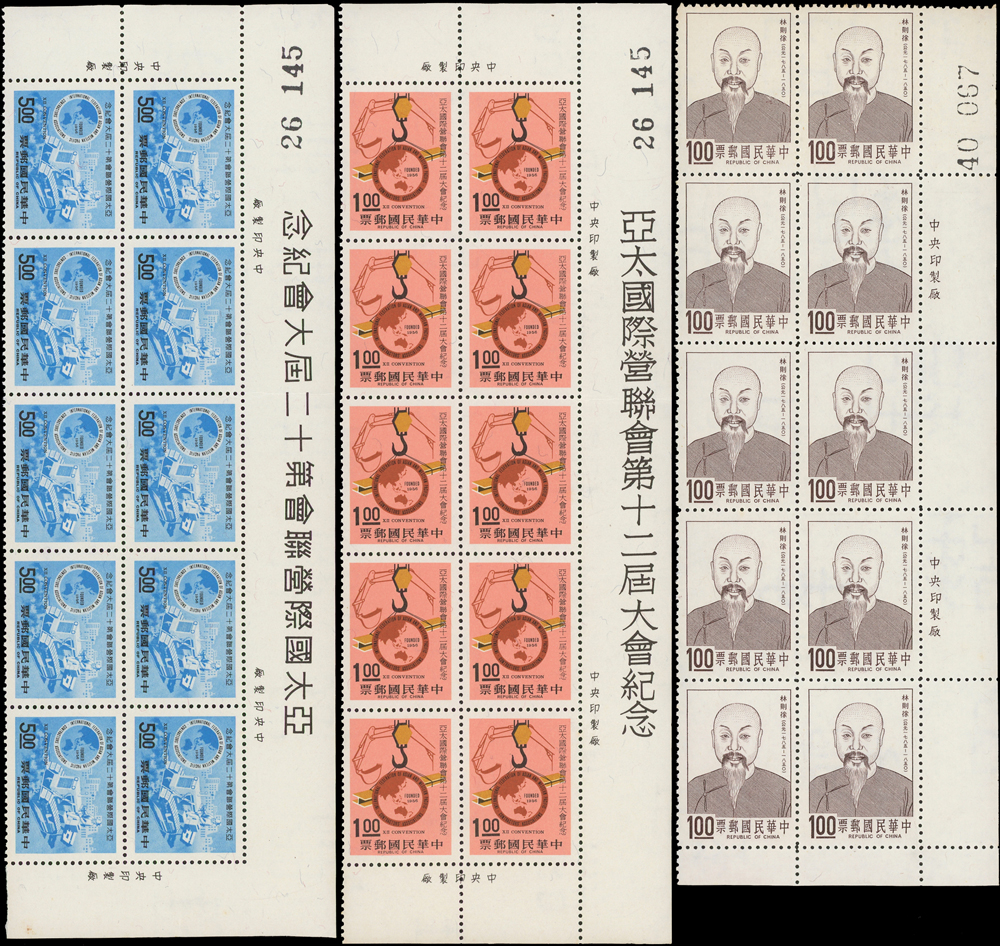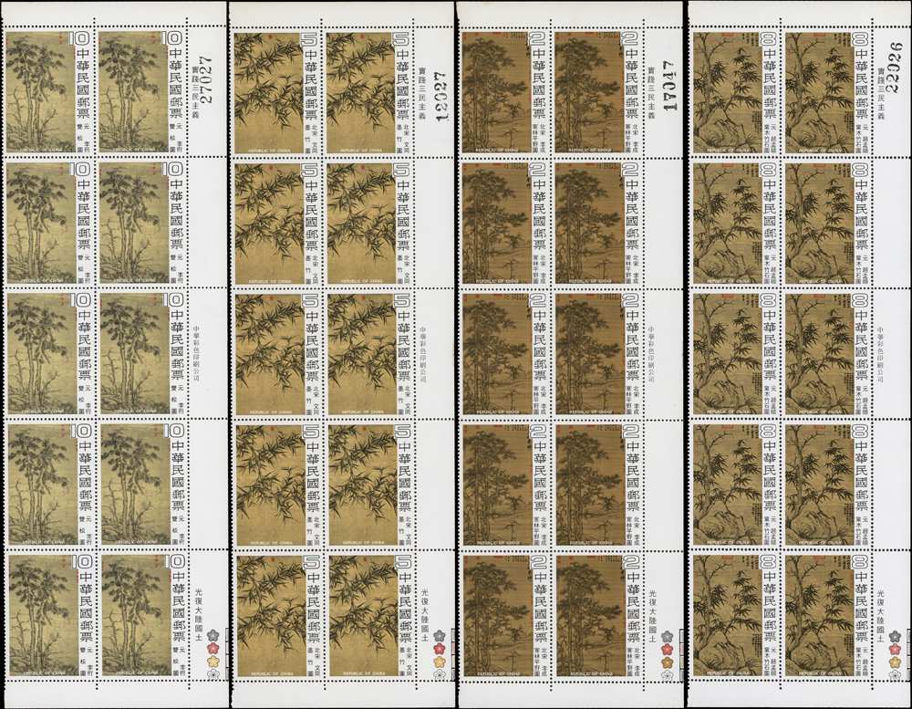 台灣中期套票10方連13組,共130套新票,均帶邊紙或雙邊紙,包括有:松竹圖古畫.人物圖.歲寒三友圖古畫.文字源流.蔣總統90誕辰紀念.臺灣鳥類(66年版).國父紀念館.國際青年商會第廿七屆世界大會.亞太國際營聯會第十二屆大會.中國國民黨第11次全國代表大會.國際獅子會成立60週年.體育(70年版).林則徐各1組,品像混合,每種背面均有局部淡斑點或齒淡黃,VF-F,歡迎至官網瀏覽全貌