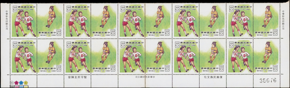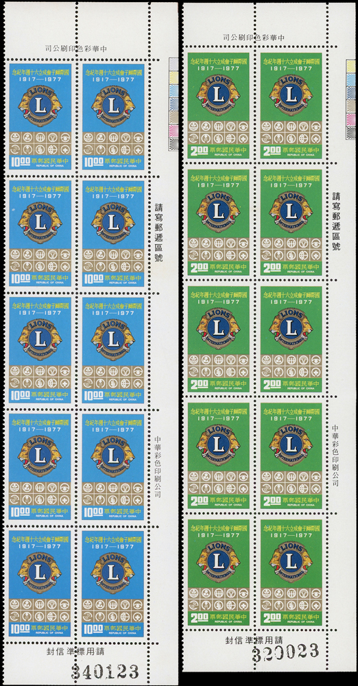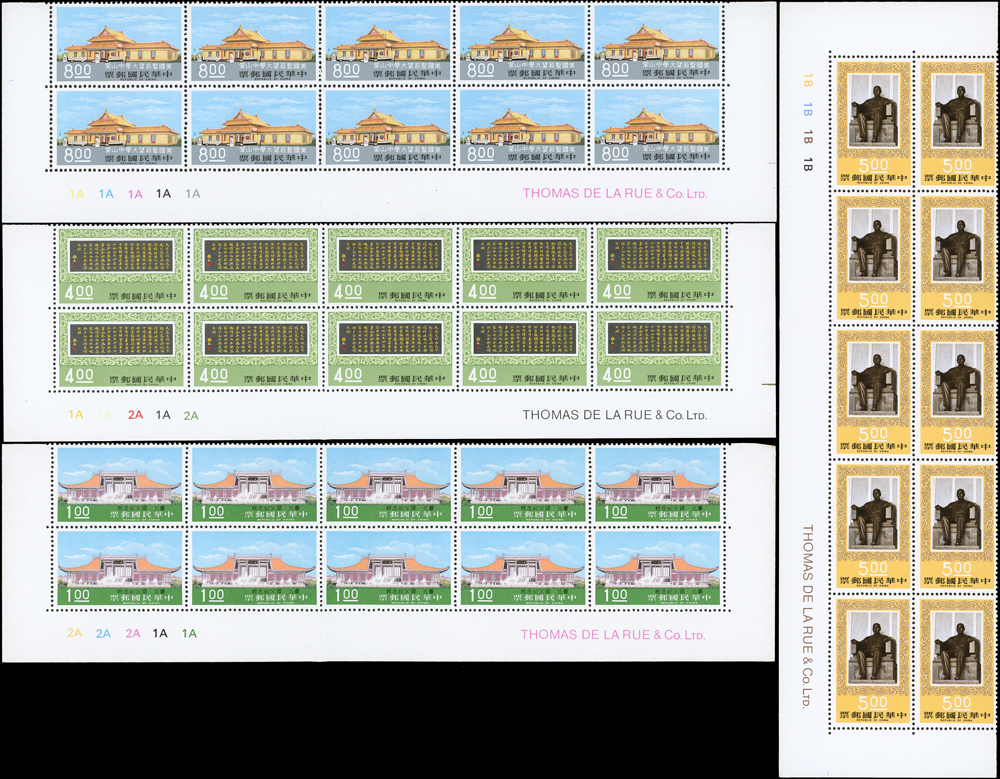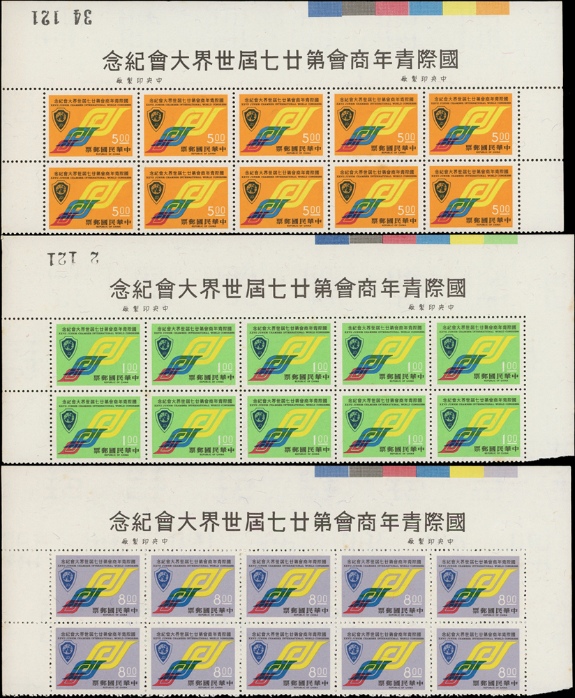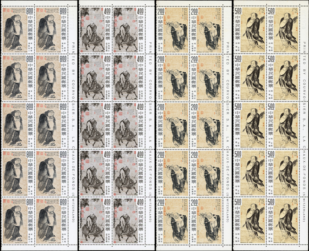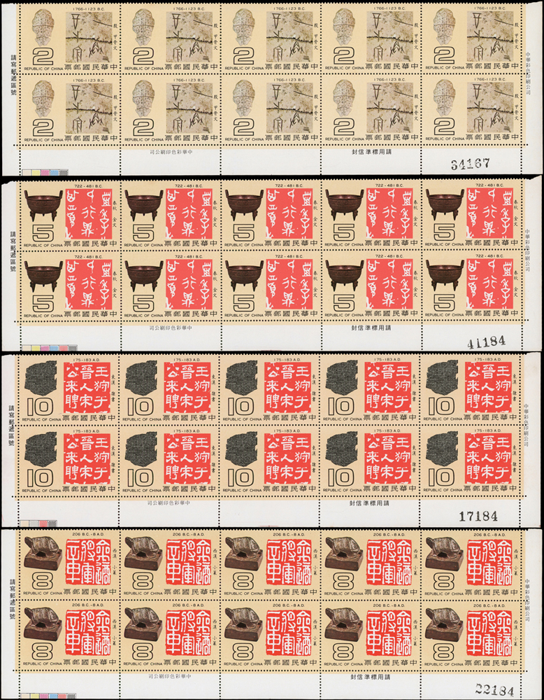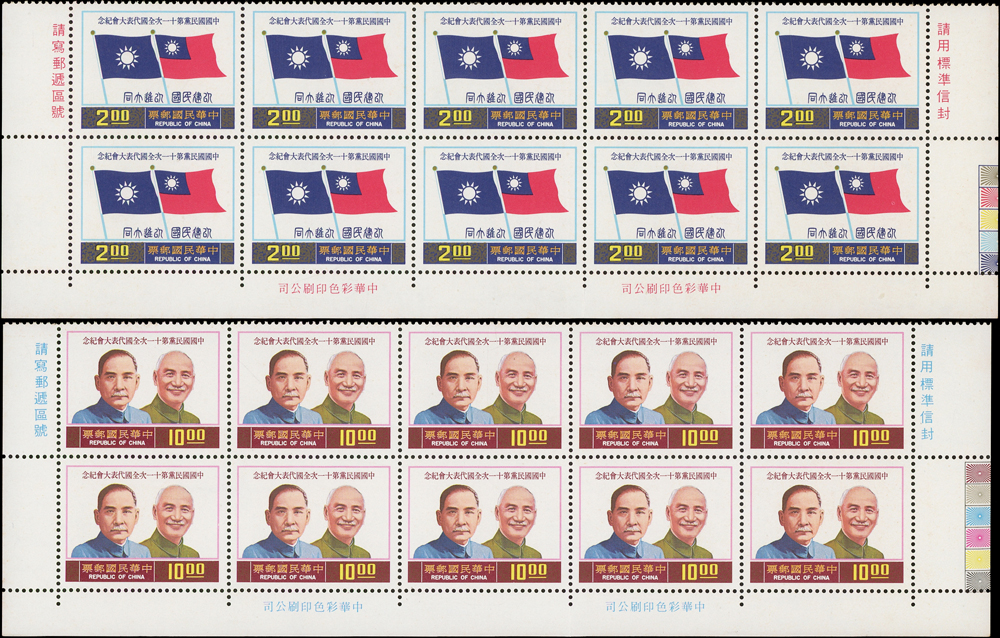 台灣中期套票10方連13組,共130套新票,均帶邊紙或雙邊紙,包括有:松竹圖古畫.人物圖.歲寒三友圖古畫.文字源流.蔣總統90誕辰紀念.臺灣鳥類(66年版).國父紀念館.國際青年商會第廿七屆世界大會.亞太國際營聯會第十二屆大會.中國國民黨第11次全國代表大會.國際獅子會成立60週年.體育(70年版).林則徐各1組,品像混合,每種背面均有局部淡斑點或齒淡黃,VF-F,歡迎至官網瀏覽全貌