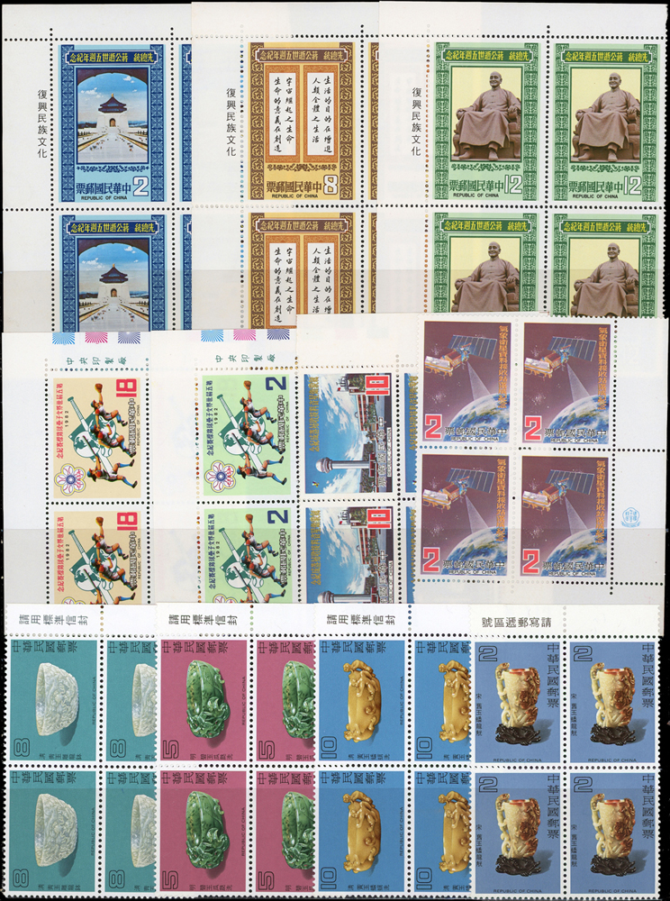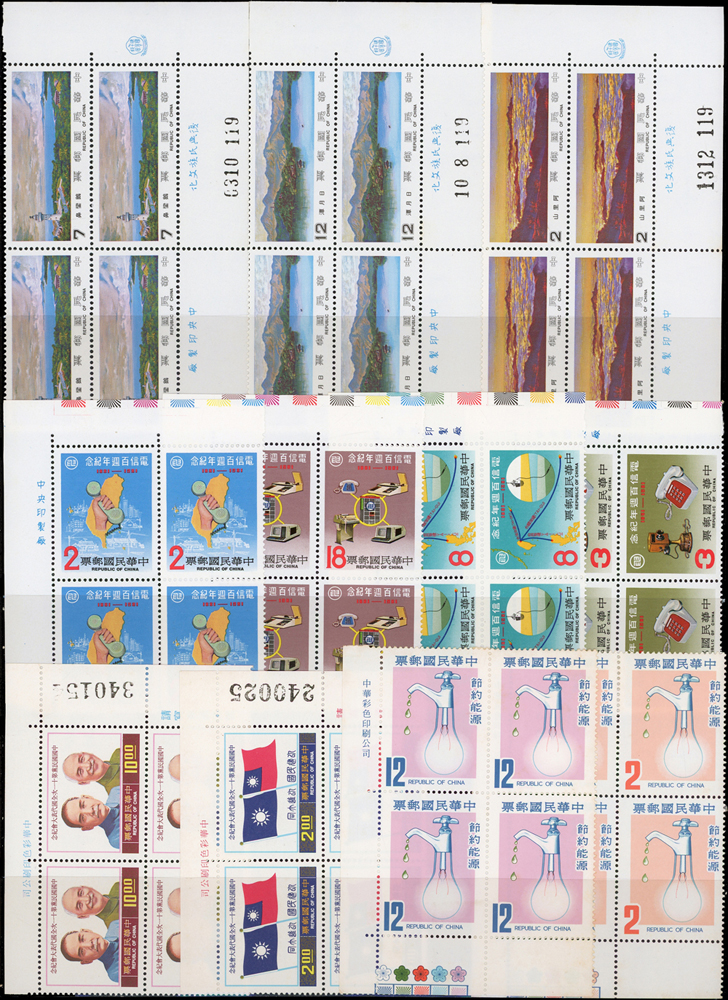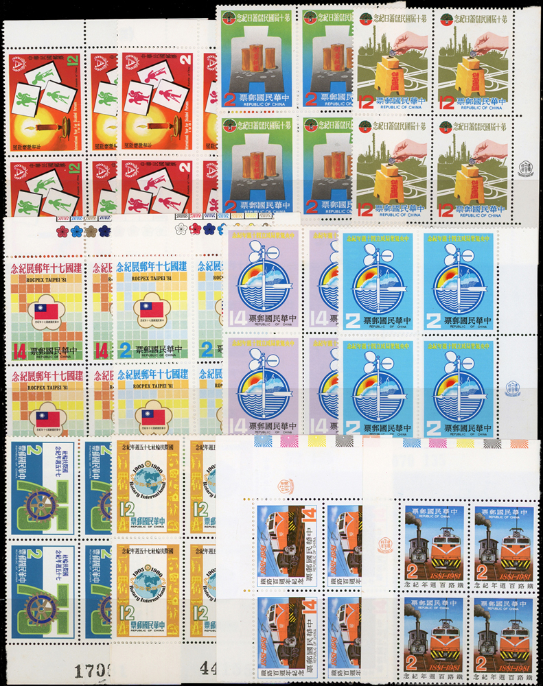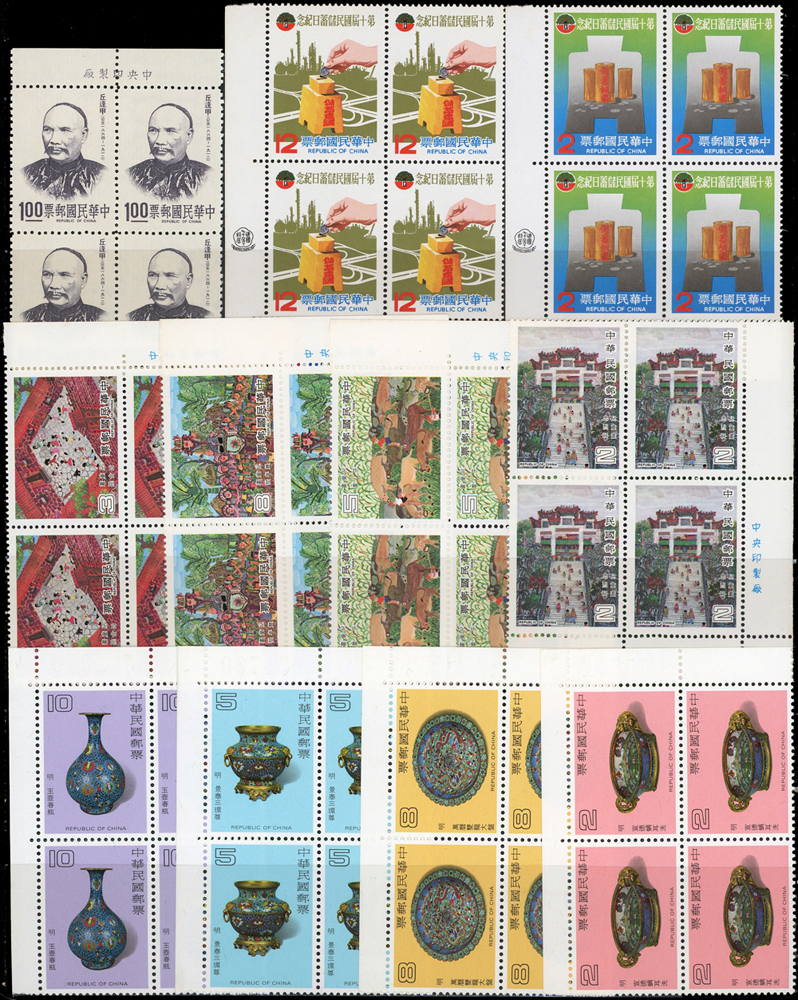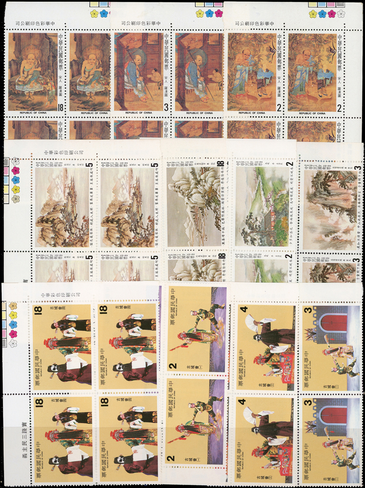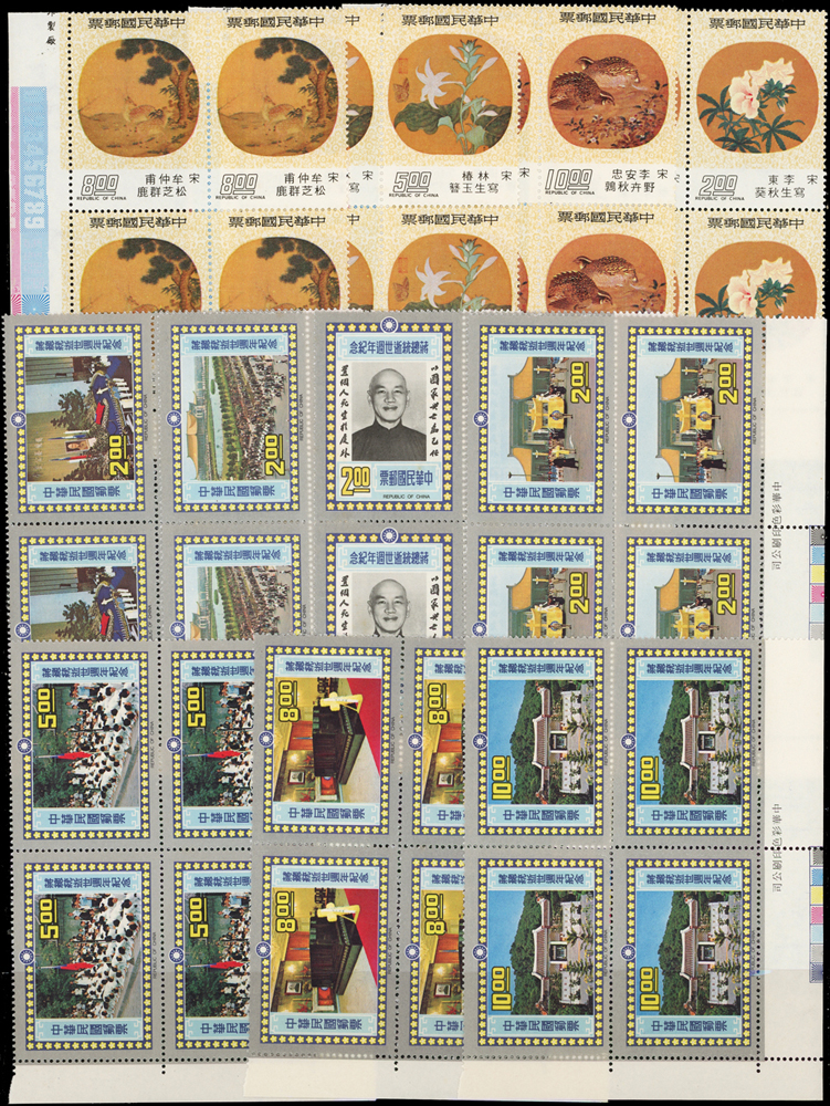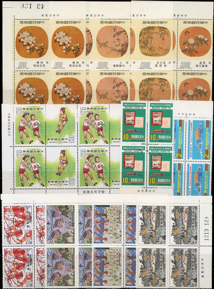 台灣中期套票4方連30組,共120套新票,均帶邊紙或雙邊紙,重點內容包括有:宋人羅漢圖.唐詩.古城會.紈扇(64.65年版).古代琺瑯器(70年版).古代玉器(69年版).氣象衛星資料接收站落成.蔣總統逝世週年.蔣總統逝世五週年.音樂(66年版).臺灣廟宇建築.第五屆世界女子壘球賽錦標賽.節約能源.中國民間故事(64年版).中國國民黨第11次全國代表大會.電信百周年.臺灣山水(70年版).鐵路百週年紀念.國際扶輪社七十五週年等,品像混合,或有重複,少數齒淡黃或局部淡斑,VF-F,歡迎至官網瀏覽全貌