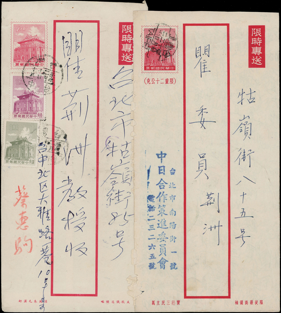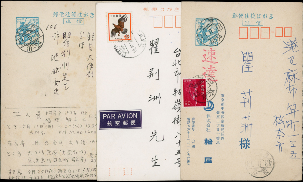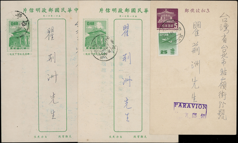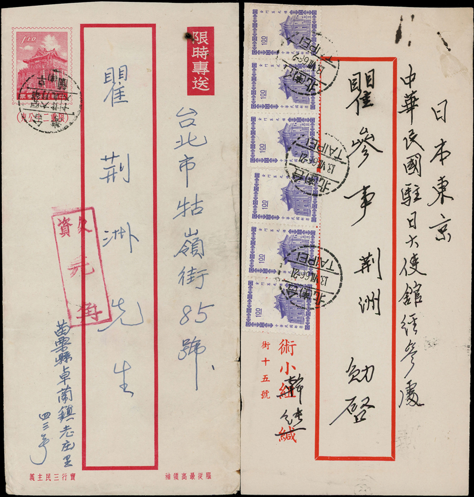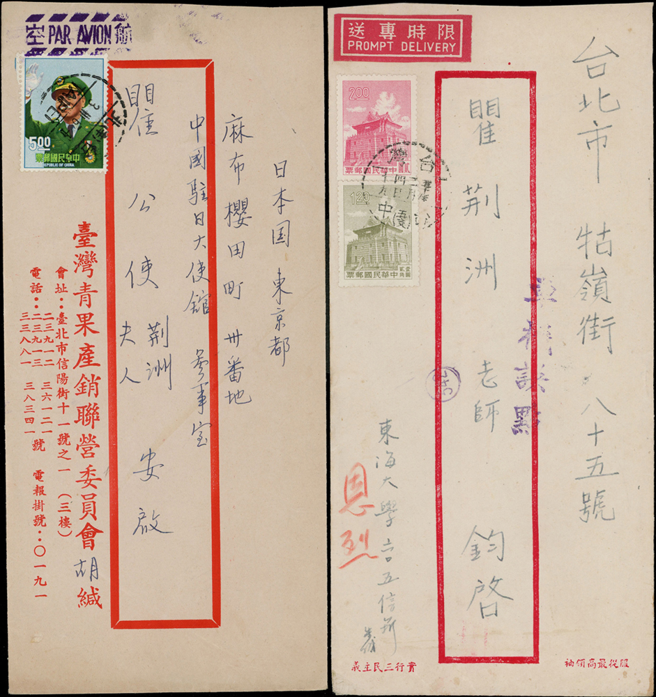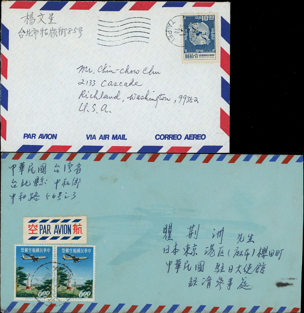 1950~1981年實寄名人封.片40件(封.片各20件),收件人均為:瞿荊洲(曾任臺灣銀行第二任總經理,駐日大使),含:台灣寄日本大使館.台灣國內互寄.日本國內互寄,歡迎至官網瀏覽全貌