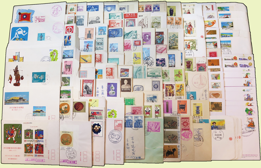 台灣各式封共205封:(1)中早期低值封158封,部分實寄,品種豐富,重點包括有:前十八寶.西螺大橋落成.鄭像改值.單位資費改面值.第11屆青年節.聯合國十週年.行憲十週年.郵政六十週年.國父九十誕辰.臉譜.電信七十五週年.軍人節.臺灣昆蟲(47年版).臺灣花卉(47年版).故宮古畫(一).十二月令圖.原子爐落成.電信八十週年.招商局八十五週年.保衛金馬.第三任總統就職週年.體育(49年版).臺灣省橫貫路通車.雷虎特技航空.兒童節.地圖.蔣總統七秩華誕.中國農村復興聯合委員會十週年.臺灣省橫貫公路開工週年等等;(2)近期套票首日封-八仙過海(上.下輯)各1套,均分貼4封;國防醫學院建院百年2封;湯若望誕生四百週年8封;另低值封28封,含古詩.中國戲劇(81年版)等;(3)1958年地圖1.4元郵資封銷台北(元)47.10.10寄本埠;以上品像混合或有重複,歡迎至官網瀏覽全貌