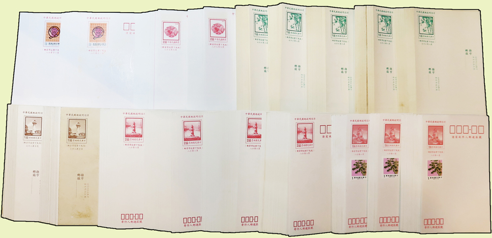 台灣1987~1998年未使用郵資片741片,包括:竹子1.5元200片,目斗嶼燈塔2.5元246片,鴛鴦2.5元100片,燈塔1.5元100片,燈塔1.5元加貼松竹梅1元票55片,猴年2.5元40片,少數片黃