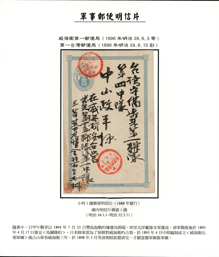 信封分類 大清郵政 1911年以前清代~國家郵政史(1082-1112)清代~商埠郵政史(1156-1158)在華客郵郵史(1168-1188)中華民國郵政 1912~1949年民國~郵政史(1424-1537)民國~名人封(1538-1547)民國~防盜(1548-1559)民國~首航封(1560-1570)民國~欠資封(1571-1574)民國~檢查封(1575-1599)民國~行動郵局/信櫃(1600-1613)兩岸通郵史(1933年-1989年)(1614-1632)民國~郵政匯兌(1633-1644)民國~民信局/僑批(1645-1651)民國~郵政明信片(1652-1659)民國~風景明信片(1660-1683)民國~國內及國際航空郵簡(1684-1703)日偽政權~郵政史(1714-1723)台灣 1888~2020年台灣~整批/整冊信封(3554-3583)日治時期~台灣郵史1895~1945(3601-3661)日治時期~台灣明信片(3662-3688)日治時期~台灣風景片(3689-3695)台灣老台幣時期~國父像火炬圖『限臺灣省用』明信片(3738-3739)台灣~老台幣時期郵政史1945~1949(3740-3815)台灣~自動化實寄封(4646-4647)台灣~新台幣時期郵政史(6001-6041)大陳島(6042)台灣~代辦所/欠資/首航(6043-6055)台灣~郵政匯兌(6056-6073)台灣~首日封(6074-6090)台灣~郵資封/郵政明信片(6091-6100)台灣~原圖卡(6101-6113)台灣~國內及國際航空郵簡(6114-6122)中國人民郵政 1949~2018年新中國~解放區郵史(6128-6140)新中國~郵政史(6277-6289)新中國~郵政匯兌/郵資封片(6290-6304)中國香港~郵政史(6314-6316)世界各國郵票日本郵政史(6327-6334)外國信封(A~Z)(6350-6365) 大清郵政 1911年以前 ↳清代~國家郵政史(1082-1112) ↳清代~商埠郵政史(1156-1158) ↳在華客郵郵史(1168-1188)中華民國郵政 1912~1949年 ↳民國~郵政史(1424-1537) ↳民國~名人封(1538-1547) ↳民國~防盜(1548-1559) ↳民國~首航封(1560-1570) ↳民國~欠資封(1571-1574) ↳民國~檢查封(1575-1599) ↳民國~行動郵局/信櫃(1600-1613) ↳兩岸通郵史(1933年-1989年)(1614-1632) ↳民國~郵政匯兌(1633-1644) ↳民國~民信局/僑批(1645-1651) ↳民國~郵政明信片(1652-1659) ↳民國~風景明信片(1660-1683) ↳民國~國內及國際航空郵簡(1684-1703) ↳日偽政權~郵政史(1714-1723)台灣 1888~2020年 ↳台灣~整批/整冊信封(3554-3583) ↳日治時期~台灣郵史1895~1945(3601-3661) ↳日治時期~台灣明信片(3662-3688) ↳日治時期~台灣風景片(3689-3695) ↳台灣老台幣時期~國父像火炬圖『限臺灣省用』明信片(3738-3739) ↳台灣~老台幣時期郵政史1945~1949(3740-3815) ↳台灣~自動化實寄封(4646-4647) ↳台灣~新台幣時期郵政史(6001-6041) ↳大陳島(6042) ↳台灣~代辦所/欠資/首航(6043-6055) ↳台灣~郵政匯兌(6056-6073) ↳台灣~首日封(6074-6090) ↳台灣~郵資封/郵政明信片(6091-6100) ↳台灣~原圖卡(6101-6113) ↳台灣~國內及國際航空郵簡(6114-6122)中國人民郵政 1949~2018年 ↳新中國~解放區郵史(6128-6140) ↳新中國~郵政史(6277-6289) ↳新中國~郵政匯兌/郵資封片(6290-6304) ↳中國香港~郵政史(6314-6316)世界各國郵票 ↳日本郵政史(6327-6334) ↳外國信封(A~Z)(6350-6365) 點圖放大展示 2 1896年日本小判壹錢郵資片,銷威海衛第一郵便局/廿九年六月三日紅色丸一戳,寄台灣守備步兵第一聯隊,旁銷第一臺灣郵便局/廿九年六月五日紅色丸一到戳(Page 57) 結標時間 2025-12-16 10:34:40 拍品編號:3605 起拍價:NT$25000 當前價:NT$25000 自動出價 直接出價 出價 系統將按出價級數,依序為您比(出)價至上限金額 提醒您:直接出價後不可將金額改低,只能改高,蟠龍無法降低您的出價,最高出價者無法取消出價 (查看出價說明) 得標說明:需按得標價另加10%佣金 當前加價幅度:NT$0元 (查看加價級數表) 回上頁 線上出價記錄 線上 0 人次,書面 0 人次 競價客戶 所在地 出價時間 出價金額 出價方式 問與答 目前尚無提問 我要提問 請先登入會員
