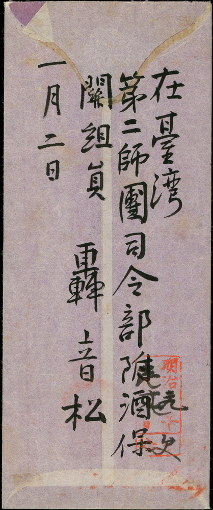 信封分類 大清郵政 1911年以前清代~國家郵政史(1082-1112)清代~商埠郵政史(1156-1158)在華客郵郵史(1168-1188)中華民國郵政 1912~1949年民國~郵政史(1424-1537)民國~名人封(1538-1547)民國~防盜(1548-1559)民國~首航封(1560-1570)民國~欠資封(1571-1574)民國~檢查封(1575-1599)民國~行動郵局/信櫃(1600-1613)兩岸通郵史(1933年-1989年)(1614-1632)民國~郵政匯兌(1633-1644)民國~民信局/僑批(1645-1651)民國~郵政明信片(1652-1659)民國~風景明信片(1660-1683)民國~國內及國際航空郵簡(1684-1703)日偽政權~郵政史(1714-1723)台灣 1888~2020年台灣~整批/整冊信封(3554-3583)日治時期~台灣郵史1895~1945(3601-3661)日治時期~台灣明信片(3662-3688)日治時期~台灣風景片(3689-3695)台灣老台幣時期~國父像火炬圖『限臺灣省用』明信片(3738-3739)台灣~老台幣時期郵政史1945~1949(3740-3815)台灣~自動化實寄封(4646-4647)台灣~新台幣時期郵政史(6001-6041)大陳島(6042)台灣~代辦所/欠資/首航(6043-6055)台灣~郵政匯兌(6056-6073)台灣~首日封(6074-6090)台灣~郵資封/郵政明信片(6091-6100)台灣~原圖卡(6101-6113)台灣~國內及國際航空郵簡(6114-6122)中國人民郵政 1949~2018年新中國~解放區郵史(6128-6140)新中國~郵政史(6277-6289)新中國~郵政匯兌/郵資封片(6290-6304)中國香港~郵政史(6314-6316)世界各國郵票日本郵政史(6327-6334)外國信封(A~Z)(6350-6365) 大清郵政 1911年以前 ↳清代~國家郵政史(1082-1112) ↳清代~商埠郵政史(1156-1158) ↳在華客郵郵史(1168-1188)中華民國郵政 1912~1949年 ↳民國~郵政史(1424-1537) ↳民國~名人封(1538-1547) ↳民國~防盜(1548-1559) ↳民國~首航封(1560-1570) ↳民國~欠資封(1571-1574) ↳民國~檢查封(1575-1599) ↳民國~行動郵局/信櫃(1600-1613) ↳兩岸通郵史(1933年-1989年)(1614-1632) ↳民國~郵政匯兌(1633-1644) ↳民國~民信局/僑批(1645-1651) ↳民國~郵政明信片(1652-1659) ↳民國~風景明信片(1660-1683) ↳民國~國內及國際航空郵簡(1684-1703) ↳日偽政權~郵政史(1714-1723)台灣 1888~2020年 ↳台灣~整批/整冊信封(3554-3583) ↳日治時期~台灣郵史1895~1945(3601-3661) ↳日治時期~台灣明信片(3662-3688) ↳日治時期~台灣風景片(3689-3695) ↳台灣老台幣時期~國父像火炬圖『限臺灣省用』明信片(3738-3739) ↳台灣~老台幣時期郵政史1945~1949(3740-3815) ↳台灣~自動化實寄封(4646-4647) ↳台灣~新台幣時期郵政史(6001-6041) ↳大陳島(6042) ↳台灣~代辦所/欠資/首航(6043-6055) ↳台灣~郵政匯兌(6056-6073) ↳台灣~首日封(6074-6090) ↳台灣~郵資封/郵政明信片(6091-6100) ↳台灣~原圖卡(6101-6113) ↳台灣~國內及國際航空郵簡(6114-6122)中國人民郵政 1949~2018年 ↳新中國~解放區郵史(6128-6140) ↳新中國~郵政史(6277-6289) ↳新中國~郵政匯兌/郵資封片(6290-6304) ↳中國香港~郵政史(6314-6316)世界各國郵票 ↳日本郵政史(6327-6334) ↳外國信封(A~Z)(6350-6365) 點大圖放大展示,點小圖切換 1 1896年第二師團司令部寄日本軍事郵便無貼票封,銷第十臺灣郵便局/廿九年一月三日丸一型戳(今台南),豐前四日市/廿九年一月十七日丸一型到達戳(Page 57) 結標時間 2025-12-16 10:35:00 拍品編號:3606 起拍價:NT$4000 當前價:NT$4000 自動出價 直接出價 出價 系統將按出價級數,依序為您比(出)價至上限金額 提醒您:直接出價後不可將金額改低,只能改高,蟠龍無法降低您的出價,最高出價者無法取消出價 (查看出價說明) 得標說明:需按得標價另加10%佣金 當前加價幅度:NT$0元 (查看加價級數表) 回上頁 線上出價記錄 線上 0 人次,書面 0 人次 競價客戶 所在地 出價時間 出價金額 出價方式 問與答 目前尚無提問 我要提問 請先登入會員
