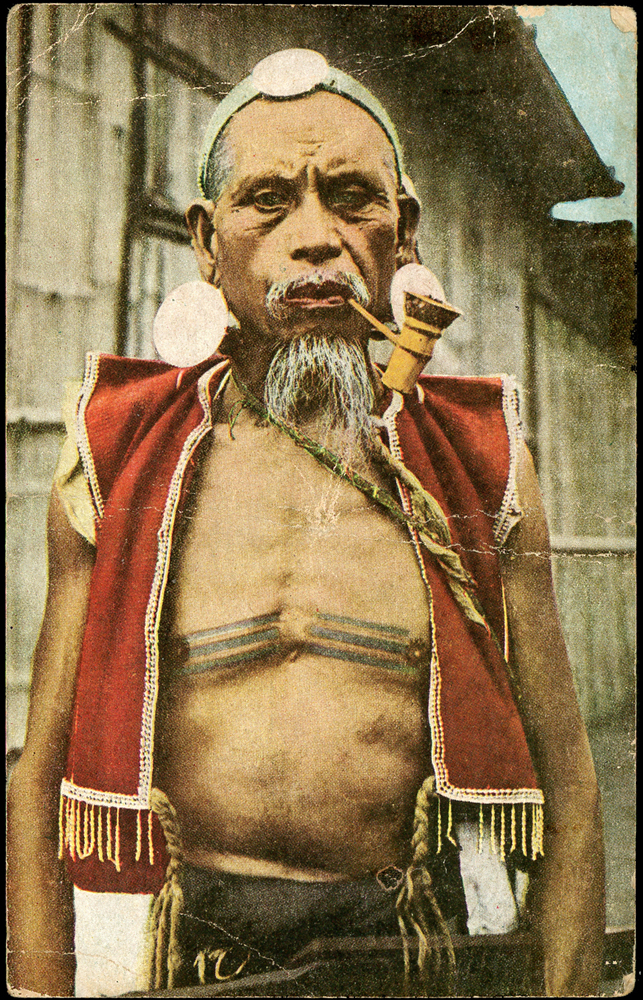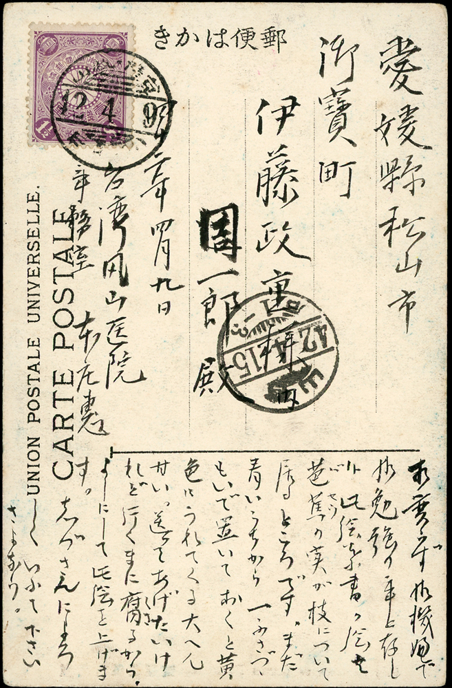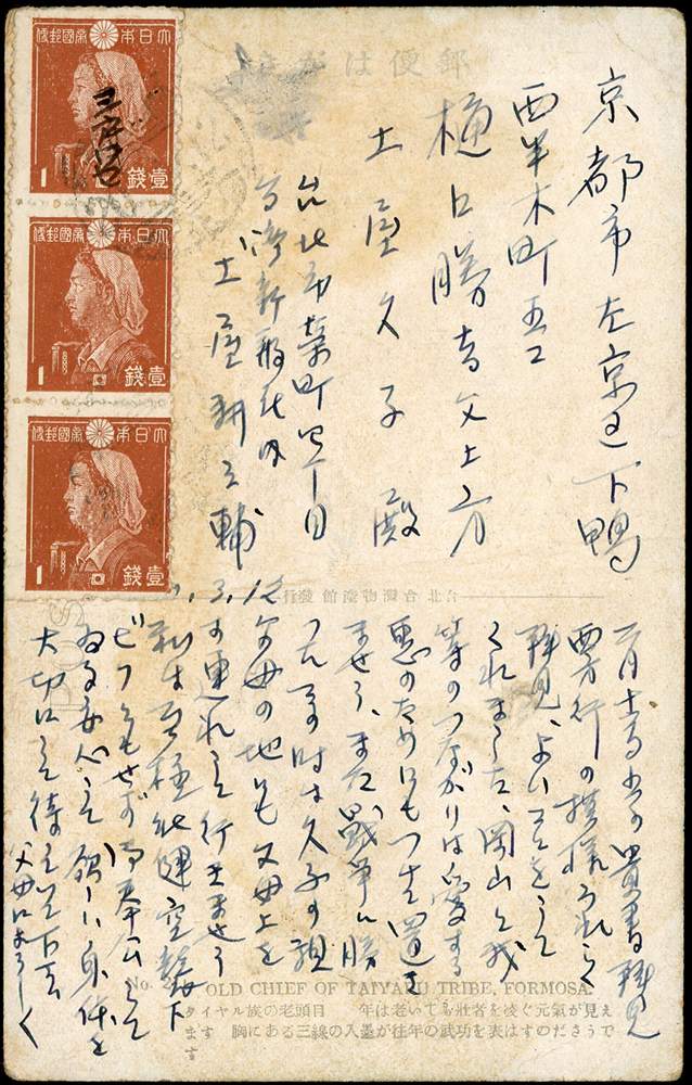 風景片寄日本二片:(1)1909年台灣名果芭蕉黑白片,貼日郵菊1.5錢1枚,銷鳳山42.4.9櫛型戳,日本松山42.4.15櫛型到戳;(2)1945年原住民彩色片,貼日郵1錢3枚,銷台北20.3.12櫛型戳,寄日本京都,片折痕(Page 58)