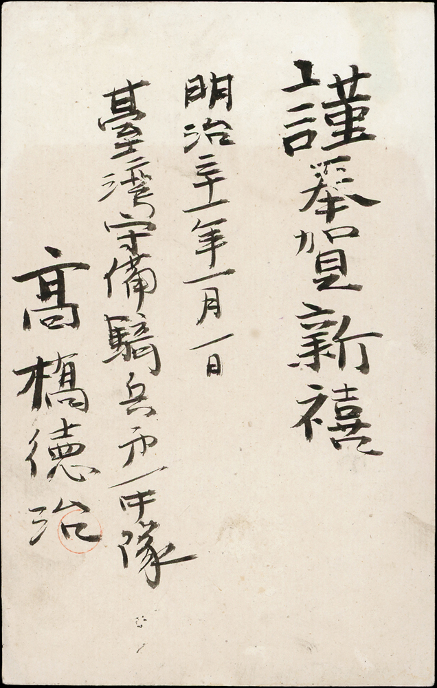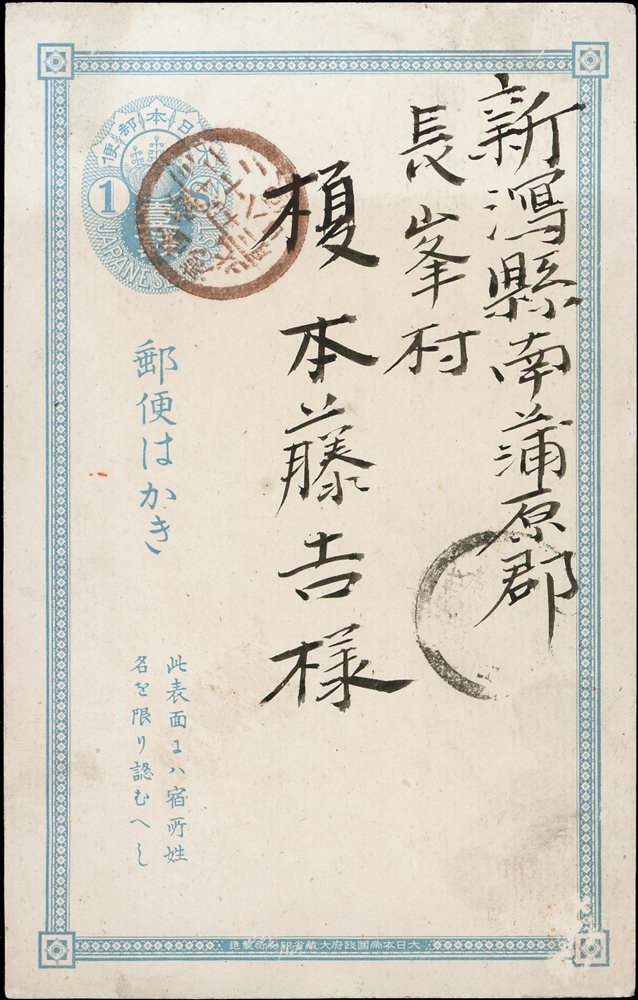 1897年日本小判1錢郵資片,自臺灣守備騎兵第一中隊寄新瀉縣,銷臺灣臺北三十年十二月二十八日丸一戳,日本岳後長峰丸一到戳(Page 59)