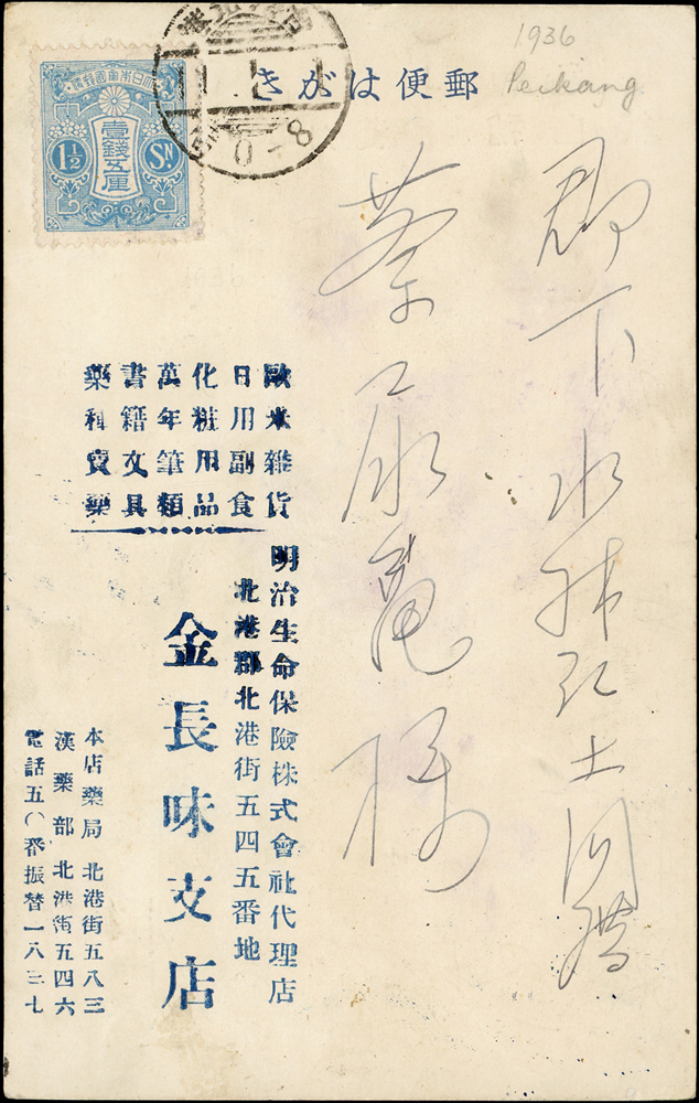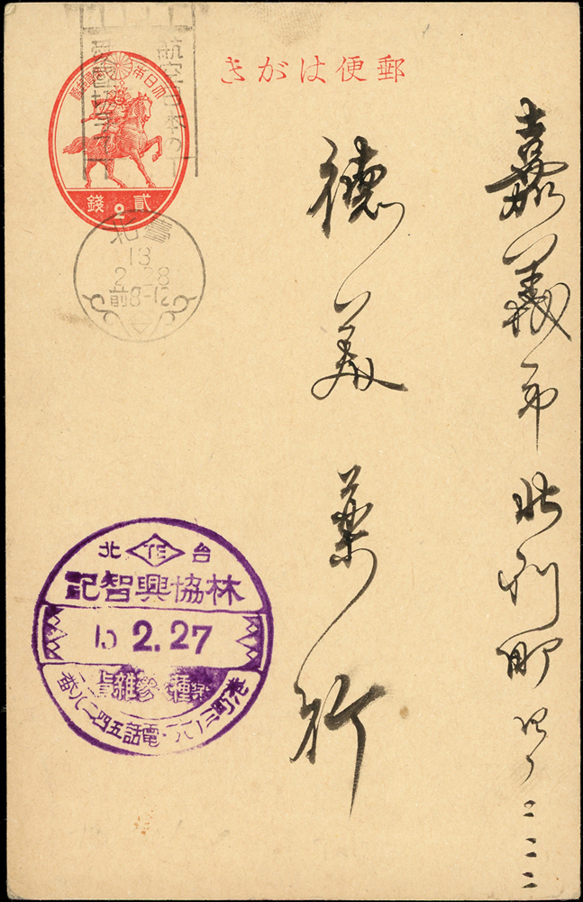 信封分類 大清郵政 1911年以前清代~國家郵政史(1082-1112)清代~商埠郵政史(1156-1158)在華客郵郵史(1168-1188)中華民國郵政 1912~1949年民國~郵政史(1424-1537)民國~名人封(1538-1547)民國~防盜(1548-1559)民國~首航封(1560-1570)民國~欠資封(1571-1574)民國~檢查封(1575-1599)民國~行動郵局/信櫃(1600-1613)兩岸通郵史(1933年-1989年)(1614-1632)民國~郵政匯兌(1633-1644)民國~民信局/僑批(1645-1651)民國~郵政明信片(1652-1659)民國~風景明信片(1660-1683)民國~國內及國際航空郵簡(1684-1703)日偽政權~郵政史(1714-1723)台灣 1888~2020年台灣~整批/整冊信封(3554-3583)日治時期~台灣郵史1895~1945(3601-3661)日治時期~台灣明信片(3662-3688)日治時期~台灣風景片(3689-3695)台灣老台幣時期~國父像火炬圖『限臺灣省用』明信片(3738-3739)台灣~老台幣時期郵政史1945~1949(3740-3815)台灣~自動化實寄封(4646-4647)台灣~新台幣時期郵政史(6001-6041)大陳島(6042)台灣~代辦所/欠資/首航(6043-6055)台灣~郵政匯兌(6056-6073)台灣~首日封(6074-6090)台灣~郵資封/郵政明信片(6091-6100)台灣~原圖卡(6101-6113)台灣~國內及國際航空郵簡(6114-6122)中國人民郵政 1949~2018年新中國~解放區郵史(6128-6140)新中國~郵政史(6277-6289)新中國~郵政匯兌/郵資封片(6290-6304)中國香港~郵政史(6314-6316)世界各國郵票日本郵政史(6327-6334)外國信封(A~Z)(6350-6365) 大清郵政 1911年以前 ↳清代~國家郵政史(1082-1112) ↳清代~商埠郵政史(1156-1158) ↳在華客郵郵史(1168-1188)中華民國郵政 1912~1949年 ↳民國~郵政史(1424-1537) ↳民國~名人封(1538-1547) ↳民國~防盜(1548-1559) ↳民國~首航封(1560-1570) ↳民國~欠資封(1571-1574) ↳民國~檢查封(1575-1599) ↳民國~行動郵局/信櫃(1600-1613) ↳兩岸通郵史(1933年-1989年)(1614-1632) ↳民國~郵政匯兌(1633-1644) ↳民國~民信局/僑批(1645-1651) ↳民國~郵政明信片(1652-1659) ↳民國~風景明信片(1660-1683) ↳民國~國內及國際航空郵簡(1684-1703) ↳日偽政權~郵政史(1714-1723)台灣 1888~2020年 ↳台灣~整批/整冊信封(3554-3583) ↳日治時期~台灣郵史1895~1945(3601-3661) ↳日治時期~台灣明信片(3662-3688) ↳日治時期~台灣風景片(3689-3695) ↳台灣老台幣時期~國父像火炬圖『限臺灣省用』明信片(3738-3739) ↳台灣~老台幣時期郵政史1945~1949(3740-3815) ↳台灣~自動化實寄封(4646-4647) ↳台灣~新台幣時期郵政史(6001-6041) ↳大陳島(6042) ↳台灣~代辦所/欠資/首航(6043-6055) ↳台灣~郵政匯兌(6056-6073) ↳台灣~首日封(6074-6090) ↳台灣~郵資封/郵政明信片(6091-6100) ↳台灣~原圖卡(6101-6113) ↳台灣~國內及國際航空郵簡(6114-6122)中國人民郵政 1949~2018年 ↳新中國~解放區郵史(6128-6140) ↳新中國~郵政史(6277-6289) ↳新中國~郵政匯兌/郵資封片(6290-6304) ↳中國香港~郵政史(6314-6316)世界各國郵票 ↳日本郵政史(6327-6334) ↳外國信封(A~Z)(6350-6365) 點大圖放大展示,點小圖切換 明信片二片:(1)1922年北港寄本埠私片,貼田澤1.5錢1枚,銷北港11.1.1櫛型戳;(2)1938年楠公2錢片,機銷台北13.2.28,寄嘉義(Page 60) 結標時間 2025-12-16 10:58:40 拍品編號:3677 起拍價:NT$100 當前價:NT$100 自動出價 直接出價 出價 系統將按出價級數,依序為您比(出)價至上限金額 提醒您:直接出價後不可將金額改低,只能改高,蟠龍無法降低您的出價,最高出價者無法取消出價 (查看出價說明) 得標說明:需按得標價另加10%佣金 當前加價幅度:NT$0元 (查看加價級數表) 回上頁 線上出價記錄 線上 0 人次,書面 0 人次 競價客戶 所在地 出價時間 出價金額 出價方式 問與答 目前尚無提問 我要提問 請先登入會員