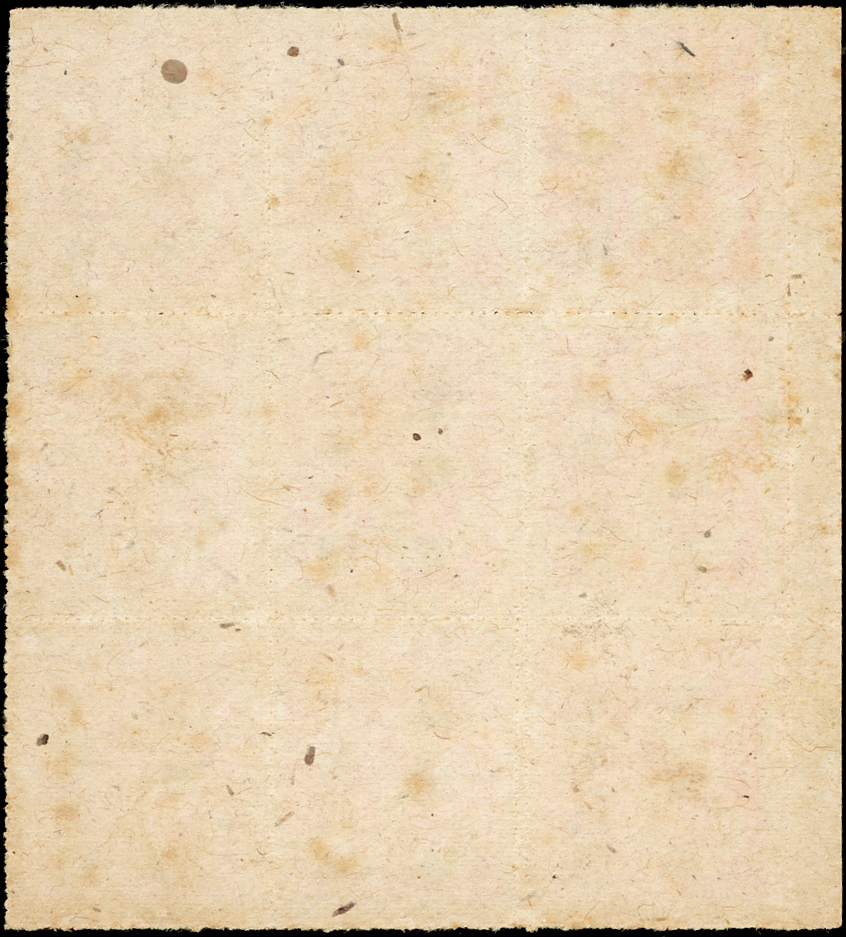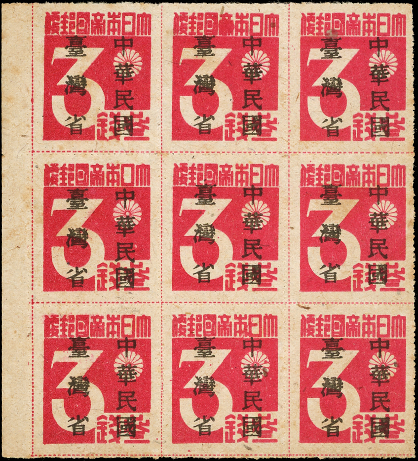 常台1.日郵數字加蓋中華民國台灣省3錢9方連帶左邊紙,原票第52號票位『帝』字破版,第53號票位『大』字中間多一橫線,第61號票位為大口『日』,第72號票位『大』字上方多一點;微黃斑,VF-F(Page 60)