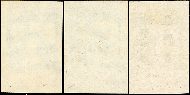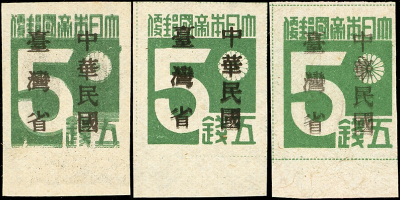 常台1.日郵數字加蓋中華民國台灣省5錢新票3枚,均帶下大寬邊,均原票複印及加蓋複蓋變體:(1)第一枚原票明顯複印無邊框線,且原票左下角缺口及右上角多一墨點;(2)第二.三枚加蓋複蓋且輕重油墨;三枚原票刷色綠與藍綠身與淺分色,VF(Page 61)