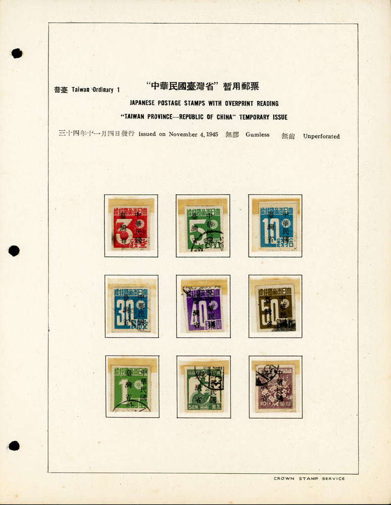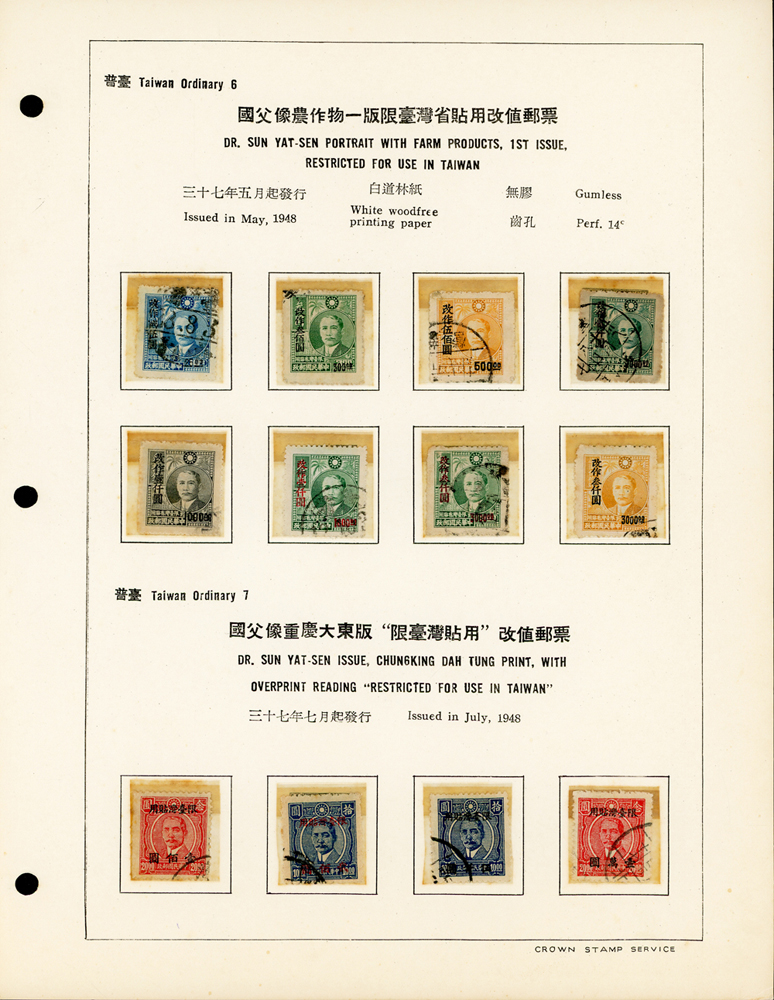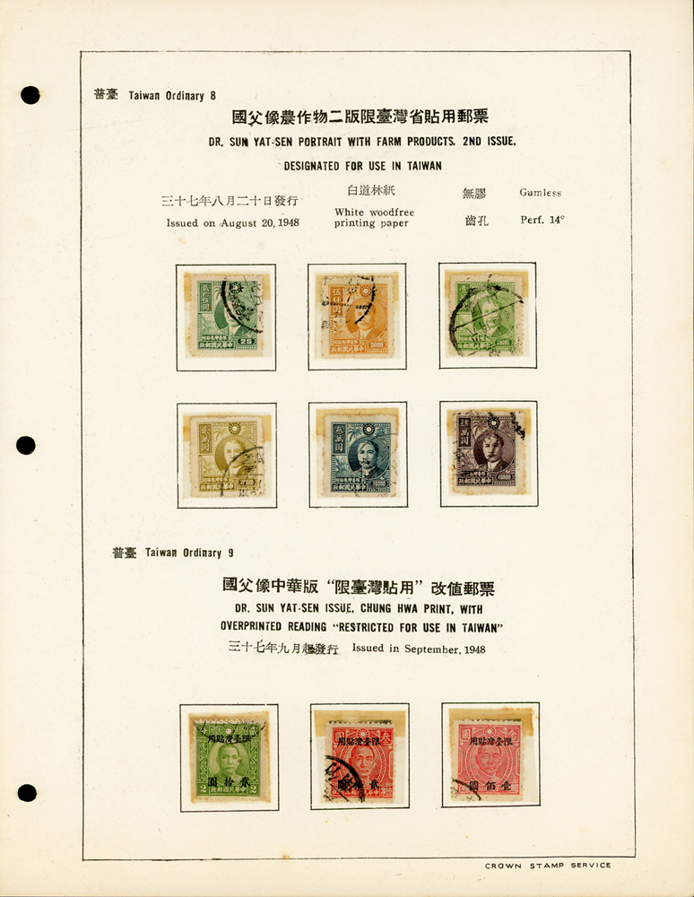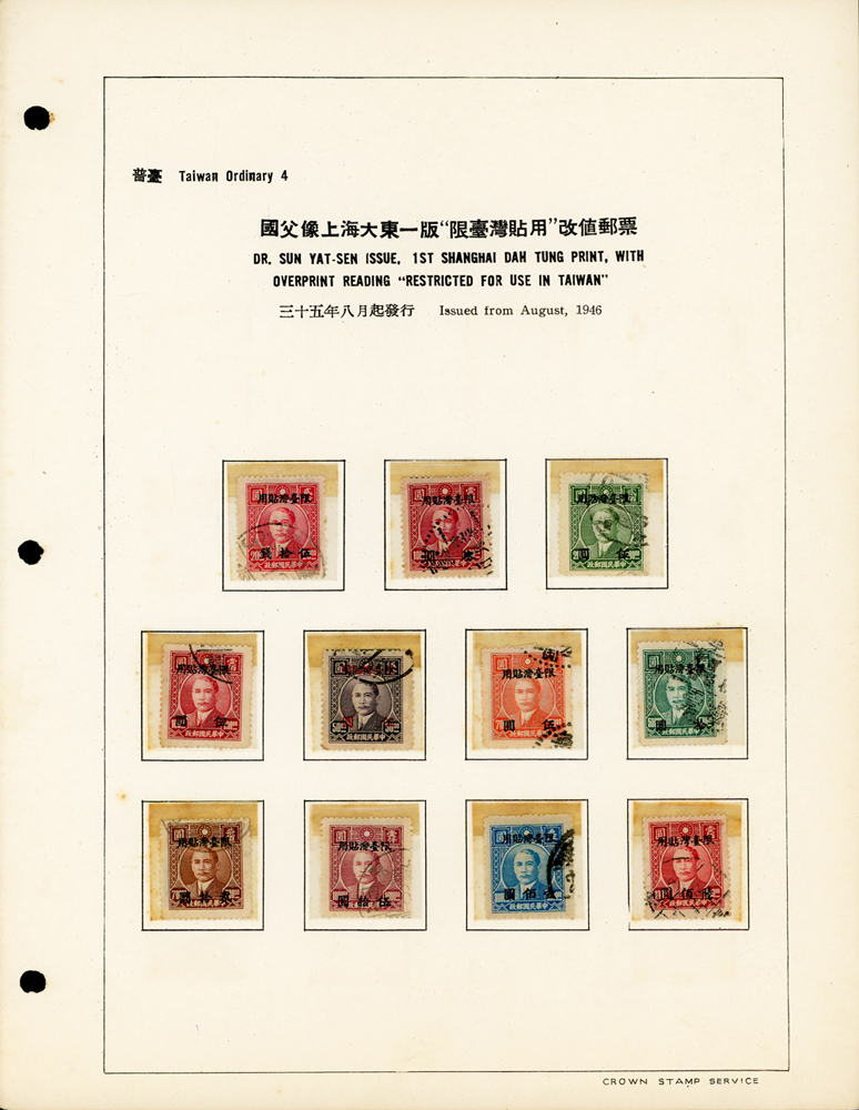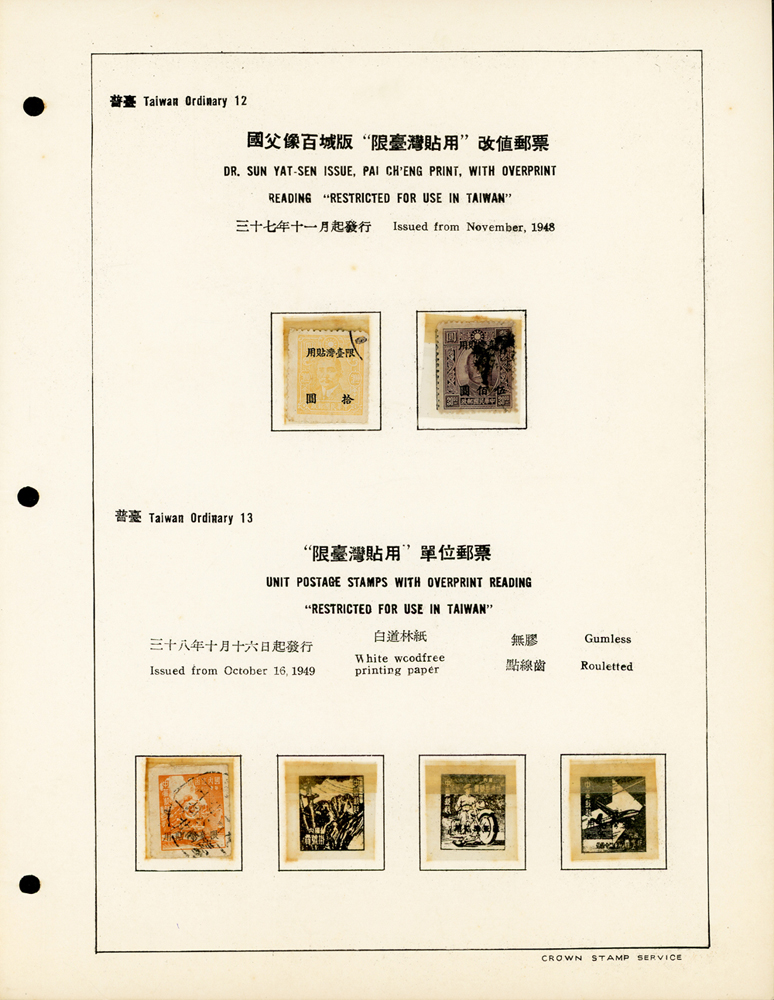台灣老台幣時期舊票常台1~常台12,共12套,均整理於定位卡上,其中普台7及普台10關鍵票真品,另附普台13限臺灣貼用單位郵票-國內信函舊票1枚,先烈像香港版限臺灣貼用改值30錢新票1枚,F-VF(Page 61)