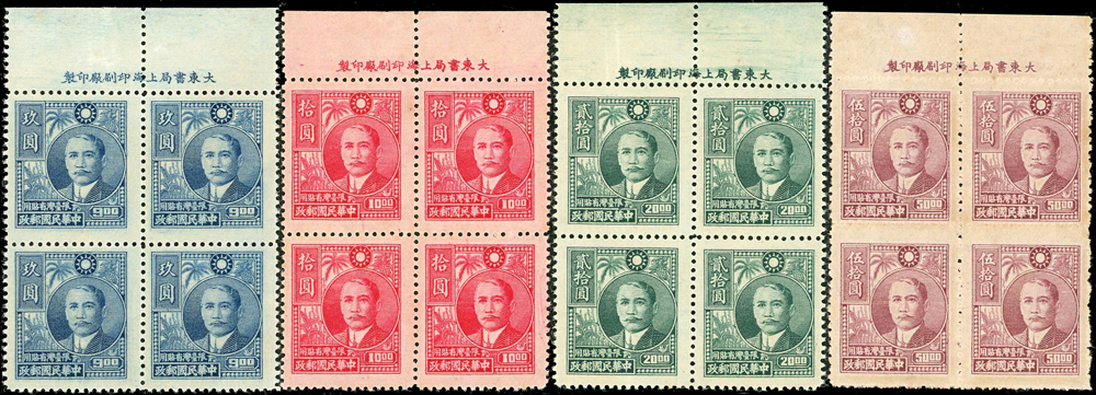民國時期郵票二套:(1)紀新5.孫總理國葬限新省貼用新票4全,其中1元無膠,其餘原膠輕貼,沒有明顯黃斑,VF-F;(2)紀9.孫總理國葬紀念4全,1元為新票,其餘為舊票,無膠,VF-F(Page 125)