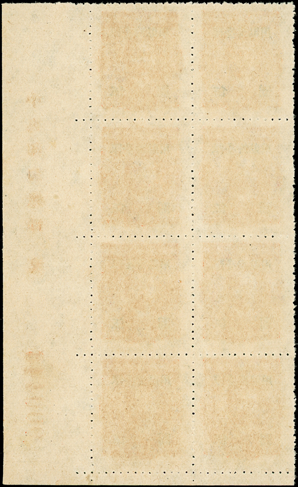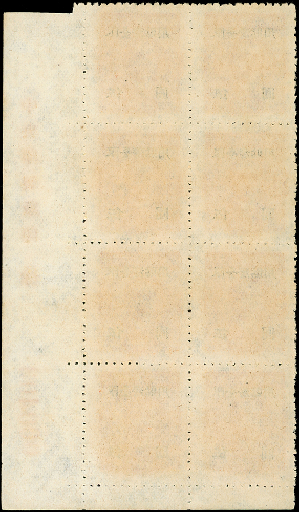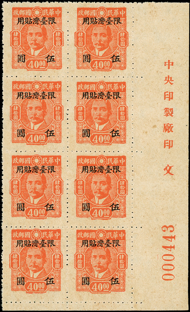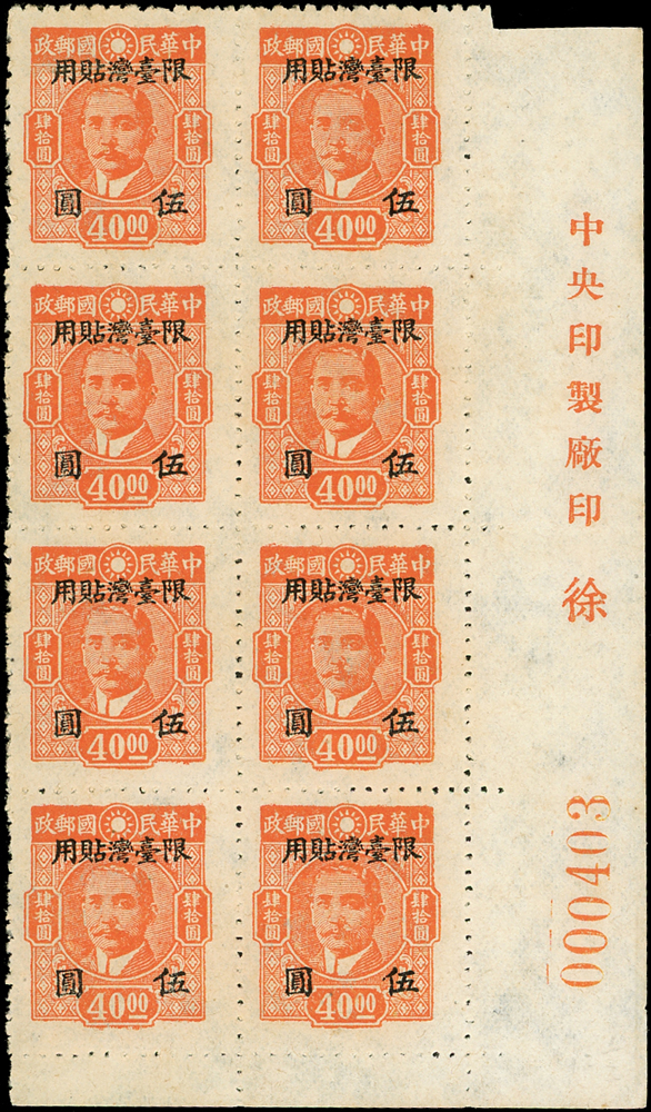 常台11.國父像中央版限台改值5元8方連新票二件,帶右下角雙邊紙廠銘及張號,技師工銘分別為『文』及『徐』字,其中第160號票位『伍』字下方多一墨點,第200號票位『伍』字第一撇破版,二件比對可證為固定版式;VF(Page 62)