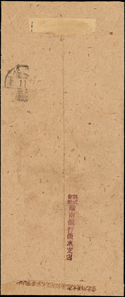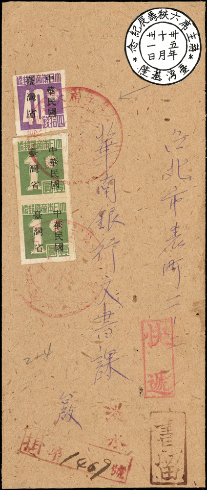 老台幣第2期快信郵資尾日封(35.6.1-35.10.31):1946年基隆寄台北快信封,貼日郵數字40錢1枚及1元2枚,銷紅色蔣主席六秩壽辰/台灣基隆/卅五年十月卅一日紀念戳,旁另蓋『淡水』及『掛/第1069號』『快遞』『書留』章(Page 64)