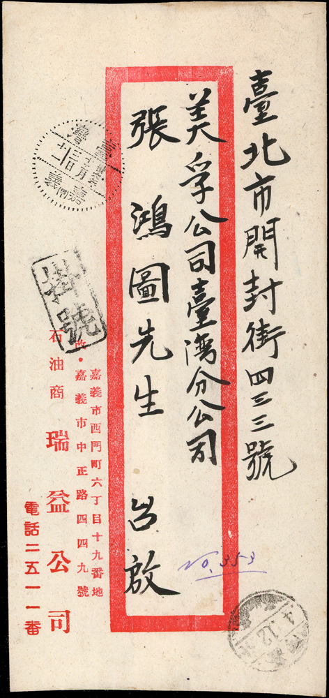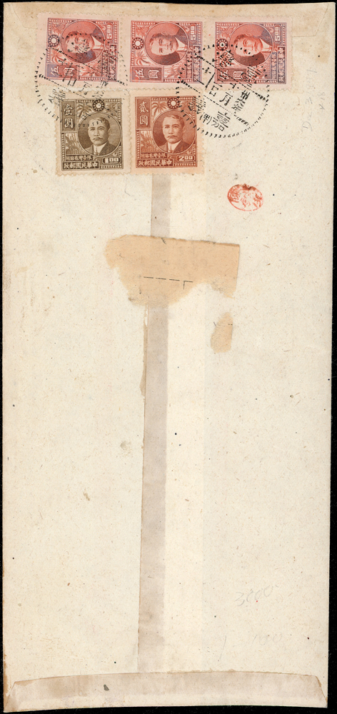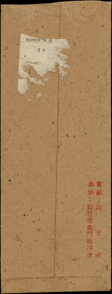 老台幣第6期掛號及快信郵資各一件(36.10.1-36.12.10):(1)1948年嘉義寄台北掛號封,背貼國父像農作物一版限台1元,2元及5元3枚,銷嘉義卅六年十二月三日,台北同日到戳;(2)1947年新竹寄苗栗雙公館掛號封,貼國父像農作物一版限台5元1枚及10元2枚,銷新竹卅六年十二月八日;兩件福州戳型內均崁入『年』字(Page 65)