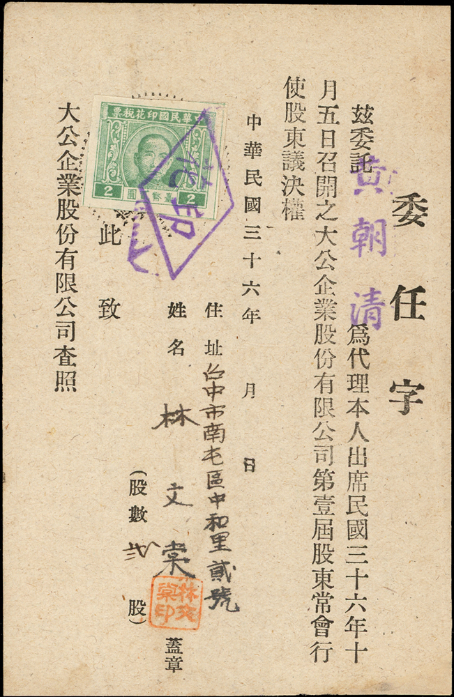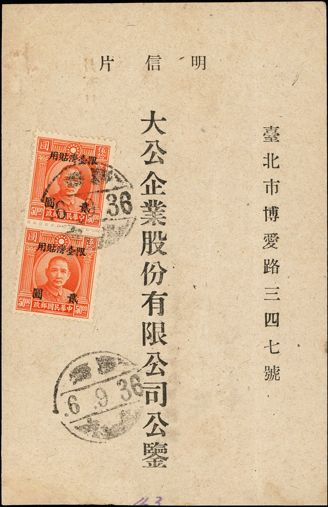 老台幣第5期明信片郵資二件(36.7.16-36.9.30),均貼4元郵資:(1)片銷彰化36.8.27,中壢36.8.28到戳;(2)片銷台中36.9.6,台北同日到戳,背面加貼2元印花稅票1枚(Page 65)