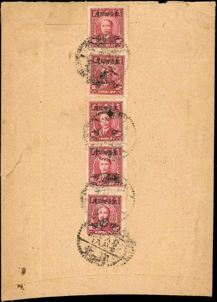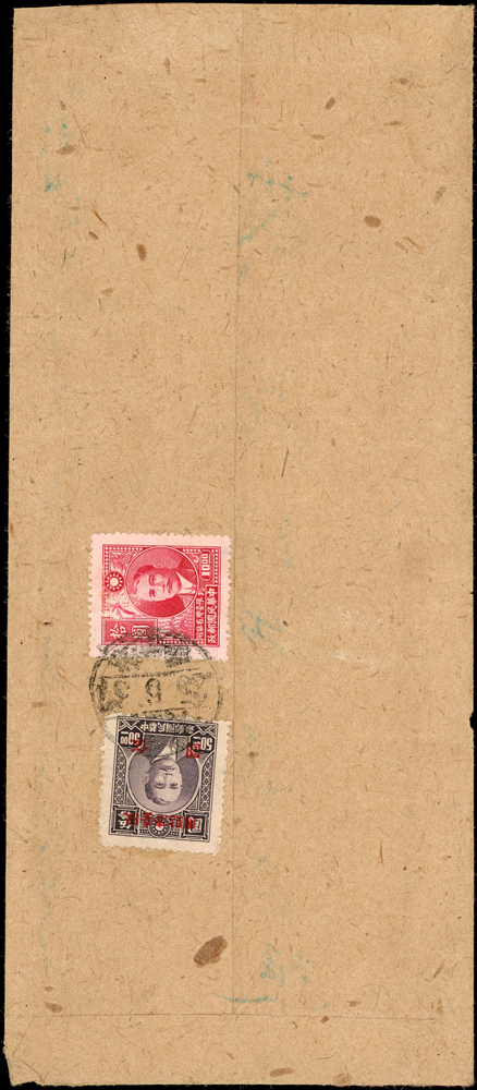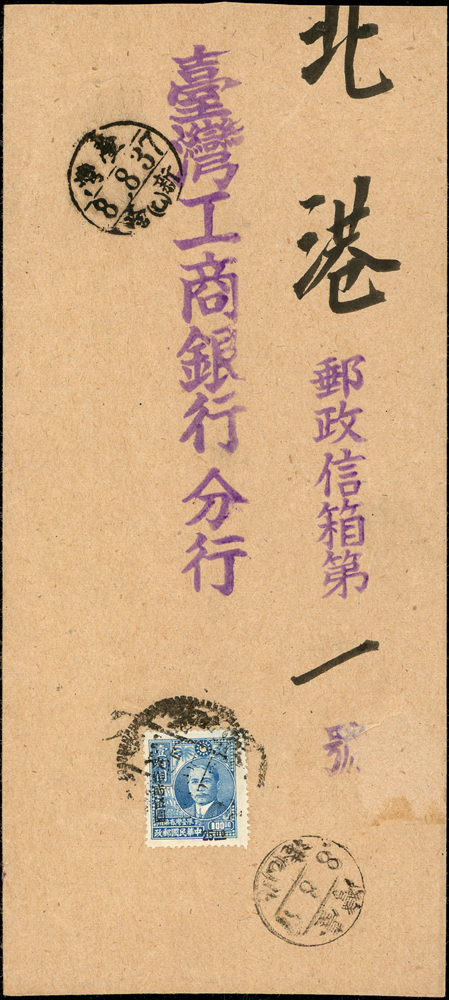 老台幣第8期印刷品及平信郵資三件(37.4.5-37.11.18):(1)1948年桃園寄新埔印刷品封,背貼票2枚計15元,銷桃園37.6.25,新埔37.6.26到戳;(2)1948年台北寄北港平信,貼國父像農作物一版限台改值25元1枚,銷台北卅七.八月七日(福州型日戳),北港37.8.8小圓到戳;(3)1948年台北寄本埠平信封,背貼常台4.5元5枚,銷台北卅七.八月卄七,台北隔日到戳(Page 65)