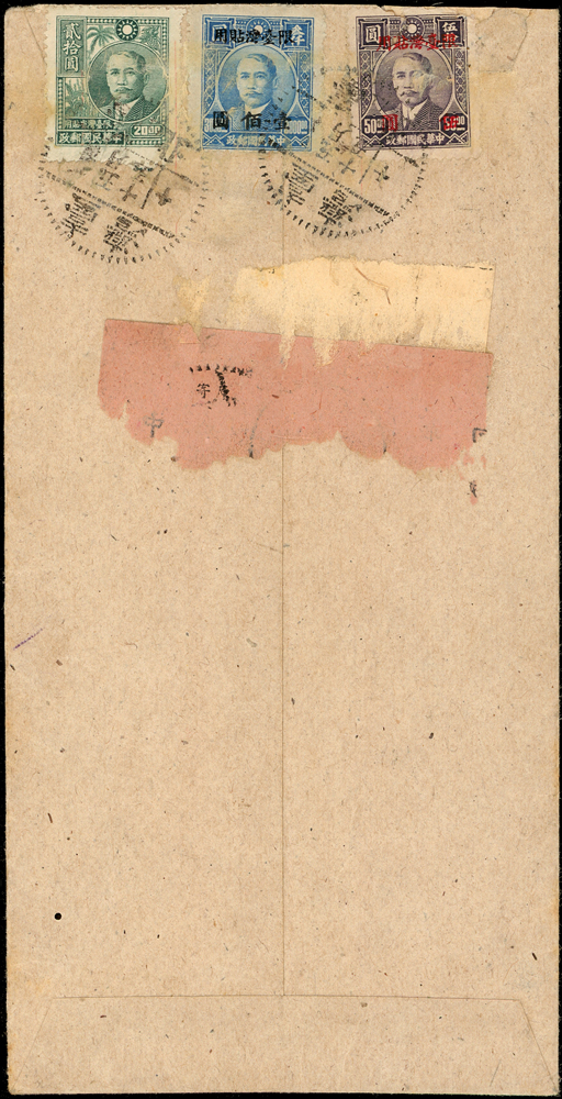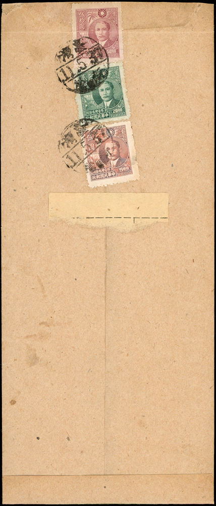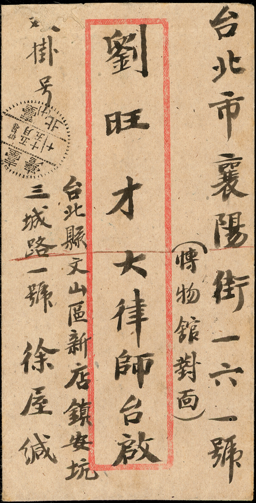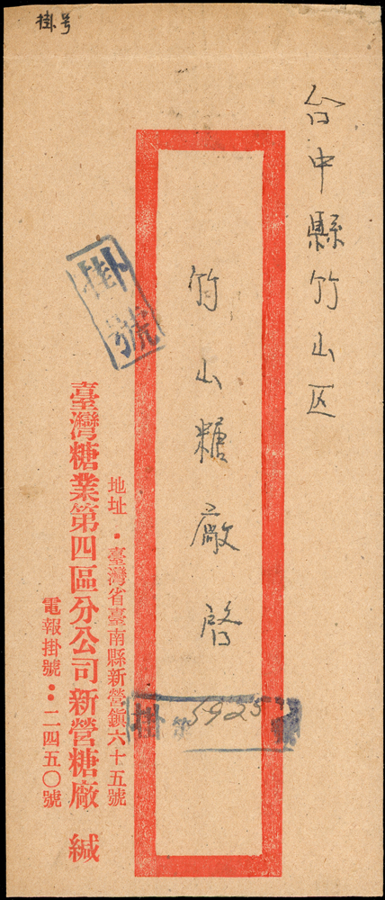 老台幣第8期掛號及雙掛號郵資封各一件(37.4.5-37.11.18):(1)1948年台南寄台中竹山掛號封,背貼常台5.5元,20元及50元各一枚,銷新營37.5.11小圓日戳,正面另蓋長框掛號章;(2)1948年台北寄本埠雙掛號封,背貼票3枚計125元,銷台北卅七.五月十五,台北同日到戳;兩件均銷不同戳型(Page 66)