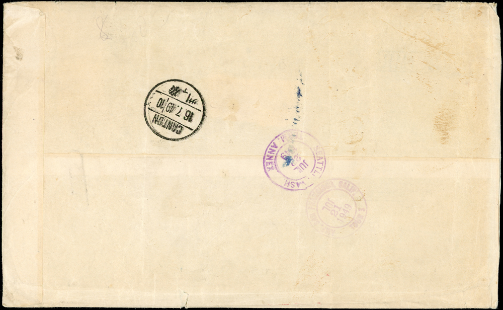 1949年台北寄美國航掛封,貼國父像上海大東二版限台改值20萬元(關鍵票)直雙連,國父像農作物一版限台改值2000元1枚,銷台北49.7.14戳,經廣州49.7.16,西雅圖1949.7.22到戳(Page 66)