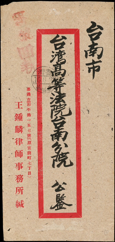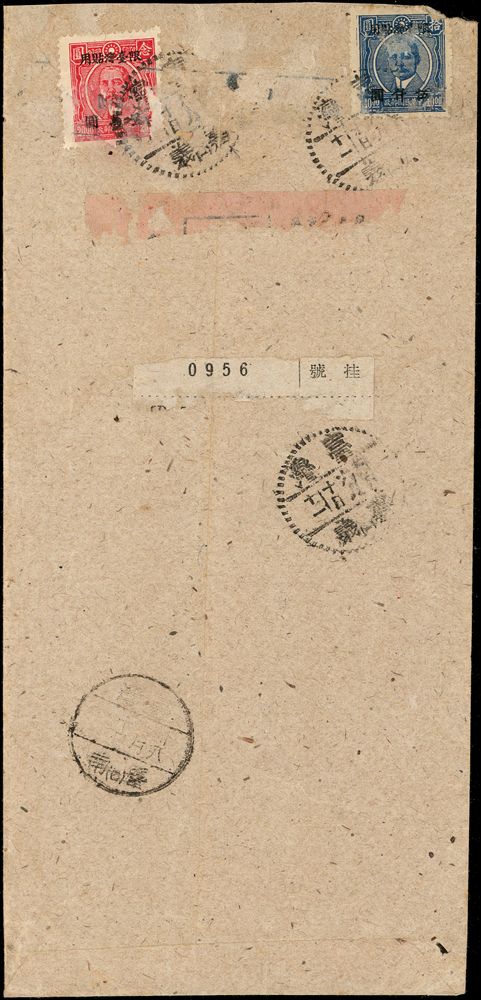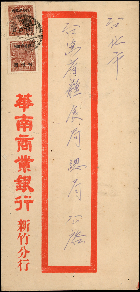 老台幣第13期平信及雙掛號郵資(38.5.1-38.6.14):(1)1949年新竹寄台北,貼票2枚計1600元(溢貼100元),銷新竹卅八年五月十一,台北五月十二到戳;(2)1949年嘉義寄台南雙掛號封,背貼票2枚計15000元(票局部損),銷嘉義卅八年六月十日,台南同日到戳(Page 66)