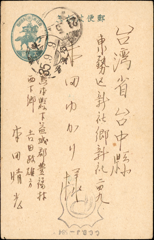 1946年楠公5錢片,銷熊本21.5.16(昭和21年),寄台中東勢35.9.9櫛型到戳,旁另銷C.C.D.J-584美軍檢查戳;政權轉移之際,此片郵程近四個月才抵達(Page 66)