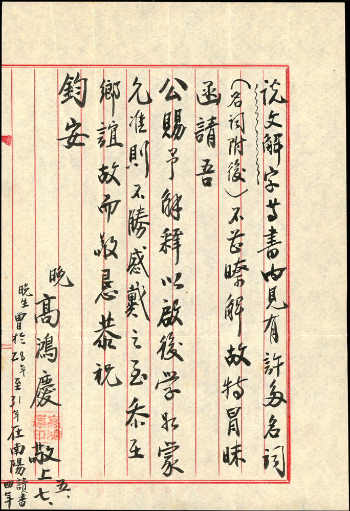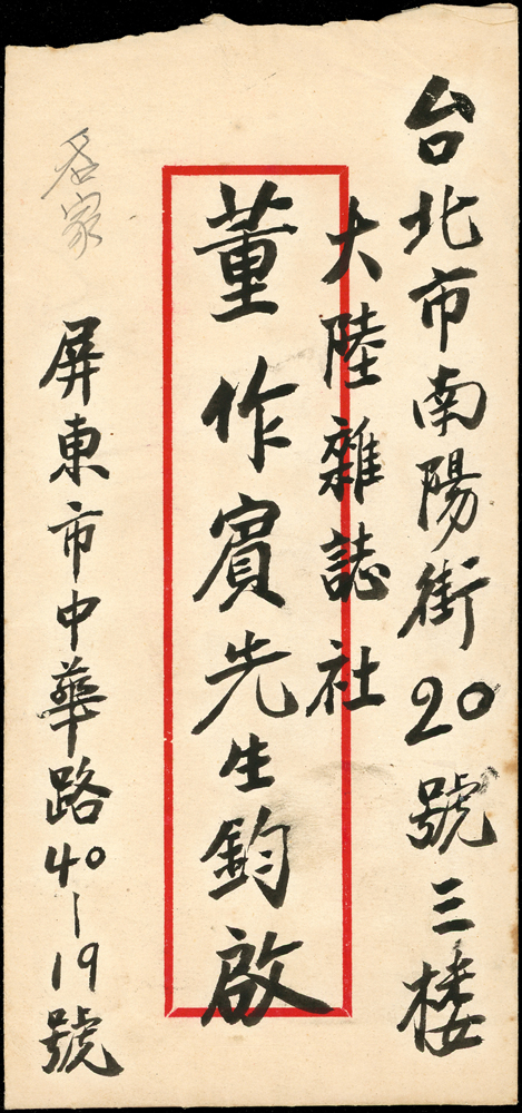 名人書信:1955年屏東寄台北掛號封,背貼鄭像1元1枚及改值2角1枚,反共義士4角1枚,銷屏東四四年五月八日,台北同日到戳,附內信 註:董作賓(1895年3月20日—1963年11月23日),原名作仁,入私塾後改名作賓,字彥堂,一字雁堂,號平廬。河南南陽人。知名文史學者,在考古學、殷商史、文字學、書法及篆刻藝術等方面頗有貢獻。曾任福建協和大學、中州大學教授,國立中山大學副教授,國立臺灣大學文學院和臺灣省立師範學院教授。1951年1至1955年8月,任國立中央研究院歷史語言研究所所長(by 維基百科)(Page 67)