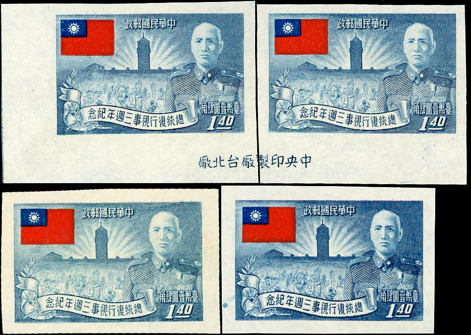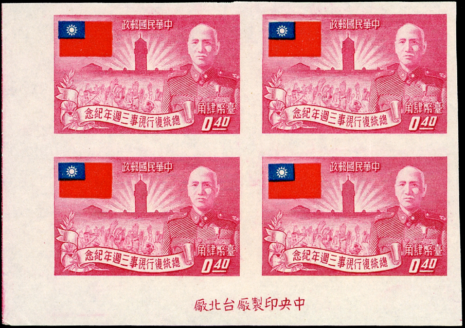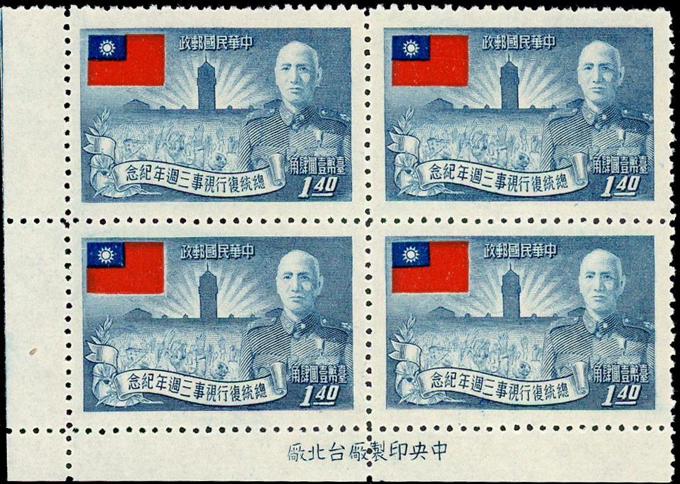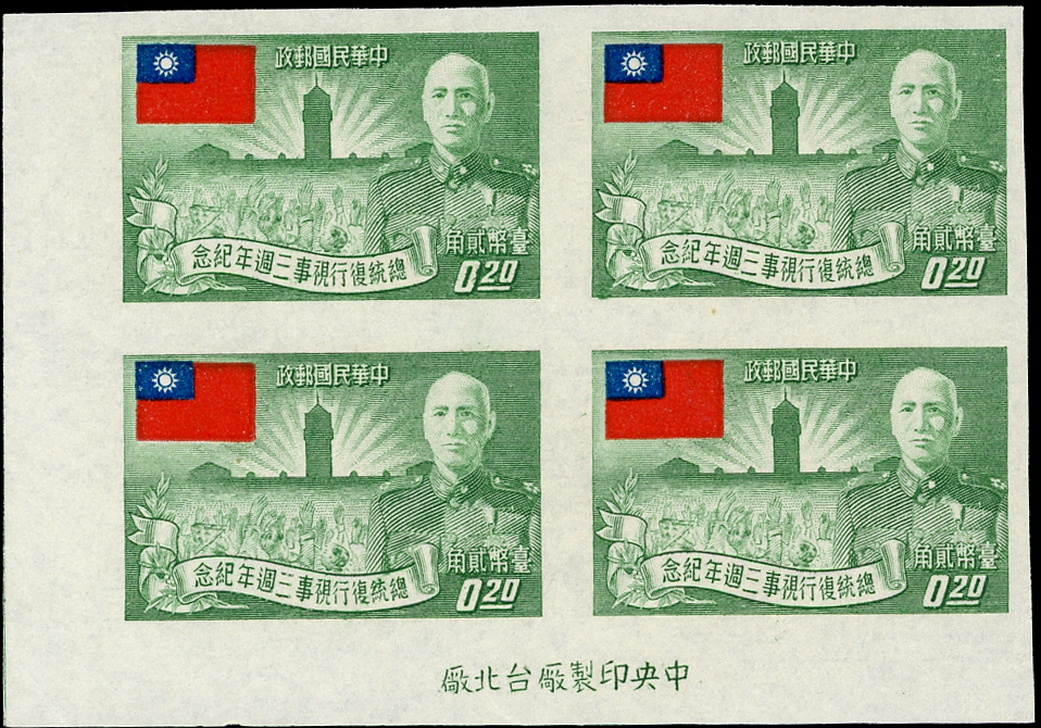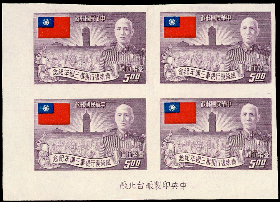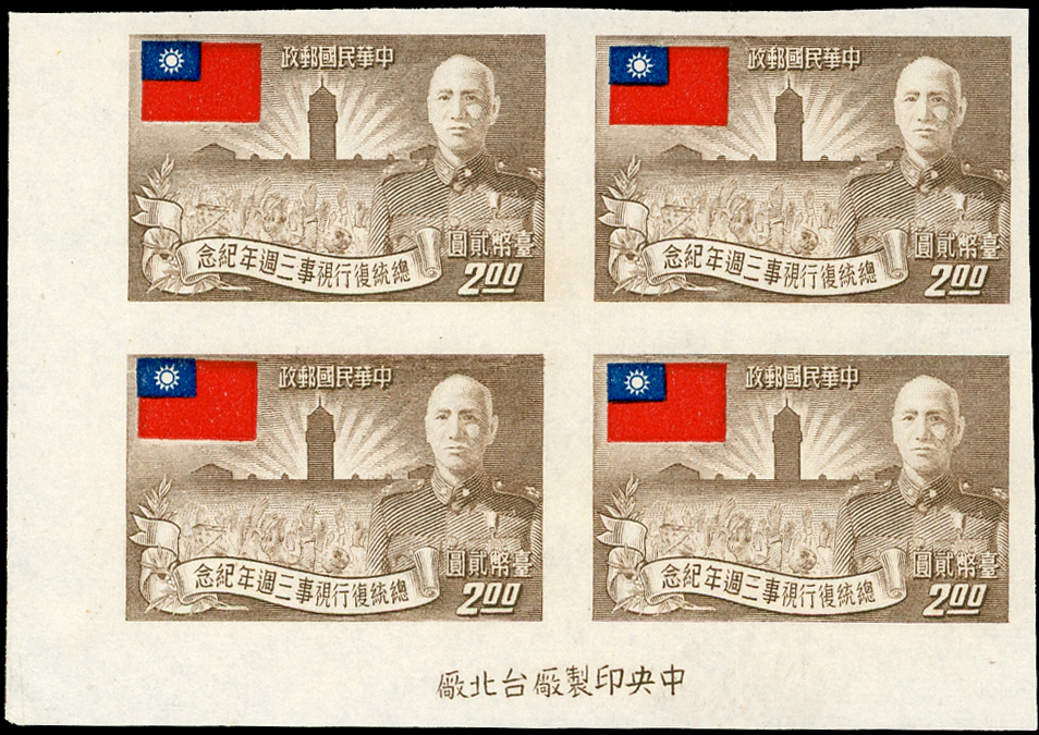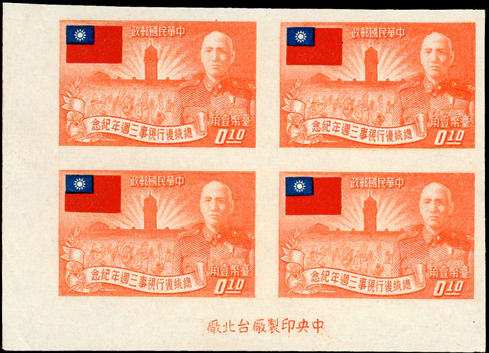 紀36.總統復行視事三週年有齒.無齒12全4套,有齒均為4方連,其中1角及4角帶同位左上角雙邊紙廠銘(背面少許原紙雜點),其餘均帶同位左下角雙邊紙廠銘,無齒1.4元為單枚4枚,其中2枚帶邊紙或雙邊紙,其餘均為4方連帶同位左下角雙邊紙廠銘,無黃斑,VF-F(Page 70)