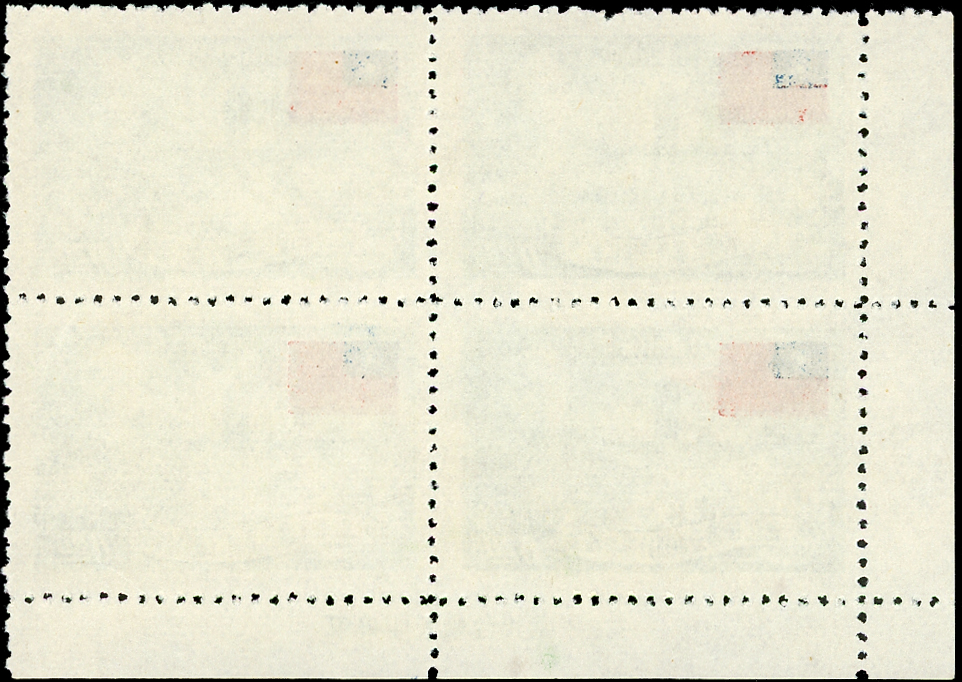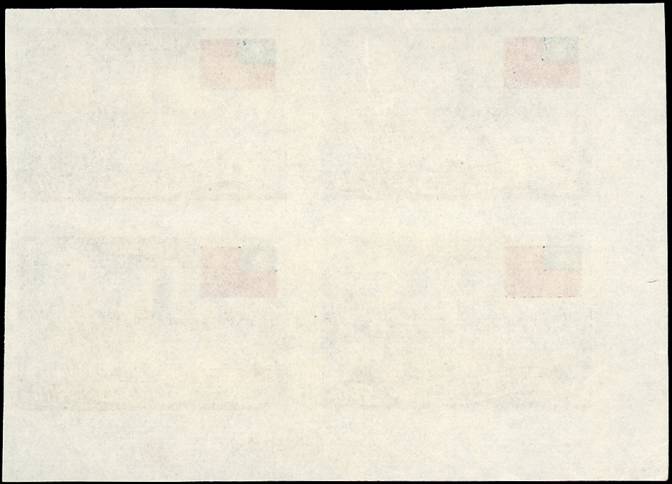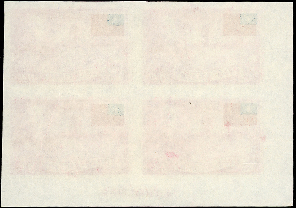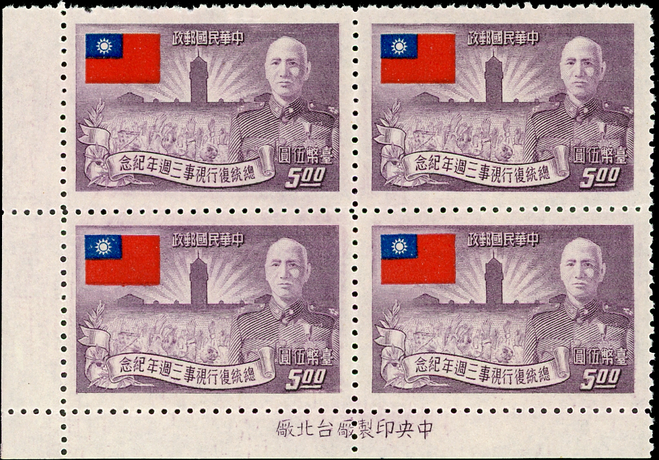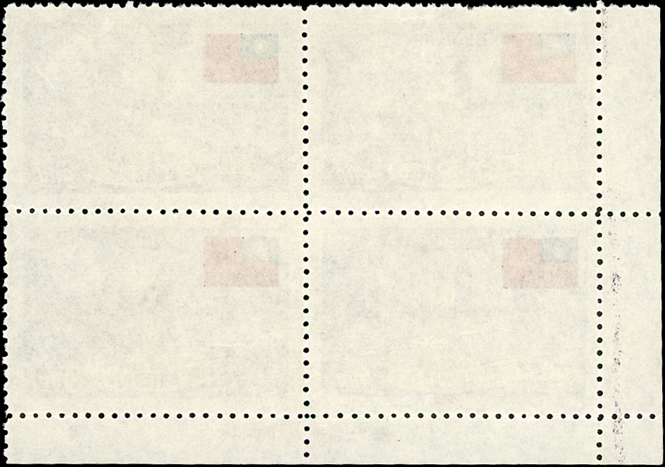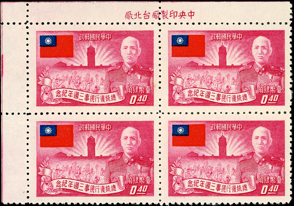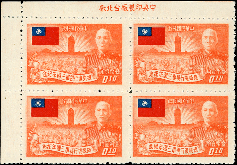紀36.總統復行視事三週年有齒.無齒12全4套,有齒均為4方連,其中1角及4角帶同位左上角雙邊紙廠銘(背面少許原紙雜點),其餘均帶同位左下角雙邊紙廠銘,無齒1.4元為單枚4枚,其中2枚帶邊紙或雙邊紙,其餘均為4方連帶同位左下角雙邊紙廠銘,無黃斑,VF-F(Page 70)