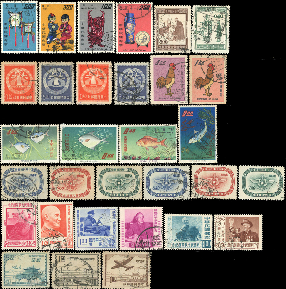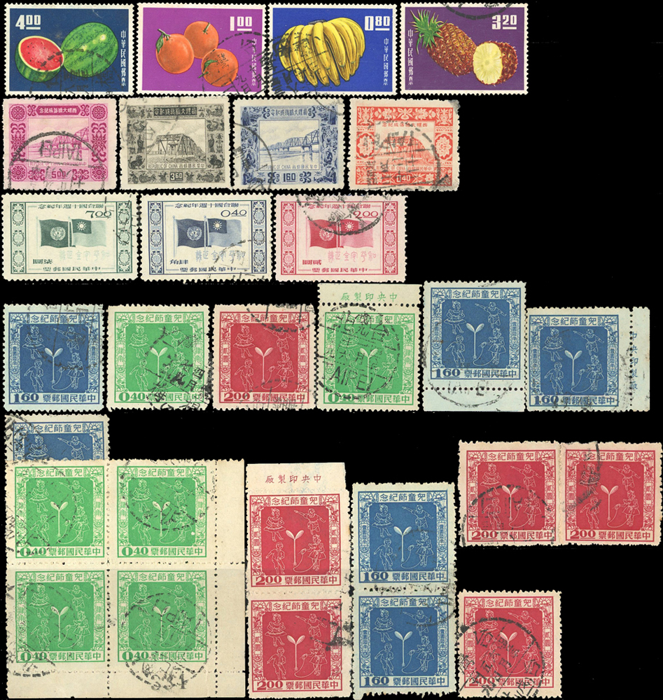 台灣早期舊票19套,包括:西螺大橋落成.聯合國十週年.台北版航空.臺灣水果(53年版).一輪雞.蔣總統七秩華誕.臺灣魚類(54年版).母教.臺灣手工藝產品(56年版)各1套,兒童節6套,軍人節.第二屆華僑節各2套,VF-F