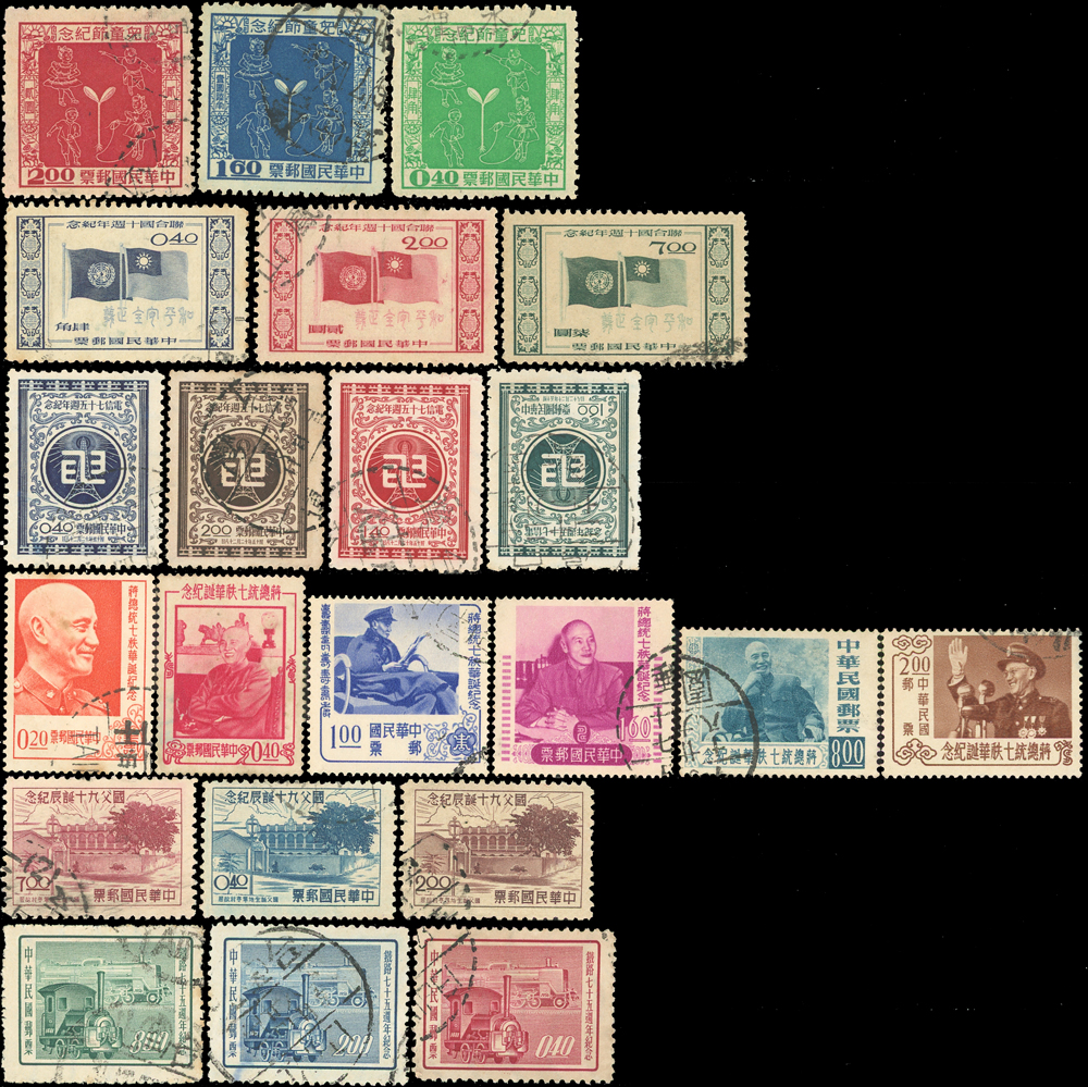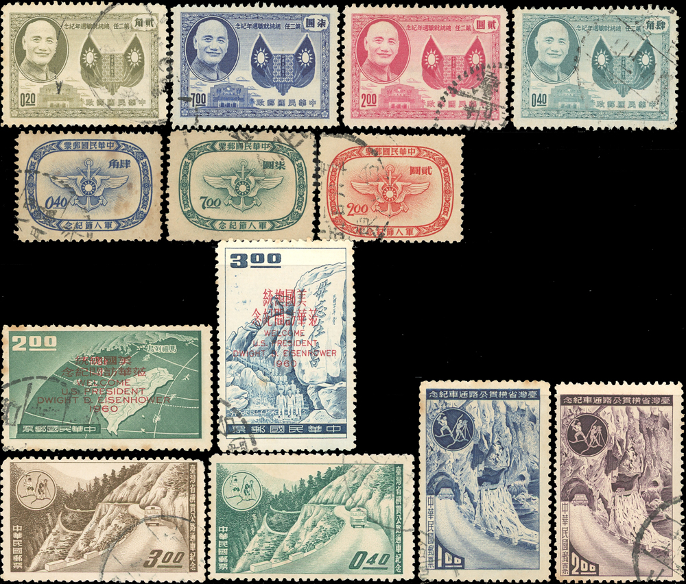 台灣早期舊票十套,包括:軍人節.第二任總統就職週年.聯合國十週年.兒童節.電信七十五週年.鐵路七十五週年.國父九十誕辰.蔣總統七秩華誕紀念.美國艾森豪總統蒞華訪問紀念.臺灣省橫貫路通車紀念,微黃,VF-F