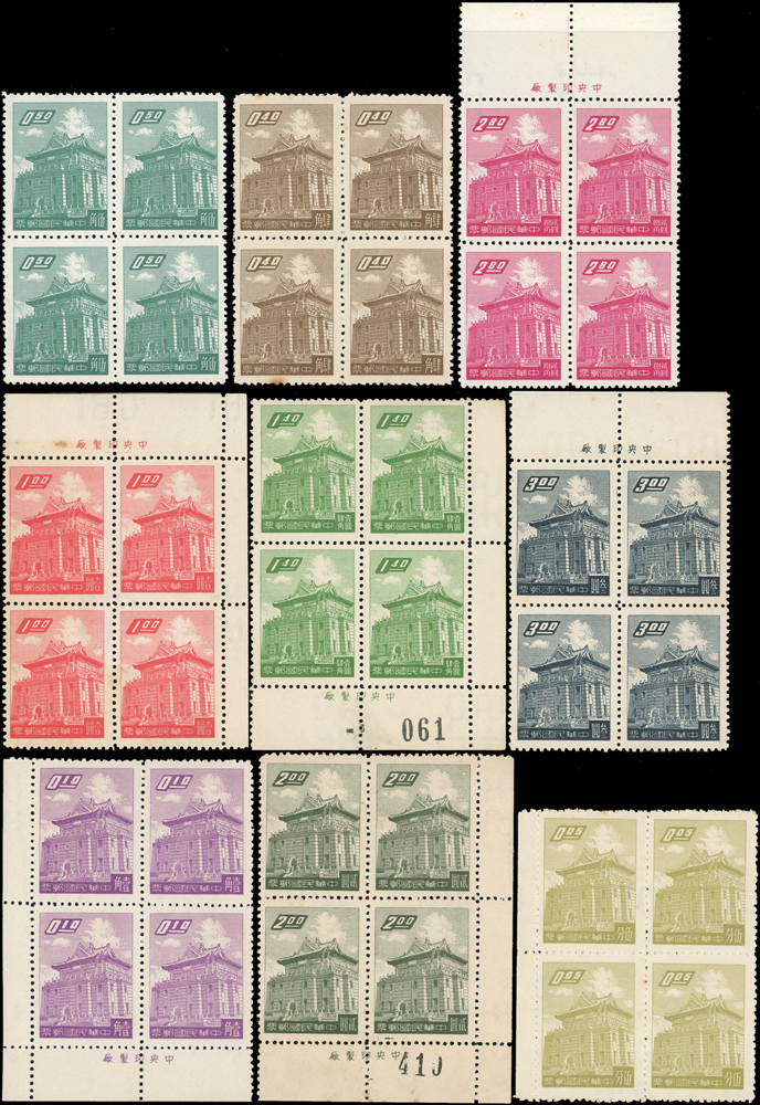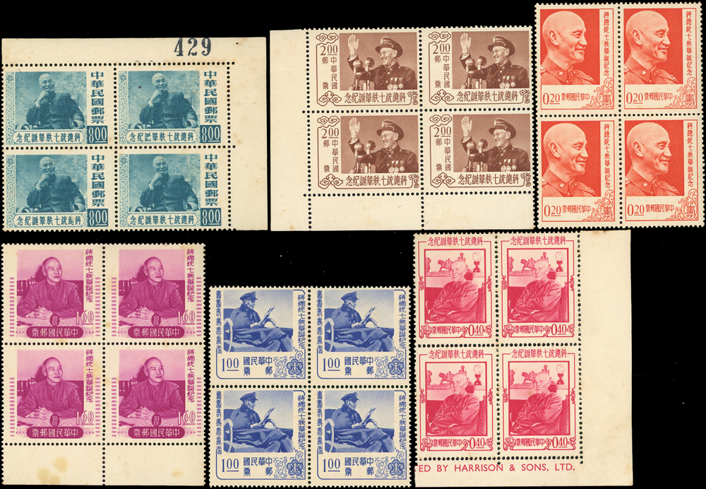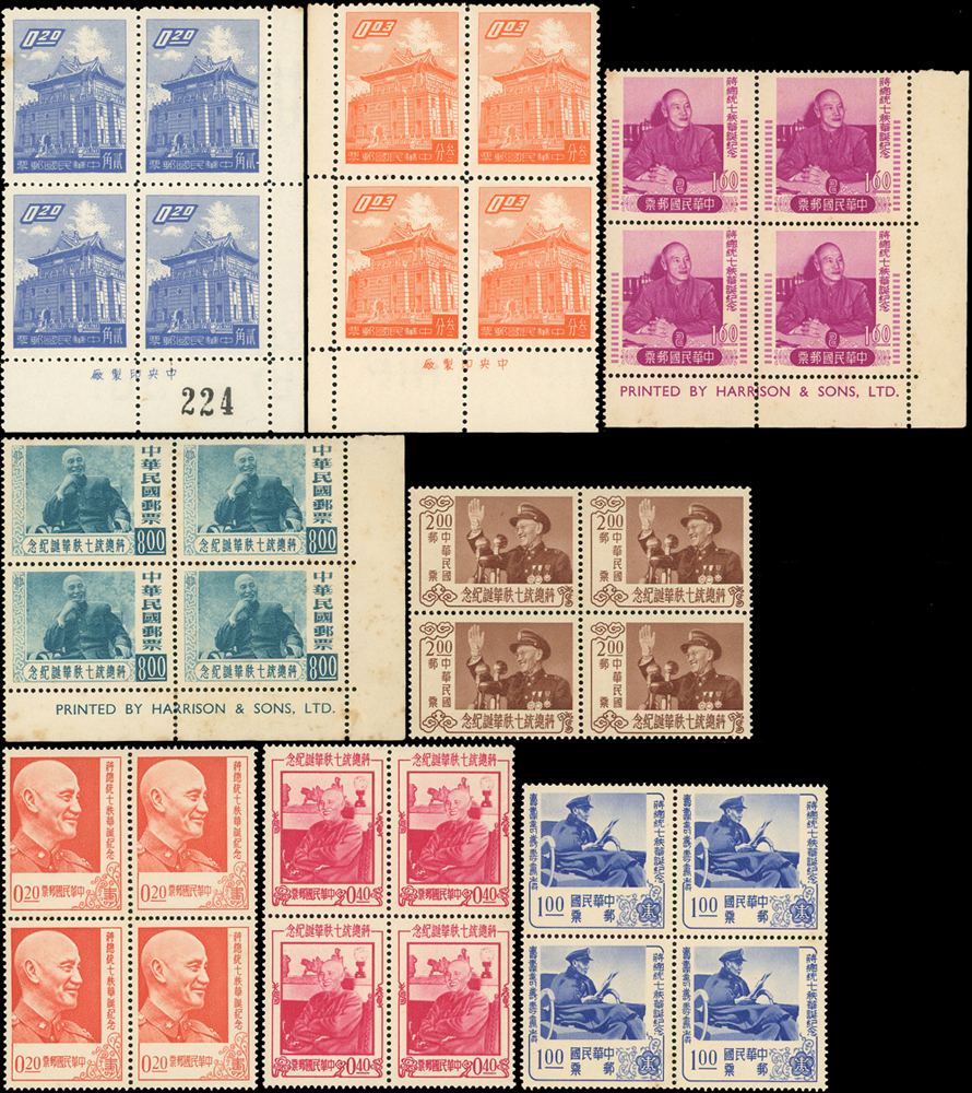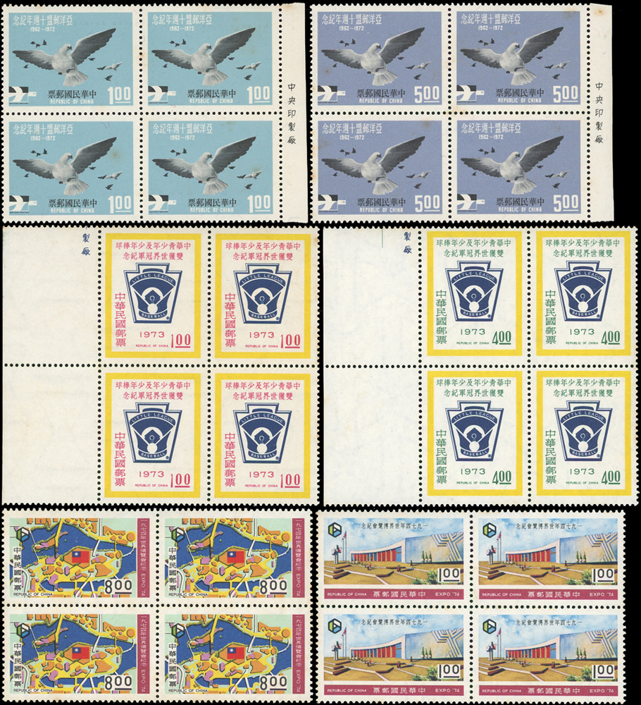 台灣中早期新票方連8組,共32套,包括:蔣總統七秩華誕紀念2組,玉照閱兵.一輪牛.一版莒光樓.亞洋郵盟十週年.中華青少年及少年棒球雙獲世界冠軍紀念.一九七四年世界博覽會各1組,品像混合,多數背淡黃或斑點,VF-F;歡迎至官網瀏覽全貌
