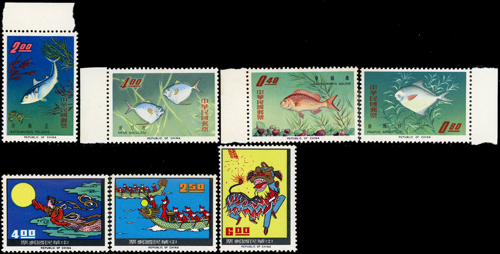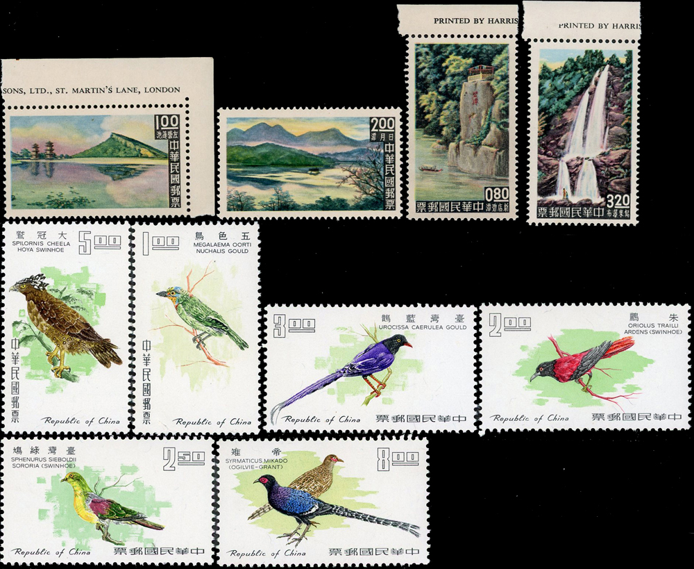 台灣早期新票四套,均原膠,包括:(1)專22.臺灣風景(50年版)4全,背均勻黃,F-VF;(2)專49.臺灣鳥類6全,無黃斑軟印痕,1元左下角原紙皺痕,VF-F;(3)專34.臺灣魚類4全,4角及8角背淡黃斑,VF-F;(4)專40.民俗(55年版)3全,2.5元背局部齒緣淡黃,VF-F