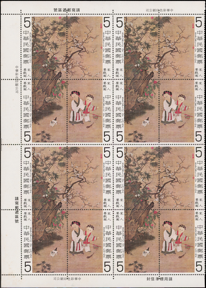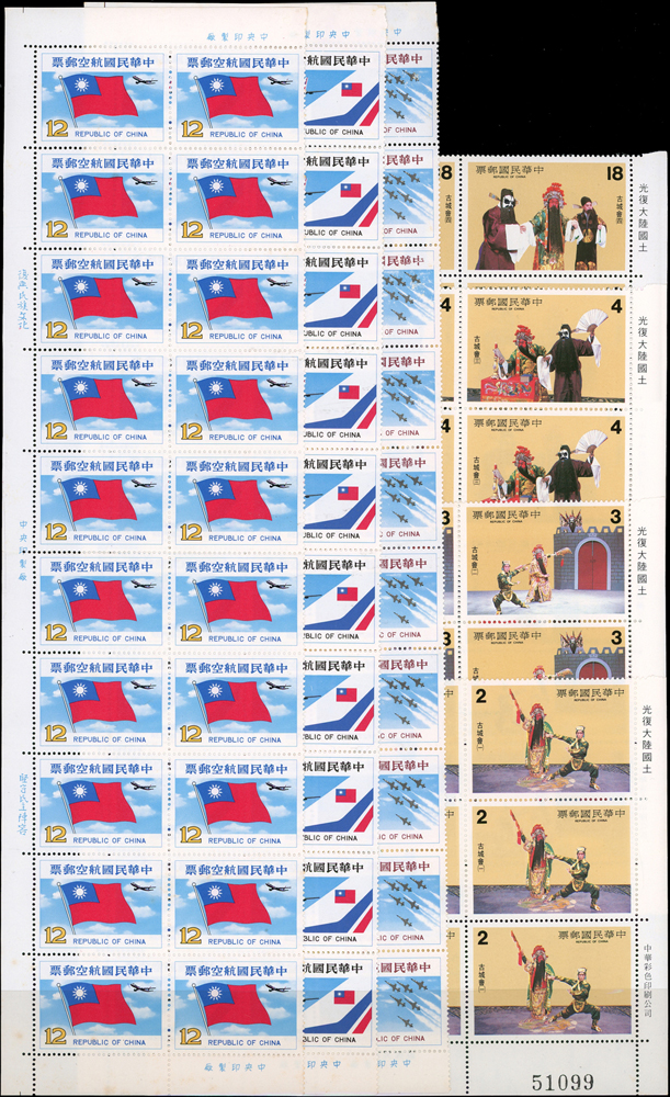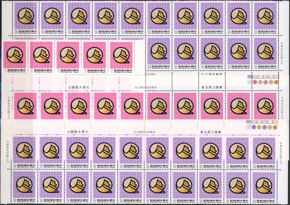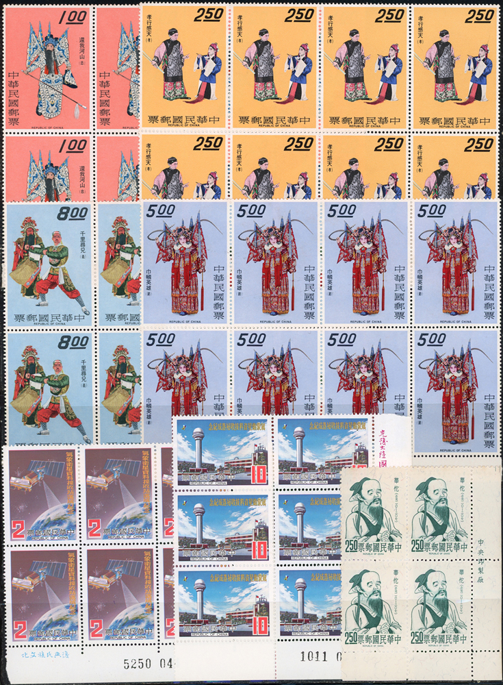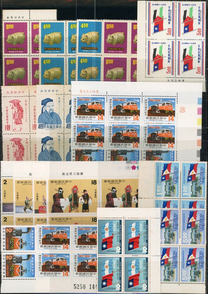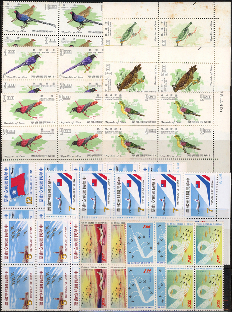 台灣中期新票4方連12組,6方連3組,8方連1組,10方連1組,20方連3組,共144套,包括有:臺灣鳥類(56年版,背局部黏紙).雷虎特技航空.玄奘、朱熹.阿根廷獨立150週年.華陀.一輪豬.嬰戲圖.古城會.中國戲劇.二輪狗(背局部沾黏).航空(69年版).鐵路百週年等,品像混合或有重複,多數背淡黃或黃斑,VF-F