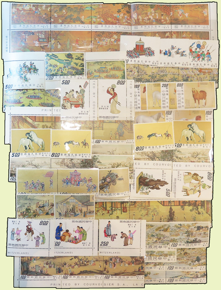 故宮古畫新票11套,包括有:清明上河圖(連刷票撕開).春市圖.漢宮春曉圖(上)(下)輯.出警圖.入蹕圖.駿馬圖.百子圖.清明上河圖特寫各1套,百駿圖2套(連刷票皺痕),均原膠連刷票齒摺,除註明外,皆有齒緣淡黃或局部淡黃,F-VF