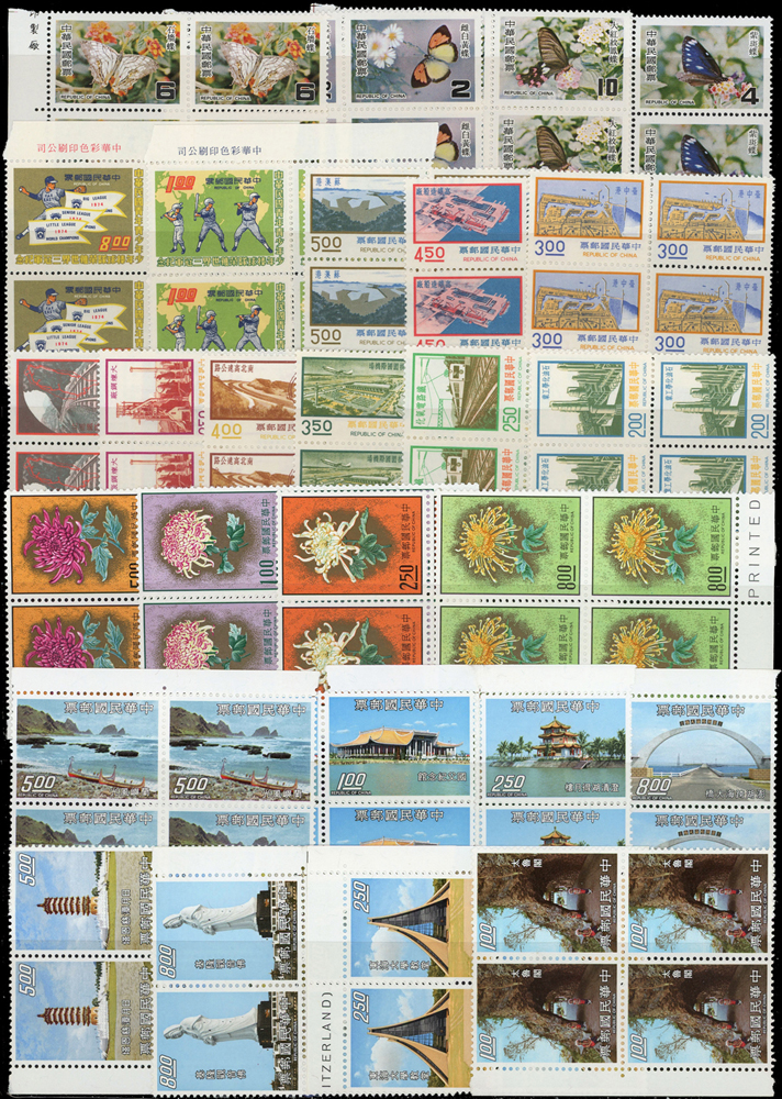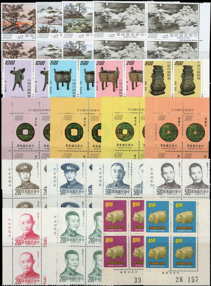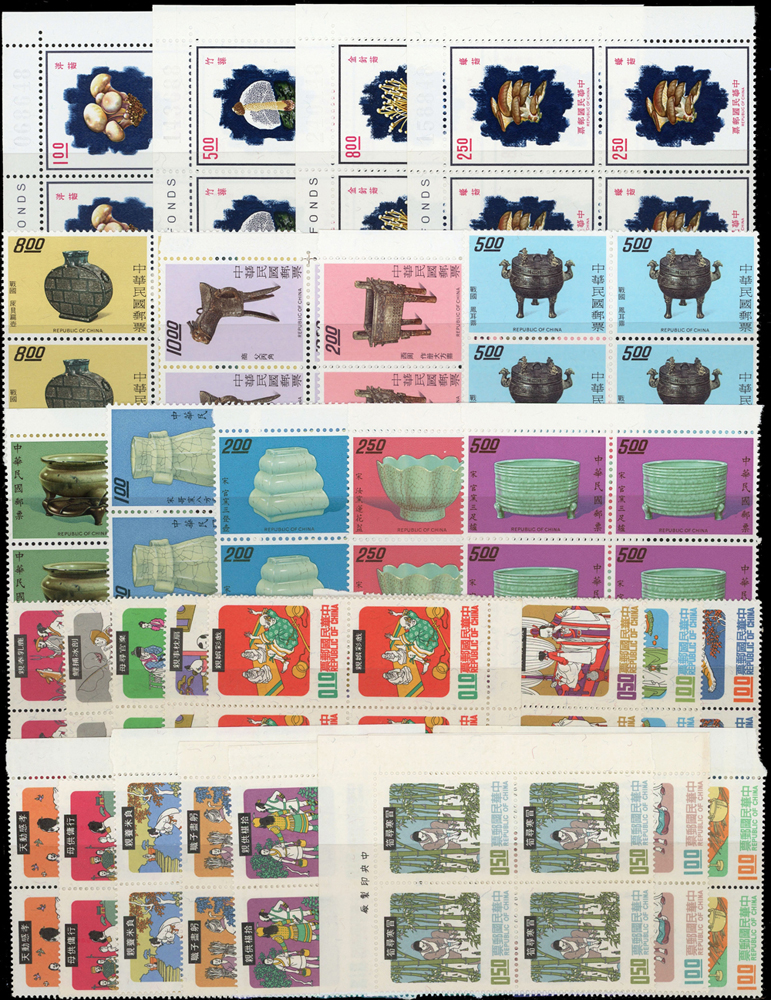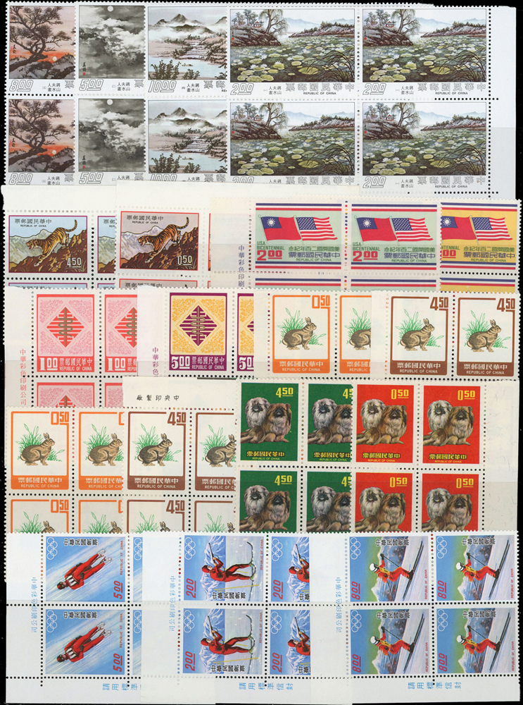 台灣中期新票4方連30組,共120套,均帶邊紙或雙邊紙,部分兼帶廠銘或張號,重點內容包括有:一輪狗.豬,蔣夫人山水畫(一).(二),古代錢幣(64.65年版),古代銅器(64.65年版),宋瓷,花卉(63年版),食用菇類,抗日英烈,九項建設等,品像混合或有重複,多數保存佳,VF-F,歡迎至官網瀏覽全貌