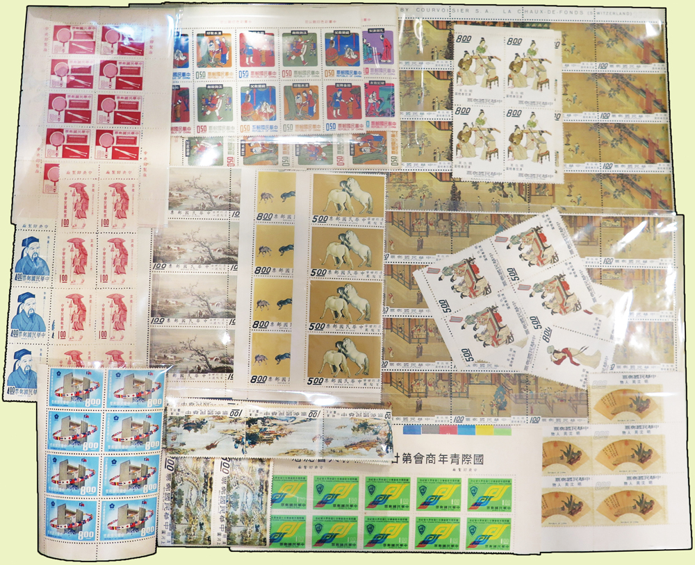 台灣新票64套,包括:百駿圖4方連,漢宮春曉(上)(下)輯各4方連,玄奘、朱熹8方連,日本萬國博覽會8方連,國際青年商會第廿七屆世界大會10方連,扇面古畫(一)5方連,集郵(61年版)10方連,清明上河圖2套,中國民間故事(63年版)5方連及4方連,品像混合,連刷齒折,部分背淡黃或齒黃,F-VF,歡迎至官網瀏覽全貌