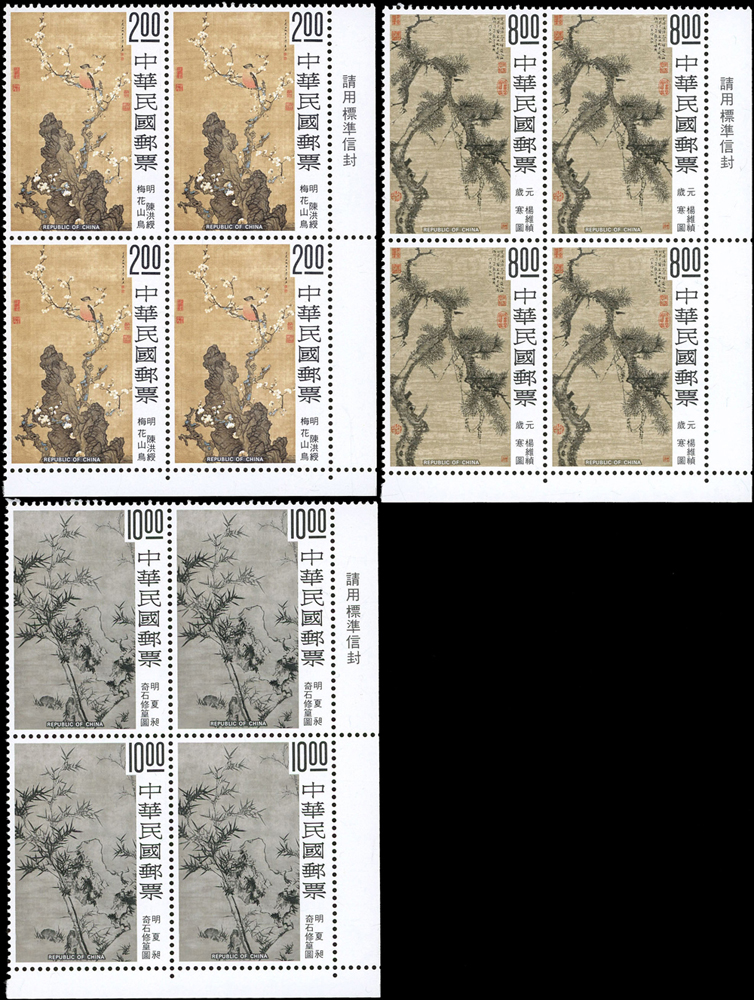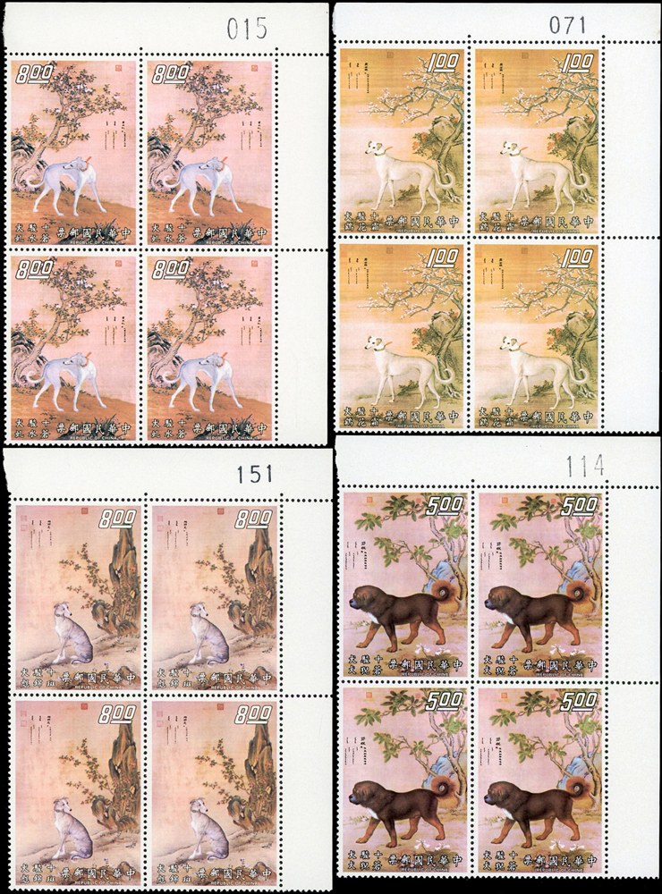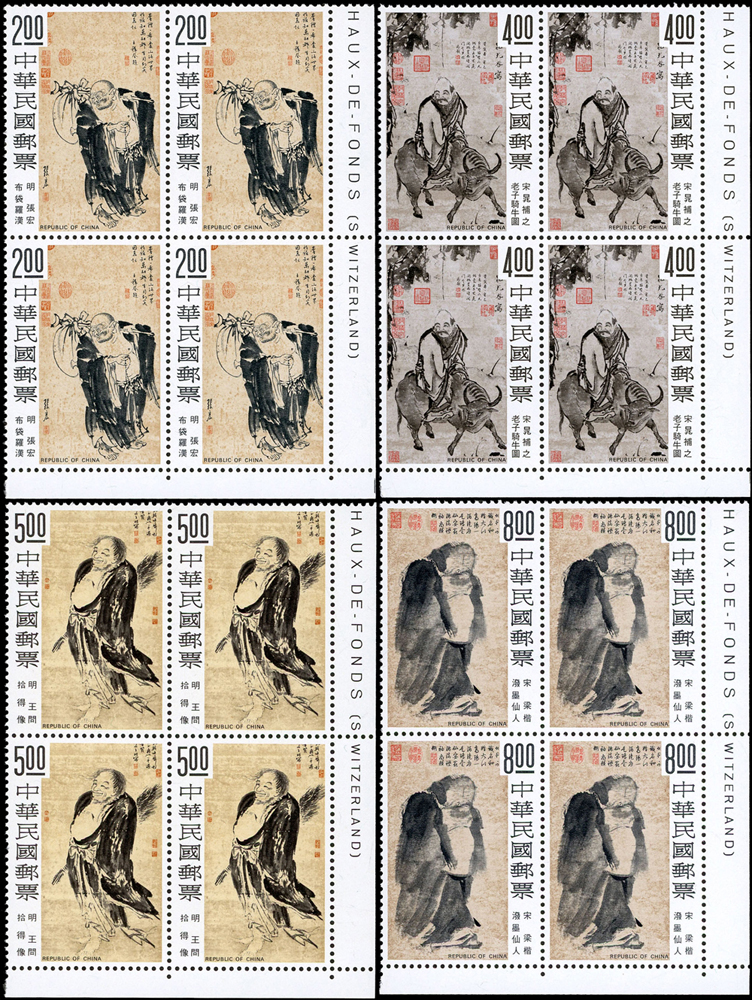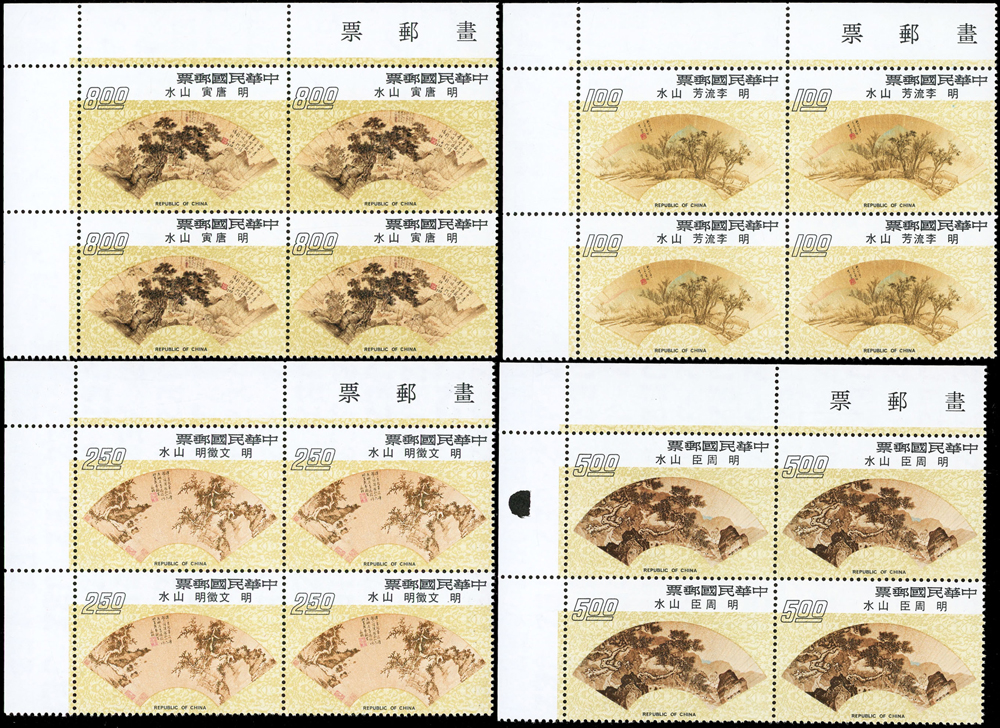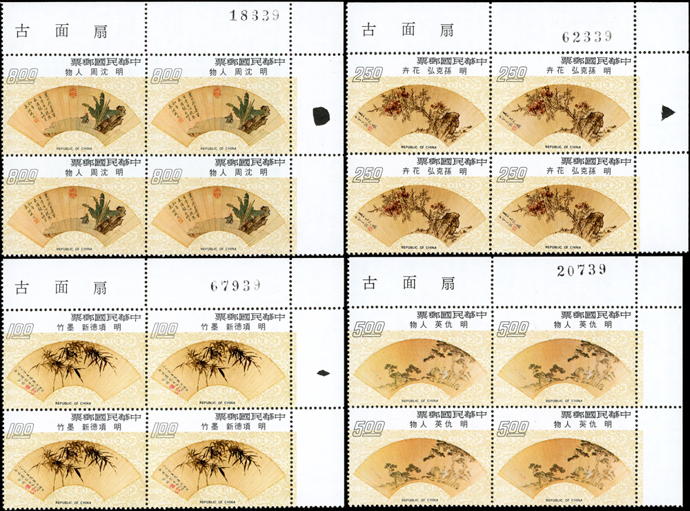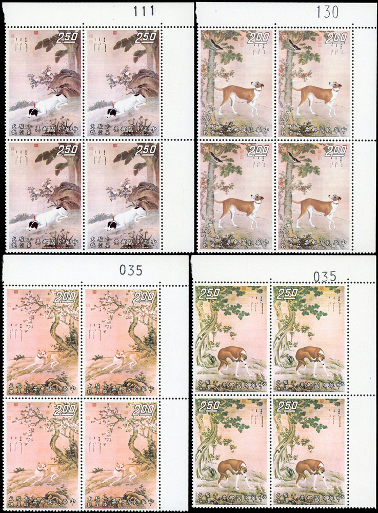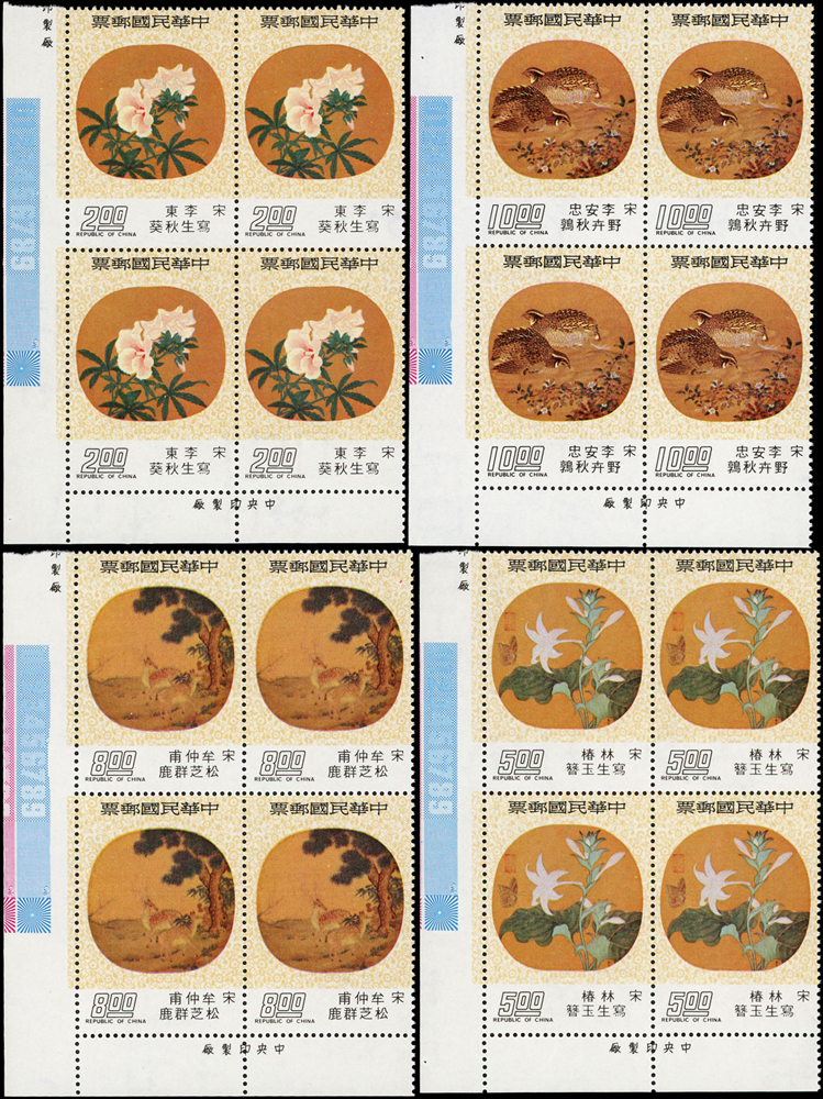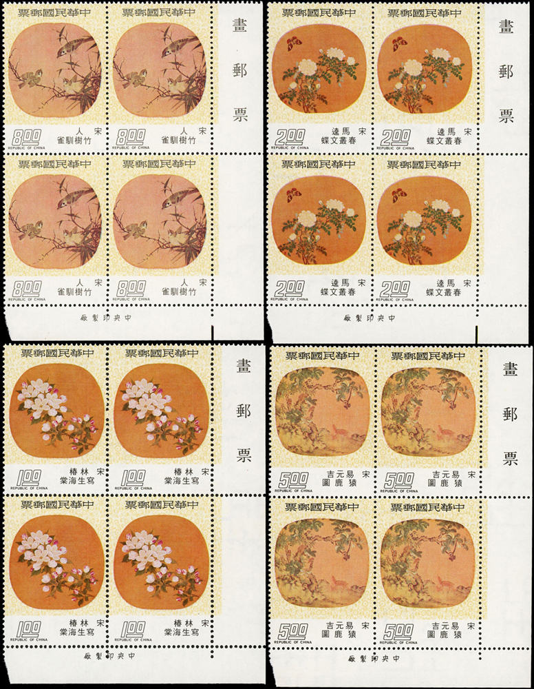 故宮古畫4方連新票7組,共28套,均帶雙邊紙,部分兼帶廠銘或張號,包括有:十駿犬(帶同位右上角雙邊紙張號).人物圖.歲寒三友.扇面古畫(一).(三).(四).(五)輯,均原膠無黃斑,其中十駿犬些許原紙壓痕,其餘VF